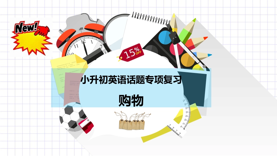 2018小升初英语话题专项复习购物shoeshoesssocksockssananumbrellaumbrellaafanablueskirtCanIhelpyou?CanIhelpyou?I’dlike….I’dlike….HowmuchHowmuchisitisit??HowmuchHowmucharetheyarethey??It’sIt’s…yuan.…yuan.TheyareTheyare…yuan.…yuan.Let’stalkfiftyfortythirtytwentytwenty-eight购物——以服装为例I.表达购物意愿II.表达颜色尺寸III.试穿IV.询问价格购物完成您想买点什么?CanIhelpyou?WhatcanIdoforyou?售货员(salesperson)1.我只是随便看看。I’mjustlooking.—I.表达购物意愿2.我想买…。I’mlookingfor+商品.I’dlike+商品.Iwanttobuy+商品.3.您这儿有卖…的吗?Doyouhaveany+商品?一双鞋一双鞋一双运动鞋一双运动鞋一双凉鞋一双凉鞋一些裙子一些裙子一些裤子一些裤子一些衬衫一些衬衫一些外衣一些外衣一些毛衣一些毛衣一些西服一些西服—I.表达购物意愿apairofapairofshoesshoesapairofapairofsneakerssneakersapairofapairofsandalssandalssomesomedressesdressessomesomepantspantssomesomeshirtsshirtssomesomecoatscoatssomesomesweaterssweaterssomesomesuitssuits对不起,我们这儿没有。Sorry,wehaven’t.对不起,我们这儿只有……Sorry,weonlyhave+其他商品.售货员(salesperson)看看这些。Lookattheseones.您要什么颜色?Whatcolordoyouwant?您要多大号?Whatsizedoyouwant?售货员(salesperson)我喜欢…色。Ilike+颜色.我穿…号。Itakesize+码号.38/42S/M/L/XLsmall/medium/largeblueblueblackblackyellowyellowpurplepurplepinkpinkwhitewhitegreengreengraygrayredred—II.表达颜色尺寸这件行吗?Willthisonebealright/OK?看上去挺不错的。Itlooksverynice.售货员(salesperson)我能试一下吗?CanItryiton?试衣间在哪儿?Where’sthefittingroom?有镜子吗?Itthereamirror?—III.试穿不太合身。Itdoesn’tfit.太短/紧/长/小/大了。It’stooshort/tight/long/small/big.—III.试穿多少钱?Howmuchisit?太贵了。It’stooexpensive.不太贵。That’sreasonable.我买一件。I’lltakeone.—IV.询问价格购物完成三、选出不同类的单词。()1.A.fiveB.nineC.fanD.thirty()2.A.yourB.himC.myD.our()3.A.theseB.heC.ID.you()4.A.twentyB.thirtyC.fortyD.for()5.A.fanB.helpC.umbrellaD.sockCBADB五、英汉互译。1.多少钱2.我的袜子3.一条蓝色的短裙4.五元5.yellowshoes6.onlyone7.clothesshop8.trythemonhowmuchmysocksablueskirtfiveyuan黄色的鞋子只有一个服装店试穿它们四、根据情景选择正确的选项。()1.你想买一些袜子,你应说:A.I’dlikesomeshoes.B.I’dlikesomesocks.()2.你想夸别人的鞋子很漂亮,你可以说:A.Yourshoesarenice.B.Ilikeshoes.()3.老师夸你事情做得好,老师会说:A.Thankyou.B.Welldone.BA()45()5BAB三、根据汉语提示补全句子。1.CanI(帮助)you?2.I’dlikethese(鞋子).3.They’re(四十)yuan.4.Wehavemanyred(袜子).5.Ihave(五十)crayons.helpshoesfortysocksfifty四、给下列句子选择相应的答语。()1.CanIhelpyou?()2.Howbeautiful!()3.Howmanyflowerswouldyoulike?()4.Howmuchisthisfan?()5.Lookatmyumbrella.A.Forty-four,please.B.Hownice!C.Yes.I’dlikesomenoodles.D.Twenty-twoyuan.E.Thankyou.CEADB三、给下列句子选择相应的答语。()1.Howareyou?A.It’sthirtyyuan.()2.Howmuchistheskirt?B.Fifty.()3.Howmanypens?C.I’mhungry.()4.Howmucharetheapples?D.Welldone.()5.Wehavetwentyyuan,MissLi.E.Theyarenineteenyuan.()6.Whatwouldyoulike?F.No,itisn’t.()7.Whereismywhitecap?G.I’dlikeahamburger.()8.Ismybaginyourbedroom?H.It’sinthekitchen.CABEDGHF七、选择合适的选项补全对话。A:1.B:Yes.I’dlikeaT-shirtformyson(儿子).A:Whataboutthisblueone?B:Nice.2.A:It’sninety(九十)yuan.B:It’stooexpensive(太贵).A:3.B:Howmuchisit?A:4.B:Allright.5.I’lltake(买)it.CAEBDA.Howmuchisit?B.Fiftyyuan.C.CanIhelpyou?D.Mysonlikesgreen.E.Lookatthegreenone.单项选择。()1.—CanIhelpyou?—A.Yes.I’dliketheseshoes.B.Ihav...