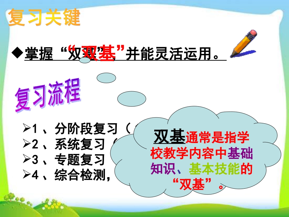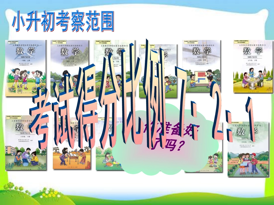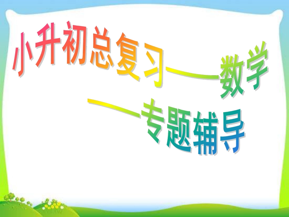 你准备好了吗?掌握“双基”,并能灵活运用。1、分阶段复习(10大专题)2、系统复习(24课时)3、专题复习(12课时)4、综合检测,查缺补漏“双基”双基通常是指学校教学内容中基础知识、基本技能的“双基”。数的认识数的运算代数的初步认识应用题量的计算几何的初步认识简单的统计式与方程整数和小数分数和整分数数的整除(一)整数(1)整数的意义:像1,2,3,0,-1,-2,-3…这样的数叫整数。(2)数物体的时候,用来表示物体个数的1,2,3…叫做自然数(3)一个物体也没有用0来表示。(4)0既是自然数也是整数。自然数,0,整数但不能说整数只包括0和自然数。(1)一(个)、十、百、千、万、十万、百万、千万、亿……都是计数单位。(2)每相邻两个计数单位之间的进率都是10。这样的计数法叫做十进制计数法。十进位计数法(1)读法:从高位到低位,一级一级地读,每一级末尾的0都不读出来,其他数位连续几个0都只读一个零。(2)写法:从高位到低位,一级一级地写,哪一个数位上一个单位没有,就在那个数位上写0。整数的读法和写法数的改写1.把多位数改写成“万”、“亿”(考点)直接改写:先把原数小数点向左移动4位或8位(小数部分的末尾是0要划掉),然后再加万或亿,中间要用“=”连接。省略尾数改写成近似数:用“四舍五入法”省略万位或亿位后面的尾数,再在数的后面加万或亿,得出的是近似数,中间要用“≈”连接。2.求小数近似数。根据要求,把小数保留到哪一位,就把这一位后面的尾数按照“四舍五入法”省略,如1.5≈2,1.4≈1。中间要用“≈”号。数的比较整数大小比较20002001小数大小比较2.112.1111分数大小比较<>103305>小数基本性质:小数末尾添上0或去掉0,小数的大小不变,但计数单位变了。而且,小数点向左移动一位、两位、三位,原来的数就缩小10倍、100倍、1000倍,小数点向右移动一位、两位、三位,原来的数就扩大10倍、100倍、1000倍…写法:整数部分写在小数点前,小数部分写在小数点后,中间用小数点隔开。读法:例如:0.38读作百分之三十八或0.45读作零点四五…0.54整数部分小数点小数部分小数的分类小数有限小数无限小数无限循环小数无限不循环小数纯循环小数混循环小数纯小数混小数1.22+3.44=3.13-4.55=2+1.2=5.44-3.44+12=3.4×5-2=2.44÷2-1=4.5-6+3=分数21分母分数线分子意义:把单位“1”平均分成若干份,表示这样的一份或几份的数叫分数。分类真分数假分数带分数小练习733÷7=()95表示:把单位“1”平均分成9份,取其中的5份。计算时注意约分!!!一、分数的加减673121107542134125128百分数意义:表示一个数是另一个数的百分之几的数,叫做百分数。百分数也叫做百分率或百分比。小数、分数、百分数的互化把小数化成百分数,只要把小数点向右移动两位,同时在后面添上百分号。其实,把小数化成百分数,只要把这个小数乘以100%。把百分数化成小数,只要把百分号去掉,同时把小数点向左移动两位。把分数化成百分数,通常先把分数化成小数(除不尽时,通常保留三位小数),再把小数化成百分数。其实,把分数化成百分数,要先把分数化成小数后,再乘以100%。把百分数化成分数,先把百分数改写成分数,能约分的要约成最简分数。数的整除1、整除与除尽2、约数和倍数3、能被2.3.5整除的数的特征4、奇数和偶数5、质数和合数6、质因数和分解质因数7、最大公约数和最小公倍数整数a除以整数b(b≠0),除得的商是整数而没有余数,我们就说a能被b整除,或者说b能整除a。如果数a能被数b(b≠0)整除,a就叫做b的倍数,b就叫做a的约数(或a的因数)。倍数和约数是相互依存的。数的运算内容分数计算小数计算方程计算比例计算整数计算(简便运算)各占2道,满分20分代数的初步认识方程正比例反比例简易方程例如:x+1=3解得:x=2例如:y=kx例如:y=xk小练习1.解方程。2x-1=53+5x=13X=3X=2小练习一、解方程4x-5=17-x3x-6=93x+5=2xx=2.4x=5x=-5二、简便运算几何的初步认识线角30°平面图形立体图形角90°30°150°180°360°直角钝角锐角平角周角四边形基础小练习—图形一、根据给出的数...