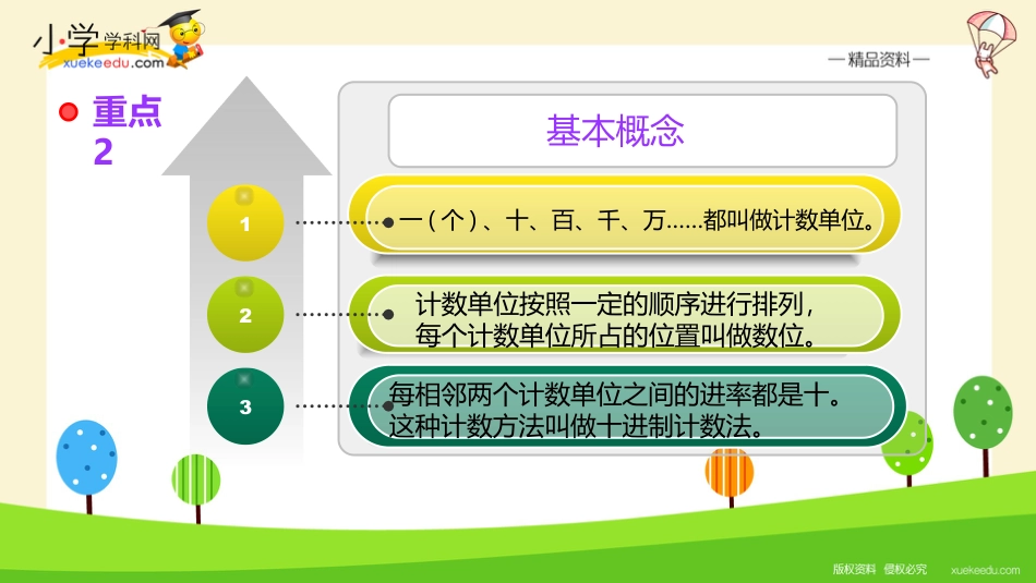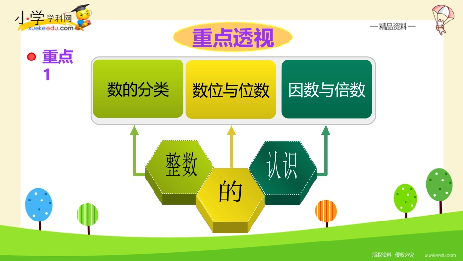 第一整节数重点透视重点1数的分类数位与位数因数与倍数重点2321基本概念一(个)、十、百、千、万……都叫做计数单位。计数单位按照一定的顺序进行排列,每个计数单位所占的位置叫做数位。每相邻两个计数单位之间的进率都是十。这种计数方法叫做十进制计数法。数位顺序表整数部分个级万级亿级…个位百位一个十百千万位万十万位百万位千万位十万百万千万千位亿位十亿位百亿位千亿位亿十亿百亿千亿数位计数单位……十位重点3重点4整除整数a除以整数b(b不等于0),除得的商是整数而没有余数,就说数a能被数b整除,或者b能整除a。如果数a能被数b整除,我们就说a是b的倍数。如果数a能被数b整除,我们就说b是a的因数。倍数:因数:自然数整除能被2、3、5整除的数的特征奇数偶数因数倍数公因数最大公因数公倍数最小公倍数重点5源题解析题13、4、5的最小公倍数是60,因此试着用42200(因为要求最小)除以6042200÷60=70320‥‥‥42200-40=4216060-20=40一个五位数422ab能被3、4、5整除,那么这个五位数最小是()42160有数2AAA4能被9整除,那么A的可能值有()个。根据能被9整除的数的特征,可以知道各数位上的数的和能被9整除,那么这个数就能被9整除。2+4=66再加3就是9的倍数了,也就是3个A的和是3。3÷3=1后面每个A增加3,和就增加9,因此A就有可能是1+3=44+3=73A可以是1、4、7。题2一筐梨,3个3个的数余1个,5个5个数余3个,7个7个数余5个。这筐梨最少有多少个?易错1易错点拨错解解析:3、5、7的最小公倍数是105,所以,这筐梨最少有105个。3个3个的数少2个,5个5个的数少2个,7个7个的数少2个。所以应该是:3、5、7的最小公倍数是105加2等于107易错2不能化成有限小数。()287错解解析28=2×2×7,质因数有2和5以外的数,所以不能化成有限小数最简分数的分母分解质因数,质因素只有2或者5的分数,可以化成有限小数,4=2×2.41287×整数分数(或小数)正整数0负整数自然数数的分类归纳总结整除因数倍数质数合数1互质数因数个数不同公因数只有1个数