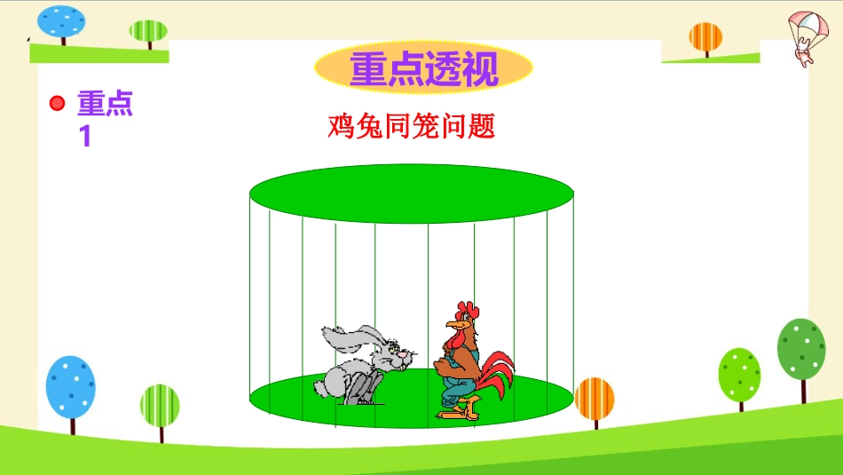 同鸡兔笼重点透视重点1鸡兔同笼问题先求兔数(总脚数—每只鸡的脚数×总头数)÷(每只兔的脚数—每只鸡的脚数)先求鸡数(每只兔的脚数×总头数—总脚数)÷(每只兔的脚数—每只鸡的脚数)鸡兔同笼问题上有八头,下有二十六足,问雉兔各几何?今有雉兔同笼源题解析鸡兔同笼,从上面数有8个头,从下面数有26只足。鸡兔各有多少只?2×8=16(只足)把8个头都看作鸡来计算26—16=10(只足)4—2=2(只足)10÷2=5(只)兔的数量8—5=3(只)鸡的数量检验:3×2+5×4=26(只)题1把8个头都看作兔来计算4×8=32(只足)32—26=6(只足)4—2=2(只足)6÷2=3(只)鸡的只数8—3=5(只)兔的只数换种方法鸡兔同笼,从上面数有8个头,从下面数有26只足。鸡兔各有多少只?50×3-115=35(棵)如果都按照男生来考虑比栽树总棵树多了35棵35÷(3-2)=35(人)用多的棵树除以每个男同学比每个女同学多的栽的就是女生人数男生:50-35=15(人)五年级50名同学总共植树115棵,男生每人载3棵,女生每人载2棵,问几名男生,几名女生?解析:题2应该有脚:2×8=16(只)多出的脚:26-16=10(只)10÷2=5(只)8-5=3(只)错解鸡:兔子:假设笼子里全是鸡笼子里有若干只鸡和兔。从上面数,有8个头,从下面数,有26只脚。鸡和兔各有几只?易错点拨应该有脚:2×8=16(只)多出的脚:26-16=10(只)10÷2=5(只)8-5=3(只)答:鸡有3只,兔有5只。兔子:鸡:假设笼子里全是鸡笼子里有若干只鸡和兔。从上面数,有8个头,从下面数,有26只脚。鸡和兔各有几只?正确的解1432鸡兔同笼脚的总数多出的脚数脚少的动物数脚多的动物数归纳总结