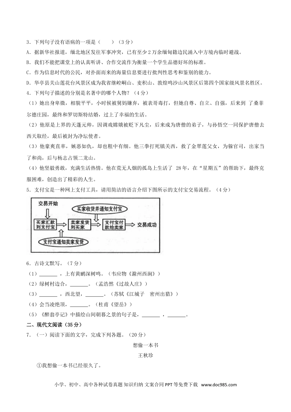 2017年甘肃省中考语文试题及答案一、语言积累与运用(30分)1.选择你喜欢的两幅作品,把正文内容用简化楷书写在田字格内。(3分)2.阅读下面的文字,完成(1)﹣(3)题。(9分)沧桑数千载,磨练百代人。中国书法用它那的甲骨文、沉雄的篆书、典雅的隶书、的楷书、的行书、的草书,陶治了东方,熏陶了世界,为人类文明作出贡献,为炎黄子孙赢得荣光,它是华夏文化的瑰宝,世界艺术的奇葩。学习中国书法,就要揣摩那纵横万象的点画,推敲那千恣百态的结构,探索那疏密相称的布局,体会那提按顿挫的律动,膜拜那揖让开合的神思,迷恋那诗词曲赋的意韵﹣﹣让音乐的节奏、舞蹈的逢望、数学的比例、力学的原理、平面的构成……都造化在一起,交相辉应,灵光四射,那该是何等动人的画面啊!(节选自《少儿书法艺术自修汇编》)(1)依次给文中加点字注音,全都正确的一项是A.huáibācuōyùnB.guīpācuòyùnC.huáipācùoyòngD.guībācūoyòng(2)文中画线词语书写全都正确的一组是A.沧桑陶治灵光四射B.陶治揣摩交相辉应C.揣摩膜拜诗词曲赋D.膜拜造型千恣百态(3)在文中空白处依次填上正确的修饰语,最恰当的一项是A.潇洒狂飞古朴端庄B.古朴狂飞端庄潇洒C.狂飞潇洒端庄古朴D.古朴端庄潇洒狂飞。小学、初中、高中各种试卷真题知识归纳文案合同PPT等免费下载www.doc985.com3.下列句子没有语病的一项是()(3分)A.据新华社报道,缅北地区发往军事冲突,已有至少2万余缅甸籍边民涌入中方境内临时避战。B.我们不能把课堂上的认真听讲、合作交流作为衡量一个学生品德好坏的标准。C.作为信息时代的公民,对扑面而来的海量信息要进行批判性思考和鉴别的能力。D.华亭县关山莲花台风景区成为我省继崆峒山、麦积山、敦煌鸣沙山风景区后第四个国家级风景名胜区。4.下列句子描述的分别是名著中的哪个人物?(4分)(1)她出身卑微,相貌平平,小时候被舅妈嫌弃,被表哥毒打,但她自尊、自立、自强,后来到了桑菲尔德庄园,最终和罗切斯特结婚,过上了幸福的生活。(2)他原是上界的天蓬元帅,因调戏嫦娥被贬下凡尘,后来成为唐僧的弟子,与孙悟空一同保护唐僧去西天取经,最后被封为净坛使者。(3)他豪爽直率,嫉恶如仇,却也粗中有细。他三拳打死镇关西,救了金翠莲父女,为躲官司,出家当了和尚,后与杨志占领二龙山。(4)他坚毅勇敢,充满生活热情。他在荒无人烟的孤岛上生活了28年,在“星期五”的帮助下,最终克服困难,创造出了精彩的人生。5.支付宝是一种网上支付工具,请用简洁的语言介绍下图所示的支付宝交易流程。(4分)6.古诗文默写。(7分)(1),上有黄鹂深树鸣。(韦应物《滁州西涧》)(2)绿树村边合,。(孟浩然《过故人庄》)(3),西北望,。(苏轼《江城子密州出猎》)(4)会当凌绝顶,。(杜甫《望岳》)(5)《醉翁亭记》中描绘山间朝暮之景的句子是,,。二、现代文阅读(35分)7.(一)阅读下面的文字,完成下列各题。(20分)想偷一本书王秋珍①我想偷一本书已经很久了。小学、初中、高中各种试卷真题知识归纳文案合同PPT等免费下载www.doc985.com②它就放在我们办公室一位同事的桌上。每天,我都能看见它。那天蓝色的封面要多好看就有多好看。可是,它寂寞地呆在桌上,似乎从来没人去翻一翻。③有一次,我看见同事拿起了它。我正暗暗为它高兴,却分明看见我的这位漂亮的女同事,只是用书扫了扫椅子上的灰尘。别的同事走过来走过去,总是低着头忙忙碌碌。那个叫手机的玩意成了大家的最爱。谁会来留意一本书呢?④慢慢的,我看见灰尘把书的封面由蓝色变成了灰色。我还看见有好几次,漂亮的女同事把刚盛了水的杯子搁在它的上面。书的封面留下了一个圆圈,还带着褶皱,好像一个可怜的孩子歪着嘴巴在哭泣。⑤我只想把它偷回家。⑥可是,一想到偷,我的心就像要跳出胸膛。从小,爸爸就教育我,别人的东西不能拿,偷大偷小都是贼。因此,我一天天地看着它,看着办公室来来往往的同事,却一直不敢给自己创造一个机会。⑦可机会还是来了。⑧那天,我打了一段文字抬起头,蓦然发现办公室里居然只有我一人。我按捺住狂跳的心,悄然起身,来到...