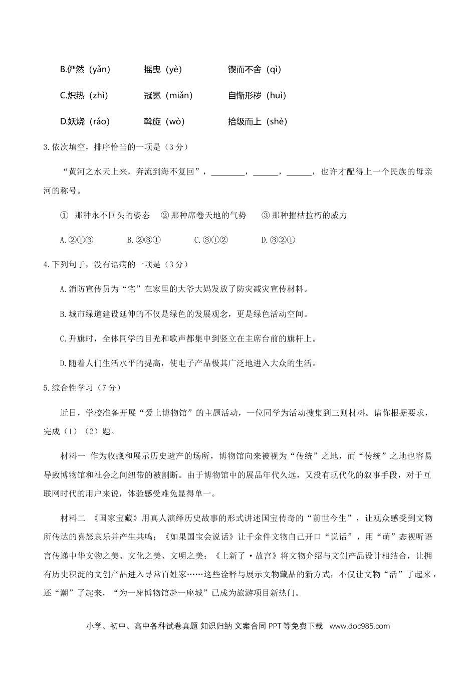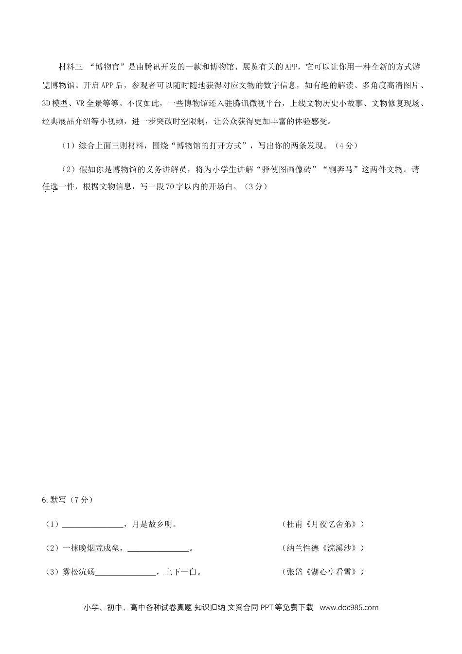 2019年甘肃省兰州市中考语文真题及答案一、基础·运用(30分)1.阅读下面语段,完成(1)~(3)题。(7分)一种符号,万千个方块,数千年发展,叙述过太平盛世,描绘过烽火战争,传承着中华文化,傲视着世界文明——这就是汉字。汉字有着与西方文字迥然不同的特点,它是祖先灵性的,是构筑中华文化的,是中国精神文明的。汉字是形、音、义“三位一体”的精巧符号,创生至今,不管语音如何变化,结构都基本稳定。作为记录中华文化的载体,汉字是我们更好地了解祖先的有力媒介。不仅如此,汉字还是充满活力的文字系统,它经历了甲骨文、金文、篆书、隶书、楷书等各种字体的发展,在书写材料上也不断演变,即便到了计算机时代,依然不惧挑战、焕发出新的活力,是中华文化勇于变革、积极进取精神的缩影。(1)依次填入横线处的词语,恰当的一组是(2分)A.结晶旗帜核心B.旗帜核心结晶C.结晶核心旗帜D.核心结晶旗帜(2)下列对语段中加点词和画波浪线处的解说,不正确的一项是(3分)A.“不断演变”“积极进取”这两个短语的结构类型相同。B.“不管语音如何变化,结构都基本稳定。”这是个假设关系的复句。C.“汉字是我们更好地了解祖先的有力媒介”一句的主干是“汉字是媒介”。D.“即便到了计算机时代,依然不惧挑战、焕发出新的活力”中顿号的使用是错误的。(3)请任选一种字体临写下面的文字。(2分)2.下列加点字的注音,完全正确的一项是(3分)A.譬如(bì)狭隘(ài)怪诞不经(dàn)小学、初中、高中各种试卷真题知识归纳文案合同PPT等免费下载www.doc985.comB.俨然(yǎn)摇曳(yè)锲而不舍(qì)C.炽热(zhì)冠冕(miǎn)自惭形秽(huì)D.妖烧(ráo)斡旋(wò)拾级而上(shè)3.依次填空,排序恰当的一项是(3分)“黄河之水天上来,奔流到海不复回”,,,,也许才配得上一个民族的母亲河的称号。①那种永不回头的姿态②那种席卷天地的气势③那种摧枯拉朽的威力A.②①③B.②③①C.③①②D.③②①4.下列句子,没有语病的一项是(3分)A.消防宣传员为“宅”在家里的大爷大妈发放了防灾减灾宣传材料。B.城市绿道建设延伸的不仅是绿色的发展观念,更是绿色活动空间。C.升旗时,全体同学的目光和歌声都集中到竖立在主席台前的旗杆上。D.随着人们生活水平的提高,使电子产品极其广泛地进入大众的生活。5.综合性学习(7分)近日,学校准备开展“爱上博物馆”的主题活动,一位同学为活动搜集到三则材料。请你根据要求,完成(1)(2)题。材料一作为收藏和展示历史遗产的场所,博物馆向来被视为“传统”之地,而“传统”之地也容易导致博物馆和社会之间纽带的被割断。由于博物馆中的展品年代久远,又没有现代化的叙事手段,对于互联网时代的用户来说,体验感受难免显得单一。材料二《国家宝藏》用真人演绎历史故事的形式讲述国宝传奇的“前世今生”,让观众感受到文物所传达的喜怒哀乐并产生共鸣;《如果国宝会说话》让千余件文物自己开口“说话”,用“萌”态视听语言传递中华文物之美、文化之美、文明之美;《上新了·故宫》将文物介绍与文创产品设计相结合,让拥有历史积淀的文创产品进入寻常百姓家……这些诠释与展示文物藏品的新方式,不仅让文物“活”了起来,还“潮”了起来,“为一座博物馆赴一座城”已成为旅游项目新热门。小学、初中、高中各种试卷真题知识归纳文案合同PPT等免费下载www.doc985.com材料三“博物官”是由腾讯开发的一款和博物馆、展览有关的APP,它可以让你用一种全新的方式游览博物馆。开启APP后,参观者可以随时随地获得对应文物的数字信息,如有趣的解读、多角度高清图片、3D模型、VR全景等等。不仅如此,一些博物馆还入驻腾讯微视平台,上线文物历史小故事、文物修复现场、经典展品介绍等小视频,进一步突破时空限制,让公众获得更加丰富的体验感受。(1)综合上面三则材料,围绕“博物馆的打开方式”,写出你的两条发现。(4分)(2)假如你是博物馆的义务讲解员,将为小学生讲解“驿使图画像砖”“铜奔马”这两件文物。请任选一件,根据文物信息,写一段70字以内的开场白。(3分)6.默写(7分)(1),月是故乡明。(杜甫《月夜忆...