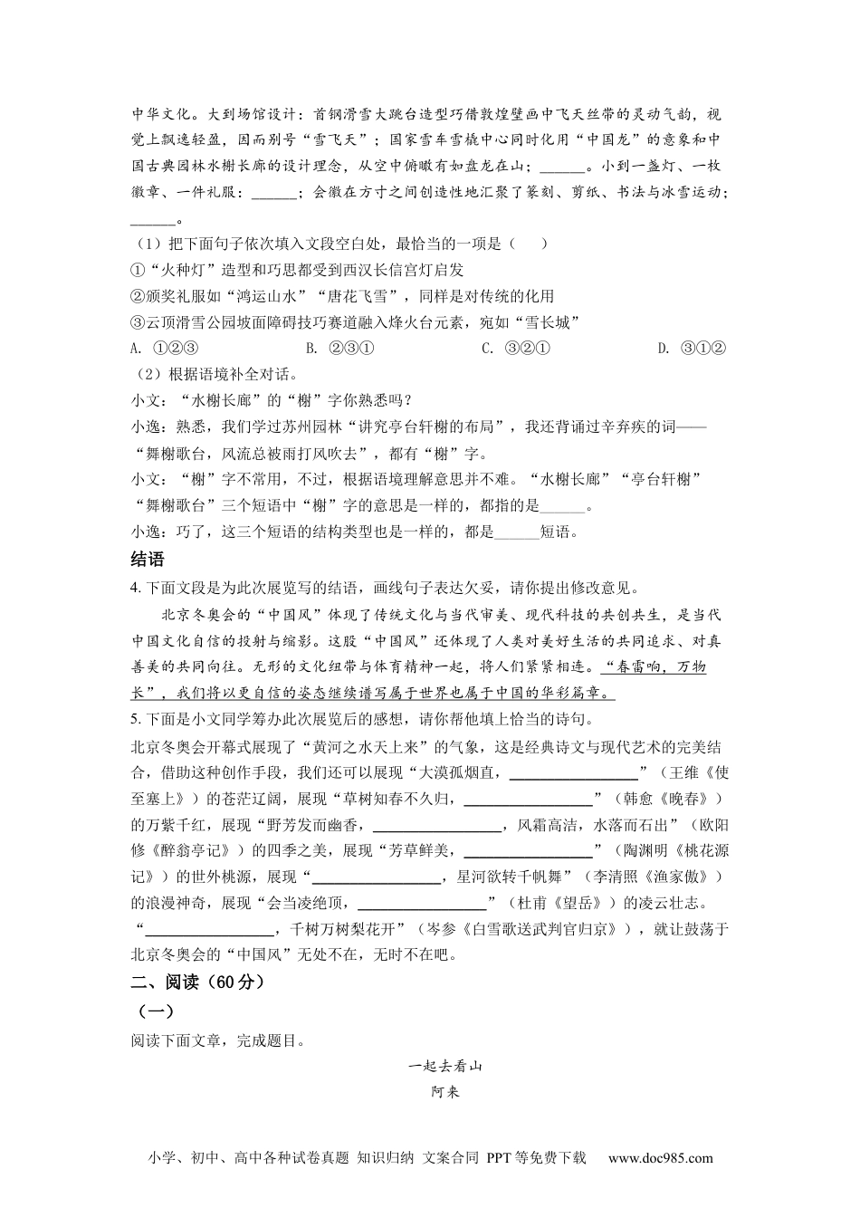 小学、初中、高中各种试卷真题知识归纳文案合同PPT等免费下载www.doc985.com武威市2022年初中毕业、高中招生考试语文试卷考生注意:本试卷满分为150分,考试时间为150分钟。所有试题均在答题卡上作答,否则无效。一、积累与运用(30分)北京冬奥,惊艳全球。学校开展以“自信中国风,一起向未来”为主题的展览活动,请你完成下列任务。◆展板一:浪漫奥运1.下面是展板一的文字内容,阅读并完成题目。万众瞩目的北京冬奥会开幕式,以“中国式浪漫”唱响“一起向未来”的宣言;欢乐相聚的闭幕式,大家在五环旗下依依惜别,“天下一家”的浪漫烟花、寓意共建人类命运共同体的中国结,让多少人内心的企盼得到共鸣和回响。多少人也由此领略中国传统二十四节气的智慧、“黄河之水天上来”的气象、“渡头杨柳青青,枝枝叶叶离情”的深情,感受当代中国的自信从容和______生机。“雪如意”“雪游龙”“雪长城”,见证运动员汗水与激情的比赛场馆,则是将科技、运动与中华优秀传统文化______的具象载体。火种灯会徽体育图标颁奖礼服北京冬奥会视觉呈现的中国风几乎无处不在。(1)请你将本次活动的主题“自信中国风,一起向未来”工整地写在下面田字格中。(2)上面语段中加点字的注音和横线处应填入的词语,全都正确的一项是()A.万众瞩目(shǔ)篷勃熔合载体(zài)B.万众瞩目(zhǔ)蓬勃融合载体(zài)C.万众瞩目(zhǔ)篷勃融合载体(zǎi)D.万众瞩目(shǔ)蓬勃熔合载体(zǎi)(3)给画线句加上标点符号,最恰当的一项是()A.火种灯,会徽,体育图标,颁奖礼服——北京冬奥会视觉呈现的“中国风”几乎无处不在。B.火种灯、会徽、体育图标、颁奖礼服——北京冬奥会视觉呈现的《中国风》几乎无处不在。C.火种灯、会徽、体育图标、颁奖礼服……北京冬奥会视觉呈现的“中国风”几乎无处不在。D.火种灯,会徽,体育图标,颁奖礼服……北京冬奥会视觉呈现的《中国风》几乎无处不在。(4)展板上需要配图,字体与示例图片一致的一项是()小学、初中、高中各种试卷真题知识归纳文案合同PPT等免费下载www.doc985.comA.B.C.D.◆展板二:科技奥运2.下面是展板二的文字内容阅读并完成题目。科技正重构舞台艺术呈现,赋予艺术“呈于象,感于目,会于心”的简约美,营造诗化意境。机械舞台移动,可看作山脉涌动;光影交错辉映,可译为日月起落;虚拟视觉成像,可形塑万里山河……科技元素潜藏在视觉语言结构中,为观众创造着美好的视效体验。依托图像处理算法,冬奥会开幕式______人心的“冰瀑”环节中,一滴水墨从天而降______开来,“黄河之天上来”的意境______,唤起人们心底的文化情结。“冰雪五环”环节采用三维水墨动画、裸眼全息水墨动画等手段,以笔墨精神再现冬奥历史,观意取象、气韵相生。(1)根据语境,横线处应填入的词语最恰当的一项是()A.激动渲染跃然纸上B.震荡熏染惟妙惟肖C.震动点染入木三分D.震撼晕染呼之欲出(2)展板两边计划写一副对联。小逸同学已经拟写了上联,请你补出下联。上联:科技助力迎奥运下联:___________________________◆展板三:文化奥运3.下面是展板三的文字内容,阅读并完成题目。在北京冬奥会上,和体育同样具有连接人心,打通人心力量的,是传统与现代交织的小学、初中、高中各种试卷真题知识归纳文案合同PPT等免费下载www.doc985.com中华文化。大到场馆设计:首钢滑雪大跳台造型巧借敦煌壁画中飞天丝带的灵动气韵,视觉上飘逸轻盈,因而别号“雪飞天”;国家雪车雪橇中心同时化用“中国龙”的意象和中国古典园林水榭长廊的设计理念,从空中俯瞰有如盘龙在山;______。小到一盏灯、一枚徽章、一件礼服:______;会徽在方寸之间创造性地汇聚了篆刻、剪纸、书法与冰雪运动;______。(1)把下面句子依次填入文段空白处,最恰当的一项是()①“火种灯”造型和巧思都受到西汉长信宫灯启发②颁奖礼服如“鸿运山水”“唐花飞雪”,同样是对传统的化用③云顶滑雪公园坡面障碍技巧赛道融入烽火台元素,宛如“雪长城”A.①②③B.②③①C.③②①D.③①②(2)根据语境补全对话。小文:“水榭长廊”的“榭”字你熟悉吗?小逸:熟悉,我们学过苏州园...