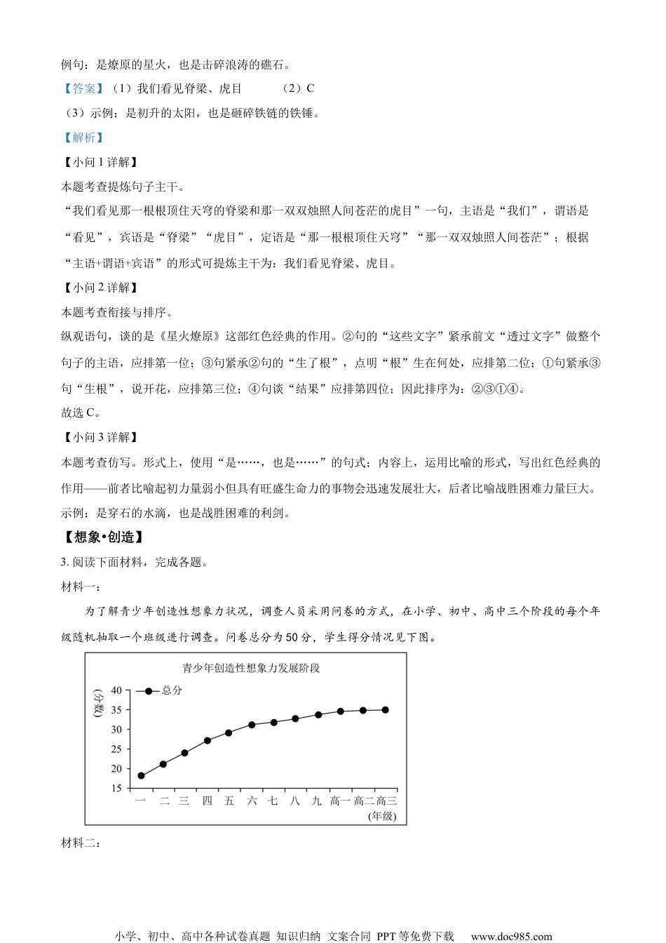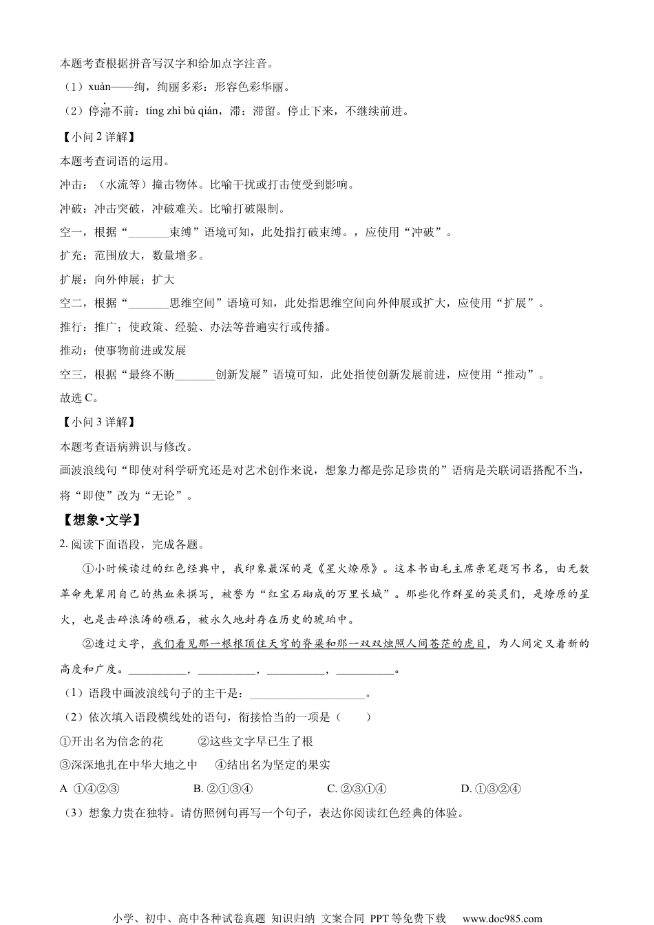 小学、初中、高中各种试卷真题知识归纳文案合同PPT等免费下载www.doc985.com2024年兰州市初中学业水平考试语文注意事项:1.全卷共120分。考试时间120分钟。2.考生必须将姓名、准考证号、考场号、座位号等个人信息填(涂)写在试卷及答题卡上。3.回答选择题时,选出每小题答案后,用铅笔把答题卡上对应题目的答案标号涂黑。如需改动,用橡皮擦干净后,再选涂其它答案标号。回答非选择题时,将答案写在答题卡上,写在本试卷上无效。4.考试结束后,将本试卷和答题卡一并交回.一、基础•运用(24分)班级开展“迷人的想象”主题活动,请你完成下列任务。【想象•知识】1.阅读下面语段,完成各题。①“想象”是一个十分迷人的词汇。这个词汇意味着无拘无束、天马行空和xuàn()丽多彩……即使对科学研究还是对艺术创作来说,想象力都是弥足珍贵的。爱因斯坦说:“想象力比知识更重要,因为知识是有限的,而想象力概括着世界上的一切,推动着进步,并且是知识进化的源泉。”②想象力是知识的一种创新。想象力绝对不会让现有的知识停滞()不前,它是最活跃的、启发性的,是知识最有效的运动,能使知识不断得到更新、进化。在学习知识的过程中,要善于创新思维方式,打破陈规,_________束缚,_________思维空间,通过思考善于去想别人所未想、求别人所未求、做别人所未做的事情,最终不断_________创新发展。(1)根据拼音写汉字,给加点字注音。xuàn()丽多彩停滞()不前(2)依次填入语段横线上的词语,恰当的一项是A.冲击扩充推行B.冲破扩充推行C.冲破扩展推动D.冲击扩展推动(3)语段中画波浪线的句子表达欠妥,请写出修改意见。【答案】(1)①.绚②.zhì(2)C(3)将“即使”改为“无论”。【解析】【小问1详解】小学、初中、高中各种试卷真题知识归纳文案合同PPT等免费下载www.doc985.com本题考查根据拼音写汉字和给加点字注音。(1)xuàn——绚,绚丽多彩:形容色彩华丽。(2)停滞不前:tíngzhìbùqián,滞:滞留。停止下来,不继续前进。【小问2详解】本题考查词语的运用。冲击:(水流等)撞击物体。比喻干扰或打击使受到影响。冲破:冲击突破,冲破难关。比喻打破限制。空一,根据“_______束缚”语境可知,此处指打破束缚。,应使用“冲破”。扩充:范围放大,数量增多。扩展:向外伸展;扩大空二,根据“_______思维空间”语境可知,此处指思维空间向外伸展或扩大,应使用“扩展”。推行:推广;使政策、经验、办法等普遍实行或传播。推动:使事物前进或发展空三,根据“最终不断_______创新发展”语境可知,此处指使创新发展前进,应使用“推动”。故选C。【小问3详解】本题考查语病辨识与修改。画波浪线句“即使对科学研究还是对艺术创作来说,想象力都是弥足珍贵的”语病是关联词语搭配不当,将“即使”改为“无论”。【想象•文学】2.阅读下面语段,完成各题。①小时候读过的红色经典中,我印象最深的是《星火燎原》。这本书由毛主席亲笔题写书名,由无数革命先辈用自己的热血来撰写,被誉为“红宝石砌成的万里长城”。那些化作群星的英灵们,是燎原的星火,也是击碎浪涛的礁石,被永久地封存在历史的琥珀中。②透过文字,我们看见那一根根顶住天穹的脊梁和那一双双烛照人间苍茫的虎目,为人间定又着新的高度和广度。__________,__________,__________,__________。(1)语段中画波浪线句子的主干是:____________________。(2)依次填入语段横线处的语句,衔接恰当的一项是()①开出名为信念的花②这些文字早已生了根③深深地扎在中华大地之中④结出名为坚定的果实A.①④②③B.②①③④C.②③①④D.①③②④(3)想象力贵在独特。请仿照例句再写一个句子,表达你阅读红色经典的体验。小学、初中、高中各种试卷真题知识归纳文案合同PPT等免费下载www.doc985.com例句:是燎原的星火,也是击碎浪涛的礁石。【答案】(1)我们看见脊梁、虎目。(2)C(3)示例:是初升的太阳,也是砸碎铁链的铁锤。【解析】【小问1详解】本题考查提炼句子主干。“我们看见那一根根顶住天穹的脊梁和那一双双烛照人间苍茫的虎目”一句,主语是“我们”,谓语是“看见”,...