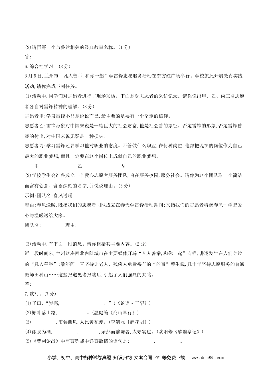 2012年甘肃省中考语文真题及答案(满分:150分时间:120分钟)一、语言积累与运用(30分)1.下列词语中加点字注音完全正确的一项是(3分)()A.肥硕(shuò)邂逅(xiè)夸父逐日(zhú)B.怄气(òu)栈桥(jiàn)怒不可遏(è)C.发酵(xiào)角色(jiǎo)尽态极妍(yán)D.愧怍(zuò)睥睨(pì)相形见绌(zhuō)2.下列词语书写有错误的一项是(3分)()A.娴熟紫藤萝谈笑风生B.沧茫里程碑锋芒必露C.馈赠戈壁滩如坐针毡D.喑哑城隍庙左右逢源3.填入横线的语句,与下文衔接最恰当的一项是(3分)()。父母对子女有抚养的义务,子女又对父母有赡养之责任;个人对社会有奉献的责任,同时社会也有对个人的责任。A.我们要做有责任的人B.人与人之间都要有责任C.责任是无处不在的D.责任常常是双向的4.下列对病句的修改不正确的一项是(3分)()A.林书豪在NBA的职业生涯正在刚刚开始,就以神奇的表现征服了亿万观众。修改:删除“正在”B.在上海家电博览会上,海尔推出了全球可去除PM2.5的首台空调。修改:应把“首台”移到“可去除”之前C.春天的兰州各大公园绽露出自然的清新和灵秀,成为人们春游的好时机。修改:把“成为”改为“是”D.通过持续摄入含有1073R-1乳酸菌的酸奶饮料,会使学生患流感的几率有效降低。修改:删除“通过”5.阅读名著片段,回答下列问题。(3分)鲁提辖假意道:“你这厮诈死,洒家再打!”只见面皮渐渐的变了。鲁达寻思道:“俺只指望痛打这厮一顿,不想三拳真个打死了他。洒家须吃官司,又没人送饭,不如及早撒开。”拔步便走,回头指着郑屠尸道:“你诈死!洒家和你慢慢理会!”一头骂,一头大踏步去了。(1)鲁达为什么“大踏步去了”?从以上言行中,你读出了鲁达怎样的性格?(2分)答:小学、初中、高中各种试卷真题知识归纳文案合同PPT等免费下载www.doc985.com(2)请再写一个与鲁达相关的经典故事名称。(1分)答:6.综合性学习。(8分)3月5日,兰州市“凡人善举,和你一起”学雷锋志愿服务活动在东方红广场举行。学校就此开展教育实践活动,请你完成下列任务。(1)活动中,同学们对志愿者进行了现场采访。下面是对志愿者的采访记录。请你说出甲、乙、丙三名志愿者各自对雷锋精神的理解。(3分)志愿者甲:学习雷锋不只是说说而已,最主要的是要有一个坚定的信仰。志愿者乙:雷锋形象对中国来说是一笔巨大的社会财富,他是社会善的象征。否定雷锋的形象,否定雷锋曾经的付出,对中国来说无疑是一种损失。志愿者丙:学习雷锋还要学习他对职业的态度。不管做什么职业,在何种岗位,他都把现在的岗位作为自己最大的职业梦想,而且一定要在这个岗位上成就自己的职业梦想。甲乙丙(2)学校学生会准备成立一个爱心志愿者服务团队,旨在服务校园,服务社会。请你为这个团队取一个简洁而富有创意、含蓄深刻的名字,并说说理由。(3分)示例:团队名:春风送暖理由:春风送暖,既指我们的志愿者团队成立在春天学雷锋活动期间;又指我们的志愿者将像春风一样把爱心与温暖送给大家。团队名:理由:(3)活动中,有下面一则消息。请你概括其主要内容。(2分)近一段时间来,兰州这座西北内陆城市在主要媒体开辟“凡人善举,和你一起”专栏,讲述发生在人们身边的“凡人善举”:数年间一直坚持让老人、残疾人免费乘车的“的哥”蔡生武,几十年坚持志愿服务的普通教师田种山……这些报道见诸报端后,引起了人们强烈的共鸣。答:7.默写。(7分)(1)子曰:“岁寒,。”(《论语·子罕》)(2)槲叶落山路,。(温庭筠《商山早行》)(3),帘卷西风,人比黄花瘦。(李清照《醉花阴》)(4)酿泉为酒,,,杂然而前陈者,太守宴也。(欧阳修《醉翁亭记》)(5)《曹刿论战》中写曹刿战中详察敌情的语句是:,。小学、初中、高中各种试卷真题知识归纳文案合同PPT等免费下载www.doc985.com二、古诗文阅读(23分)(一)阅读下面这首宋词,完成8—9题。(3分)清平乐村居辛弃疾茅檐低小,溪上青青草。醉里吴音相媚好,白发谁家翁媪?大儿锄豆溪东,中儿正织鸡笼;最喜小儿亡①赖,溪头卧剥莲蓬。[注]亡:此处读作“wú”。8.“最喜小儿亡赖”一句中“亡赖”的意思是。(1分)9.下列理解不正确的一项是(2分)()A.“清平乐”是词牌名,“村居”是词的题目。B.词的上片描写江南山村的景色,下片描写两代人的生活画面。C.这首词紧紧围绕着小溪,布置画面,...