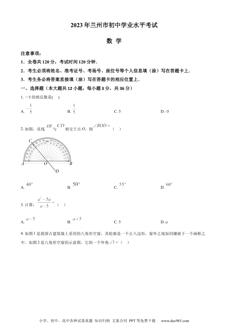小学、初中、高中各种试卷真题知识归纳文案合同PPT等免费下载www.doc985.com2023年兰州市初中学业水平考试数学注意事项:1.全卷共120分,考试时间120分钟.2.考生必须将姓名、准考证号、考场号、座位号等个人信息填(涂)写在答题卡上.3.考生务必将答案直接填(涂)写在答题卡的相应位置上.一、选择题(本大题共12小题,每小题3分,共36分)1.-5的相反数是()A.B.C.5D.-52.如图,直线与相交于点O,则()A.B.C.D.3.计算:()A.B.C.5D.a4.如图1是我国古建筑墙上采用的八角形空窗,其轮廓是一个正八边形,窗外之境如同镶嵌于一个画框之中.如图2是八角形空窗的示意图,它的一个外角()小学、初中、高中各种试卷真题知识归纳文案合同PPT等免费下载www.doc985.comA.B.C.D.5.方程的解是()A.B.C.D.6.如图1是一段弯管,弯管的部分外轮廓线如图2所示是一条圆弧,圆弧的半径,圆心角,则()A.B.C.D.7.已知二次函数,下列说法正确的是()A.对称轴为B.顶点坐标为C.函数的最大值是-3D.函数的最小值是-38.关于x的一元二次方程有两个相等的实数根,则()A.-2B.2C.-4D.49.2022年我国新能源汽车销量持续增长,全年销量约为572.6万辆,同比增长91.7%,连续8年位居全球第一.下面的统计图反映了2021年、2022年新能源汽车月度销量及同比增长速度的情况.(2022年同比小学、初中、高中各种试卷真题知识归纳文案合同PPT等免费下载www.doc985.com增长速度)根据统计图提供的信息,下列推断不合理的是()A.2021年新能源汽车月度销量最高是12月份,超过40万辆B.2022年新能源汽车月度销量超过50万辆的月份有6个C.相对于2021年,2022年新能源汽车同比增长速度最快的是2月份,达到了181.1%D.相对于2021年,2022年从5月份开始新能源汽车同比增长速度持续降低10.我国古代天文学确定方向的方法中蕴藏了平行线的作图法.如《淮南子天文训》中记载:“正朝夕:先树一表东方;操一表却去前表十步,以参望日始出北廉.日直入,又树一表于东方,因西方之表,以参望日方入北康.则定东方两表之中与西方之表,则东西也.”如图,用几何语言叙述作图方法:已知直线a和直线外一定点O,过点O作直线与a平行.(1)以O为圆心,单位长为半径作圆,交直线a于点M,N;(2)分别在的延长线及上取点A,B,使;(3)连接,取其中点C,过O,C两点确定直线b,则直线.按以上作图顺序,若,则()小学、初中、高中各种试卷真题知识归纳文案合同PPT等免费下载www.doc985.comA.B.C.D.11.一次函数的函数值y随x的增大而减小,当时,y的值可以是()A.2B.1C.-1D.-212.如图,在矩形中,点E为延长线上一点,F为的中点,以B为圆心,长为半径的圆弧过与的交点G,连接.若,,则()A.2B.2.5C.3D.3.5二、填空题(本大题共4小题,每小题3分,共12分)13.因式分解:______.14.如图,在中,,于点E,若,则______.小学、初中、高中各种试卷真题知识归纳文案合同PPT等免费下载www.doc985.com15.如图,将面积为7的正方形和面积为9的正方形分别绕原点O顺时针旋转,使,落在数轴上,点A,D在数轴上对应的数字分别为a,b,则______.16.某学习小组做抛掷一枚瓶盖的实验,整理的实验数据如下表:累计抛掷次数501002003005001000200030005000盖面朝上次数2854106158264527105615872850盖面朝上频率下面有三个推断:①通过上述实验的结果,可以推断这枚瓶盖有很大的可能性不是质地均匀的;②第2000次实验的结果一定是“盖面朝上”;③随着实验次数的增大,“盖面朝上”的概率接近0.53.其中正确的是______.(填序号)三、解答题(本大题共12小题,共72分)17.计算:.18.计算:.19.解不等式组:.20.如图,反比例函数与一次函数的图象交于点,轴于点D,分别交反比例函数与一次函数的图象于点B,C.小学、初中、高中各种试卷真题知识归纳文案合同PPT等免费下载www.doc985.com(1)求反比例函数与一次函数的表达式;(2)当时,求线段的长.21.综合与实践问题探究:(1)如图1是古希腊数学家欧几里得所著的《几何原本》第1卷命题9:“平分一个已知角.”即:作一个已知角的平分线,如图2是欧几里得在《几何原本》中给出的角平分线作图法...