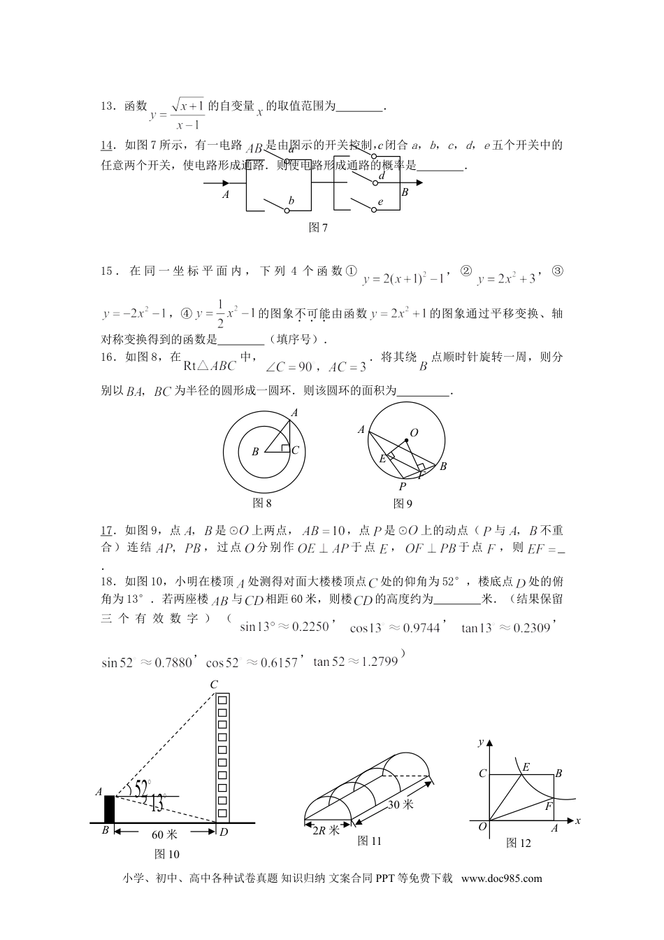 左面A.B.C.D.2008年甘肃省兰州市中考数学真题及答案注意事项:1.全卷共计150分,考试时间120分钟.考生在答题前务必将毕业学校、志愿学校、姓名、准考证号、考场、座位号填写在试卷的相应位置上.2.答题时请用同一颜色(蓝色或黑色)的钢笔、碳素笔或圆珠笔将答案直接写在试卷上,要求字迹工整,卷面整洁.3.不得另加附页,附页上答题不记分.一、选择题(本题共12个小题,每小题4分,共计48分.在每小题给出的4个选项中,只有一项是符合题目要求的)1.图1是北京奥运会自行车比赛项目标志,则图中两轮所在圆的位置关系是()A.内含B.相交C.相切D.外离2.方程的解是()A.B.C.或D.3.正方形网格中,如图2放置,则的值为()A.B.C.D.24.桌面上放着1个长方体和1个圆柱体,按下图所示的方式摆放在一起,其左视图是()5.若反比例函数的图象经过点,其中,则此反比例函数的图象在()A.第一、二象限B.第一、三象限C.第二、四象限D.第三、四象限6.在一个不透明的布袋中,红色、黑色、白色的玻璃球共有40个,除颜色外其它完全相同.小明通过多次摸球试验后发现其中摸到红色球、黑色球的频率稳定在15%和45%,则口袋中白色球的个数可能是()A.24B.18C.16D.67.如图3,已知是的直径,把为的直角三角板的一条直角边放在直线上,斜边与交于点,点与点重合.将三角板沿方向平移,使得点与点重合为止.设,则的取值范围是()小学、初中、高中各种试卷真题知识归纳文案合同PPT等免费下载www.doc985.com图1ABO图2ACFO(B)EP图3A.B.C.D.8.如图4,现有一个圆心角为90°,半径为8cm的扇形纸片,用它恰好围成一个圆锥的侧面(接缝忽略不计),则该圆锥底面圆的半径为()A.4cmB.3cmC.2cmD.1cm9.已知二次函数()的图象如图5所示,有下列4个结论:①;②;③;④;其中正确的结论有()A.1个B.2个C.3个D.4个10.下列表格是二次函数的自变量与函数值的对应值,判断方程(为常数)的一个解的范围是()6.176.186.196.20A.B.C.D.11.如图6,在中,,经过点且与边相切的动圆与分别相交于点,则线段长度的最小值是()A.B.C.5D.4812.把长为8cm的矩形按虚线对折,按图中的虚线剪出一个直角梯形,找开得到一个等腰梯形,剪掉部分的面积为6cm2,则打开后梯形的周长是()A.cmB.cmC.22cmD.18cm二、填空题(本题共8个小题,每小题4分,共32分,请把答案填在题中的横线上.)小学、初中、高中各种试卷真题知识归纳文案合同PPT等免费下载www.doc985.com3cm3cm图4-1Ox=1yx图5BCEFA图613.函数的自变量的取值范围为.14.如图7所示,有一电路是由图示的开关控制,闭合a,b,c,d,e五个开关中的任意两个开关,使电路形成通路.则使电路形成通路的概率是.15.在同一坐标平面内,下列4个函数①,②,③,④的图象不可能由函数的图象通过平移变换、轴对称变换得到的函数是(填序号).16.如图8,在中,.将其绕点顺时针旋转一周,则分别以为半径的圆形成一圆环.则该圆环的面积为.17.如图9,点是上两点,,点是上的动点(与不重合)连结,过点分别作于点,于点,则.18.如图10,小明在楼顶处测得对面大楼楼顶点处的仰角为52°,楼底点处的俯角为13°.若两座楼与相距60米,则楼的高度约为米.(结果保留三个有效数字)(,,,,,)小学、初中、高中各种试卷真题知识归纳文案合同PPT等免费下载www.doc985.comBAabcde图7ACB图8DBC1352图10A60米2R米30米图11yxOFABEC图12AEOFBP图919.农村常需要搭建截面为半圆形的全封闭蔬菜塑料暖房如图11所示,则需要塑料布(m2)与半径(m)的函数关系式是(不考虑塑料埋在土里的部分).20.如图12,已知双曲线()经过矩形的边的中点,且四边形的面积为2,则.三、解答题(本大题共8道题,共计70分,解答时写出必要的文字说明、证明过程或演算步骤)21.(本题满分6分)(1)一木杆按如图13-1所示的方式直立在地面上,请在图中画出它在阳光下的影子(用线段表示);(2)图13-2是两根标杆及它们在灯光下的影子.请在图中画出光源的位置(用点表示),并在图中画出人在此光源下的影子.(用线段表示).22.(...