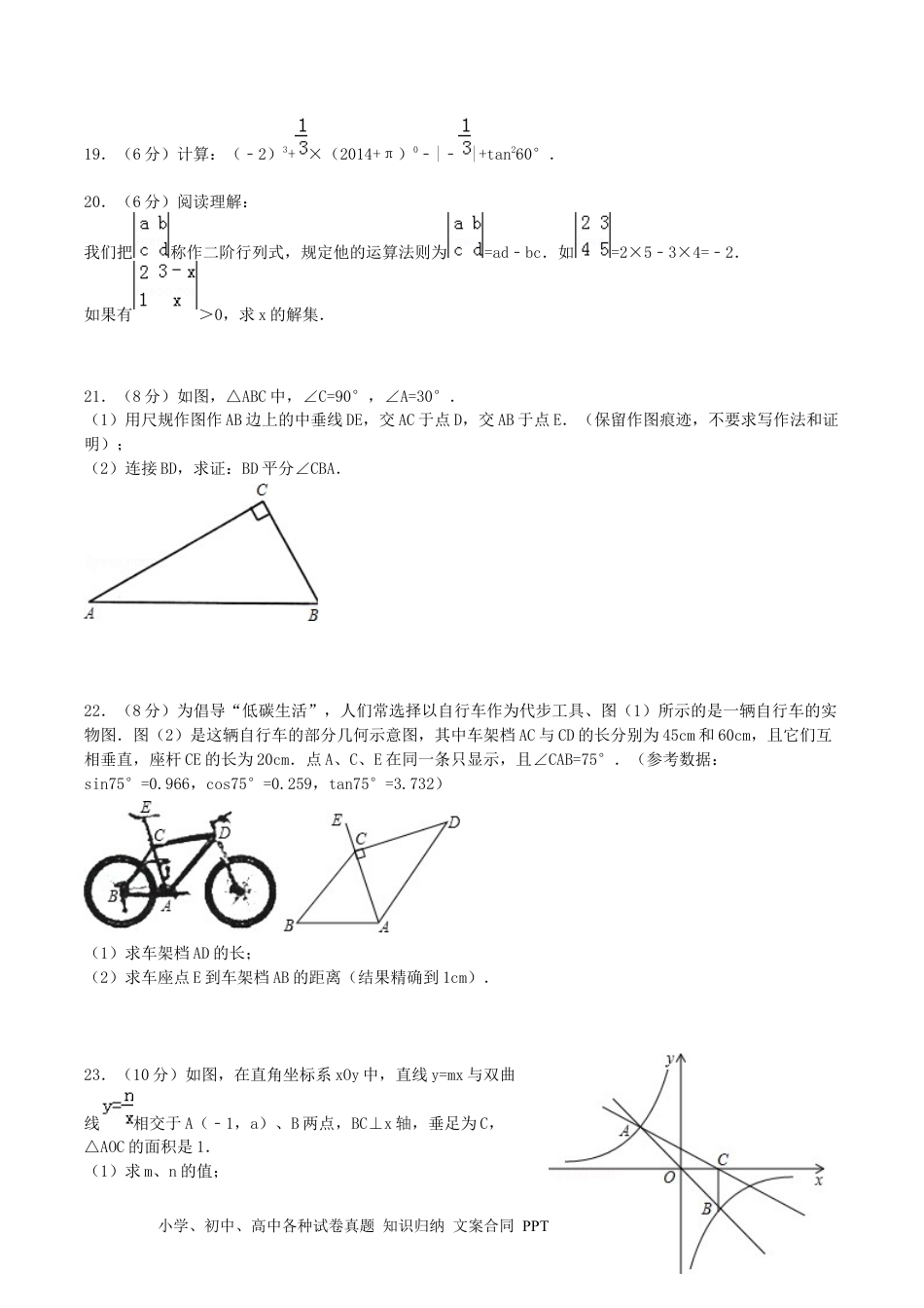小学、初中、高中各种试卷真题知识归纳文案合同PPT等免费下载www.doc985.com2014年甘肃省白银市中考数学试题及答案一、选择题:本大题共10个小题,每小题3分,共30分,每小题给出的四个选项中,只有一项是符合题目要求的,将此选项的字母填涂在答题卡上.1.(3分)﹣3的绝对值是()A.3B.﹣3C.﹣D.2.(3分)节约是一种美德,节约是一种智慧.据不完全统计,全国每年浪费食物总量折合粮食可养活约3亿5千万人.350000000用科学记数法表示为()A.3.5×107B.3.5×108C.3.5×109D.3.5×10103.(3分)如图的几何体是由一个正方体切去一个小正方体形成的,它的主视图是()A.B.C.D.4.(3分)下列计算错误的是()A.•=B.+=C.÷=2D.=25.(3分)将直角三角尺的直角顶点靠在直尺上,且斜边与这根直尺平行,那么,在形成的这个图中与∠α互余的角共有()A.4个B.3个C.2个D.1个6.(3分)下列图形中,是轴对称图形又是中心对称图形的是()A.B.C.D.7.(3分)已知⊙O的半径是6cm,点O到同一平面内直线l的距离为5cm,则直线l与⊙O的位置关系是()A.相交B.相切C.相离D.无法判断8.(3分)用10米长的铝材制成一个矩形窗框,使它的面积为6平方米.若设它的一条边长为x米,则根据题意可列出关于x的方程为()A.x(5+x)=6B.x(5﹣x)=6C.x(10﹣x)=6D.x(10﹣2x)=6小学、初中、高中各种试卷真题知识归纳文案合同PPT等免费下载www.doc985.com9.(3分)二次函数y=x2+bx+c,若b+c=0,则它的图象一定过点()A.(﹣1,﹣1)B.(1,﹣1)C.(﹣1,1)D.(1,1)10.(3分)如图,边长为1的正方形ABCD中,点E在CB延长线上,连接ED交AB于点F,AF=x(0.2≤x≤0.8),EC=y.则在下面函数图象中,大致能反映y与x之闻函数关系的是()A.B.C.D.二、填空题:本大题共8小题,每小题4分,共32分.把答案写在答题卡中的横线上.11.(4分)分解因式:2a2﹣4a+2=.12.(4分)化简:=.13.(4分)等腰△ABC中,AB=AC=10cm,BC=12cm,则BC边上的高是cm.14.(4分)一元二次方程(a+1)x2﹣ax+a2﹣1=0的一个根为0,则a=.15.(4分)△ABC中,∠A、∠B都是锐角,若sinA=,cosB=,则∠C=.16.(4分)已知x、y为实数,且y=﹣+4,则x﹣y=.17.(4分)如图,四边形ABCD是菱形,O是两条对角线的交点,过O点的三条直线将菱形分成阴影和空白部分.当菱形的两条对角线的长分别为6和8时,则阴影部分的面积为.18.(4分)观察下列各式:13=1213+23=3213+23+33=6213+23+33+43=102…猜想13+23+33+…+103=.三、解答题(一):本大题共5小题,共38分.解答时,应写出必要的文字说明、证明过程或演算步骤.小学、初中、高中各种试卷真题知识归纳文案合同PPT等免费下载www.doc985.com19.(6分)计算:(﹣2)3+×(2014+π)0﹣|﹣|+tan260°.20.(6分)阅读理解:我们把称作二阶行列式,规定他的运算法则为=ad﹣bc.如=2×5﹣3×4=﹣2.如果有>0,求x的解集.21.(8分)如图,△ABC中,∠C=90°,∠A=30°.(1)用尺规作图作AB边上的中垂线DE,交AC于点D,交AB于点E.(保留作图痕迹,不要求写作法和证明);(2)连接BD,求证:BD平分∠CBA.22.(8分)为倡导“低碳生活”,人们常选择以自行车作为代步工具、图(1)所示的是一辆自行车的实物图.图(2)是这辆自行车的部分几何示意图,其中车架档AC与CD的长分别为45cm和60cm,且它们互相垂直,座杆CE的长为20cm.点A、C、E在同一条只显示,且∠CAB=75°.(参考数据:sin75°=0.966,cos75°=0.259,tan75°=3.732)(1)求车架档AD的长;(2)求车座点E到车架档AB的距离(结果精确到1cm).23.(10分)如图,在直角坐标系xOy中,直线y=mx与双曲线相交于A(﹣1,a)、B两点,BC⊥x轴,垂足为C,△AOC的面积是1.(1)求m、n的值;小学、初中、高中各种试卷真题知识归纳文案合同PPT等免费下载www.doc985.com(2)求直线AC的解析式.四、解答题(二):本大题共5小题,共50分.解答时,应写出必要的文字说明、证明过程或演算步骤.24.(8分)在一个不透明的布袋里装有4个标号为1、2、3、4的小球,它们的材质、形状、大小...