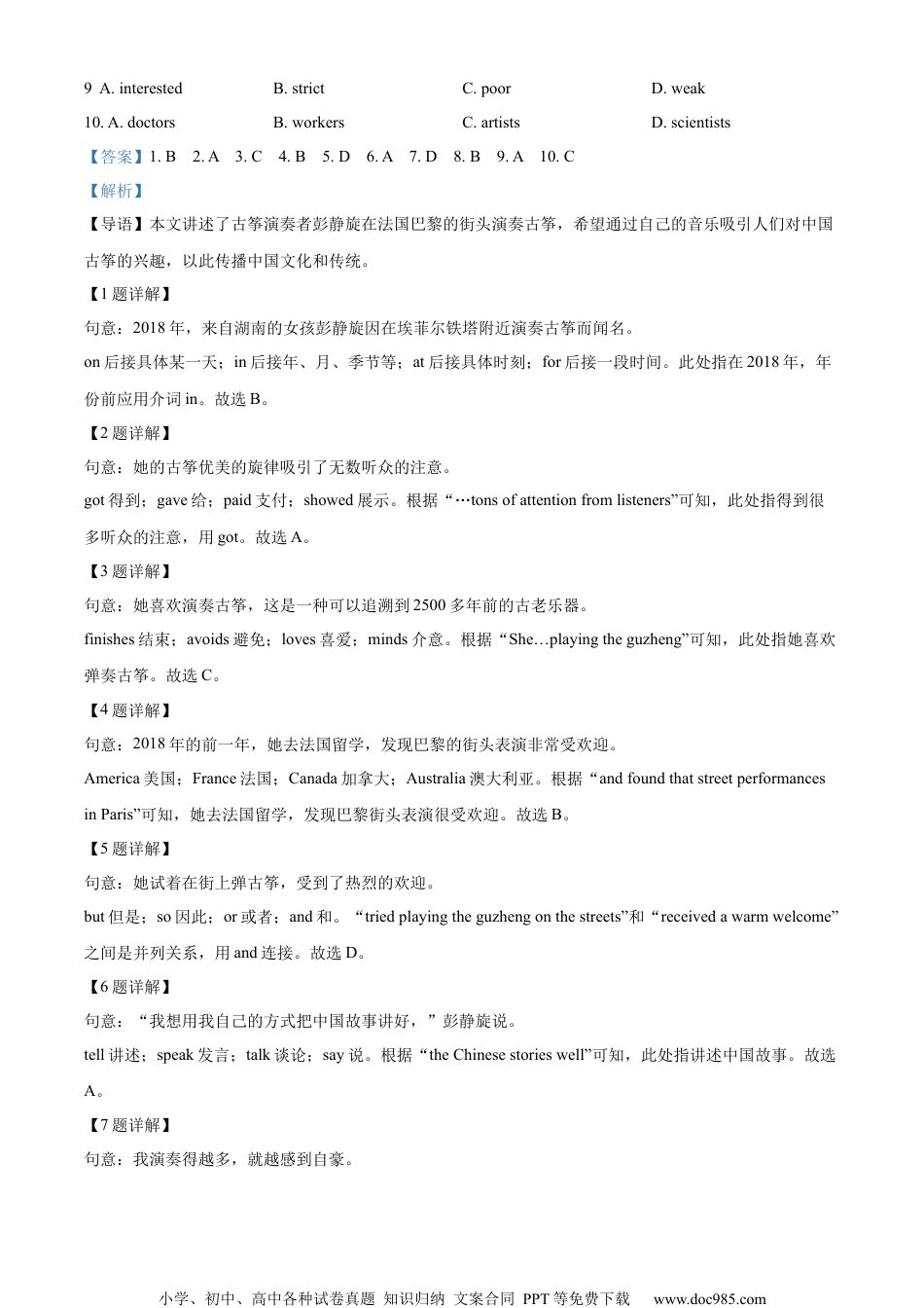 小学、初中、高中各种试卷真题知识归纳文案合同PPT等免费下载www.doc985.com2024年兰州市初中学业水平考试英语注意事项:1.全卷共90分,考试时间90分钟。2.考生必须将姓名、准考证号、考场号、座位号等个人信息填(涂)写在试卷及答题卡上。3.考生务必将答案直接填(涂)写在答题卡的相应位置上。4.考试结束后,将本试卷和答题卡一并交回。一、完形填空(共10小题:每小题1分,满分10分)阅读下面短文,从短文后各题所给的四个选项中选出能填入空白处的最佳答案。PengJingxuan,agirlfromHunan,waswell-knownforplayingtheguzhengneartheEiffelTower___1___2018.Thebeautifulmelodies(旋律)fromherguzheng___2___tonsofattentionfromlisteners.Shehasbeenplayingtheguzhengsinceshewas7yearsold.She___3___playingtheguzheng,anancientmusicalinstrumentthatdatesbackmorethan2,500years.Shewentto___4___forfurtherstudytheyearbefore2018andfoundthatstreetperformancesinPariswereverypopular.Shetriedplayingtheguzhengonthestreets___5___receivedawarmwelcome.“Iwantto___6___theChinesestorieswellinmyownway,”PengJingxuansaid.“Iplayedmanywonderfulpiecesonthestreets.ThemoreIplayed,___7___prouderIfelt”.She___8___pickedmusic,includingtraditionalguzhengpiecesandpopsongswithChineseelements.“Mydreamistomakemorepeoplebe___9___intheguzheng,”shesaid.“Also,therearelotsofexcellent____10____spreadingtraditionalChineseculturearoundtheworld”.1.A.onB.inC.atD.for2.A.gotB.gaveC.paidD.showed3.A.finishesB.avoidsC.lovesD.minds4.A.AmericaB.FranceC.CanadaD.Australia5.A.butB.soC.orD.and6.A.tellB.speakC.talkD.say7.A.aB.anC./D.the8.A.nervouslyB.carefullyC.suddenlyD.unexpectedly小学、初中、高中各种试卷真题知识归纳文案合同PPT等免费下载www.doc985.com9.A.interestedB.strictC.poorD.weak10.A.doctorsB.workersC.artistsD.scientists【答案】1.B2.A3.C4.B5.D6.A7.D8.B9.A10.C【解析】【导语】本文讲述了古筝演奏者彭静旋在法国巴黎的街头演奏古筝,希望通过自己的音乐吸引人们对中国古筝的兴趣,以此传播中国文化和传统。【1题详解】句意:2018年,来自湖南的女孩彭静旋因在埃菲尔铁塔附近演奏古筝而闻名。on后接具体某一天;in后接年、月、季节等;at后接具体时刻;for后接一段时间。此处指在2018年,年份前应用介词in。故选B。【2题详解】句意:她的古筝优美的旋律吸引了无数听众的注意。got得到;gave给;paid支付;showed展示。根据“…tonsofattentionfromlisteners”可知,此处指得到很多听众的注意,用got。故选A。【3题详解】句意:她喜欢演奏古筝,这是一种可以追溯到2500多年前的古老乐器。finishes结束;avoids避免;loves喜爱;minds介意。根据“She…playingtheguzheng”可知,此处指她喜欢弹奏古筝。故选C。【4题详解】句意:2018年的前一年,她去法国留学,发现巴黎的街头表演非常受欢迎。America美国;France法国;Canada加拿大;Australia澳大利亚。根据“andfoundthatstreetperformancesinParis”可知,她去法国留学,发现巴黎街头表演很受欢迎。故选B。【5题详解】句意:她试着在街上弹古筝,受到了热烈的欢迎。but但是;so因此;or或者;and和。“triedplayingtheguzhengonthestreets”和“receivedawarmwelcome”之间是并列关系,用and连接。故选D。【6题详解】句意:“我想用我自己的方式把中国故事讲好,”彭静旋说。tell讲述;speak发言;talk谈论;say说。根据“theChinesestorieswell”可知,此处指讲述中国故事。故选A。【7题详解】句意:我演奏得越多,就越感到自豪。小学、初中、高中各种试卷真题知识归纳文案合同PPT等免费下载www.doc985.coma不定冠词,表泛指,用于辅音音素开头的单词前;an不定冠词,表泛指,用于元音音素开头的单词前;/零冠词;the定冠词。此处是“the+比较级,the+比较级”,意为“越……,越……”。故选D。【8题详解】句意:她认真挑选音乐,包括传统古筝和中国元素的流行歌曲。n...