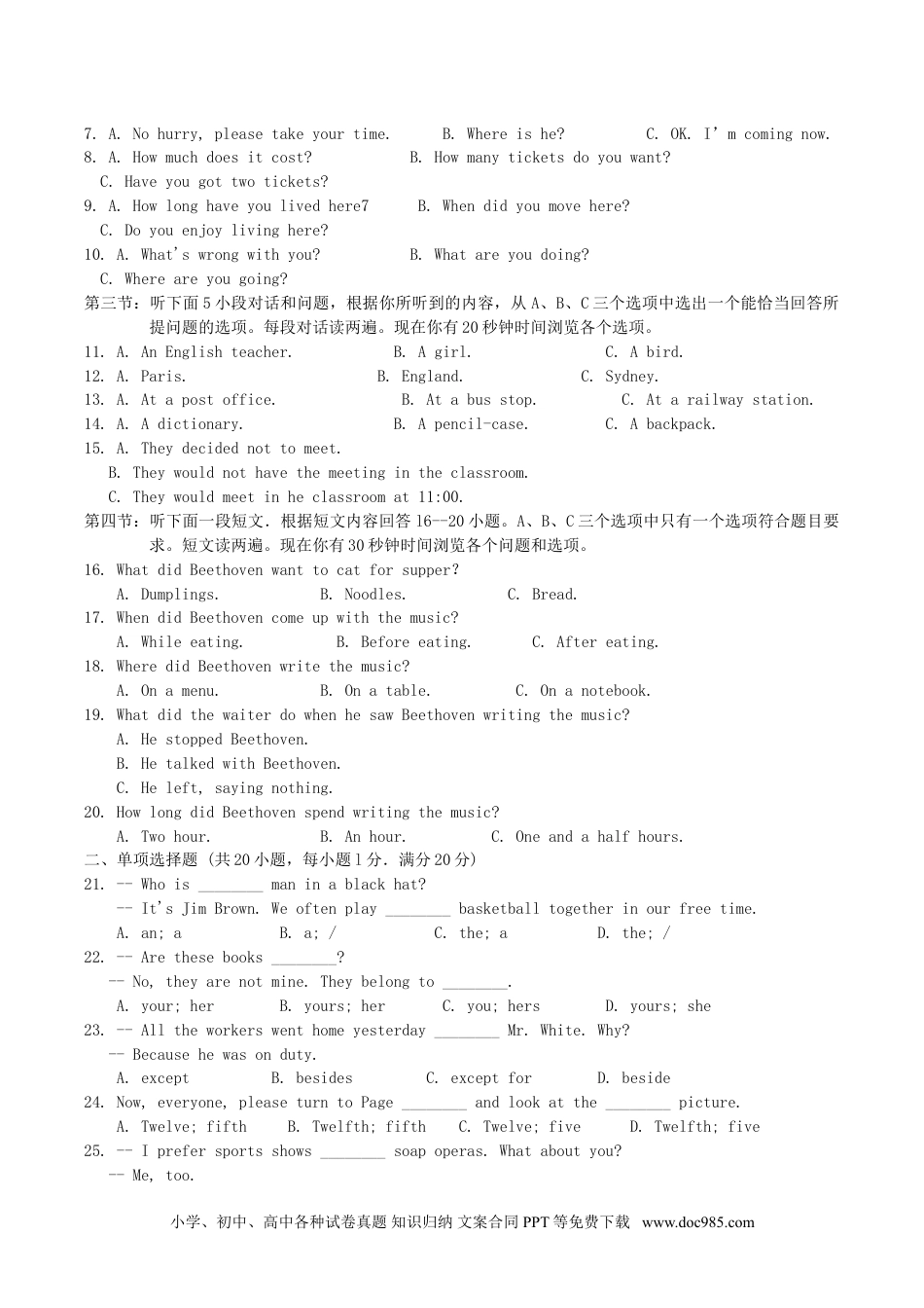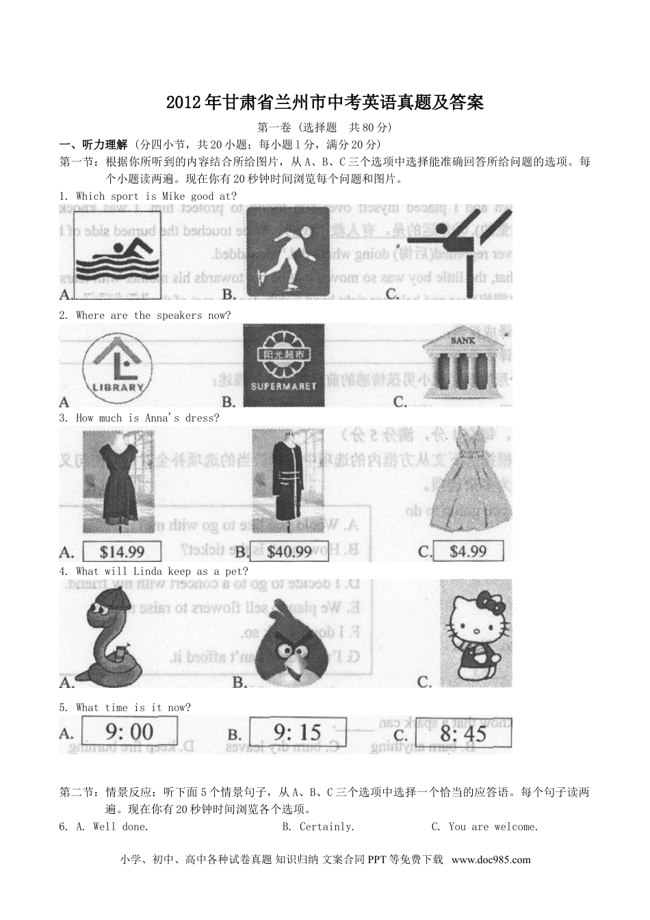 2012年甘肃省兰州市中考英语真题及答案第一卷(选择题共80分)一、听力理解(分四小节,共20小题;每小题l分,满分20分)第一节:根据你所听到的内容结合所给图片,从A、B、C三个选项中选择能准确回答所给问题的选项。每个小题读两遍。现在你有20秒钟时间浏览每个问题和图片。1.WhichsportisMikegoodat?2.Wherearethespeakersnow?3.HowmuchisAnna'sdress?4.WhatwillLindakeepasapet?5.Whattimeisitnow?第二节:情景反应:听下面5个情景句子,从A、B、C三个选项中选择一个恰当的应答语。每个句子读两遍。现在你有20秒钟时间浏览各个选项。6.A.Welldone.B.Certainly.C.Youarewelcome.小学、初中、高中各种试卷真题知识归纳文案合同PPT等免费下载www.doc985.com7.A.Nohurry,pleasetakeyourtime.B.Whereishe?C.OK.I’mcomingnow.8.A.Howmuchdoesitcost?B.Howmanyticketsdoyouwant?C.Haveyougottwotickets?9.A.Howlonghaveyoulivedhere7B.Whendidyoumovehere?C.Doyouenjoylivinghere?10.A.What'swrongwithyou?B.Whatareyoudoing?C.Whereareyougoing?第三节:听下面5小段对话和问题,根据你所听到的内容,从A、B、C三个选项中选出一个能恰当回答所提问题的选项。每段对话读两遍。现在你有20秒钟时间浏览各个选项。11.A.AnEnglishteacher.B.Agirl.C.Abird.12.A.Paris.B.England.C.Sydney.13.A.Atapostoffice.B.Atabusstop.C.Atarailwaystation.14.A.Adictionary.B.Apencil-case.C.Abackpack.15.A.Theydecidednottomeet.B.Theywouldnothavethemeetingintheclassroom.C.Theywouldmeetinheclassroomat11:00.第四节:听下面一段短文.根据短文内容回答l6--20小题。A、B、C三个选项中只有一个选项符合题目要求。短文读两遍。现在你有30秒钟时间浏览各个问题和选项。16.WhatdidBeethovenwanttocatforsupper?A.Dumplings.B.Noodles.C.Bread.17.WhendidBeethovencomeupwiththemusic?A.Whileeating.B.Beforeeating.C.Aftereating.18.WheredidBeethovenwritethemusic?A.Onamenu.B.Onatable.C.Onanotebook.19.WhatdidthewaiterdowhenhesawBeethovenwritingthemusic?A.HestoppedBeethoven.B.HetalkedwithBeethoven.C.Heleft,sayingnothing.20.HowlongdidBeethovenspendwritingthemusic?A.Twohour.B.Anhour.C.Oneandahalfhours.二、单项选择题(共20小题,每小题l分.满分20分)21.--Whois________maninablackhat?--It'sJimBrown.Weoftenplay________basketballtogetherinourfreetime.A.an;aB.a;/C.the;aD.the;/22.--Arethesebooks________?--No,theyarenotmine.Theybelongto________.A.your;herB.yours;herC.you;hersD.yours;she23.--Alltheworkerswenthomeyesterday________Mr.White.Why?--Becausehewasonduty.A.exceptB.besidesC.exceptforD.beside24.Now,everyone,pleaseturntoPage________andlookatthe________picture.A.Twelve;fifthB.Twelfth;fifthC.Twelve;fiveD.Twelfth;five25.--Iprefersportsshows________soapoperas.Whataboutyou?--Me,too.小学、初中、高中各种试卷真题知识归纳文案合同PPT等免费下载www.doc985.comA.atB.thanC.toD.of26.Comeon,________you’llbelate.A.andB.butC.orD.so27.Ilikethesephotosandtheycan________me________thelifelivinginthecountryside.A.think;ofB.remind;ofC.let;downD.wake;up28.________excitingnews!Wewillhavea________holidayaftertheexam.A.Whatan;twomonthsB.Howan;twomonthsC.What;two-monthD.How;twomonths'29.--I'llgotoJapanforatripnextmonth.--Great!________A.Goodluck!B.Haveagoodtime!C.Bestwishes!D.Gladtoseeyouagain!30.Bettywillringmeupwhenshe________inShanghai.A.arriveB.arrivesC.arrivedD.willarrive31.Bamboocan________paper.A.usedtomakeB.beusedmakeC.beusedtomakeD.beusedtomaking32.Thedoctordidwhathecould________thegirlwhowasbadlyhurtintheaccident.A.saveB.savingC.tosaveD.saves33.--Fiftydollarsforsuchablouse!You________bejoking!--I'mserous.It'smadeofsilk.A.mustB.canC.mayD.need34.--Whyareyousotiredthese...