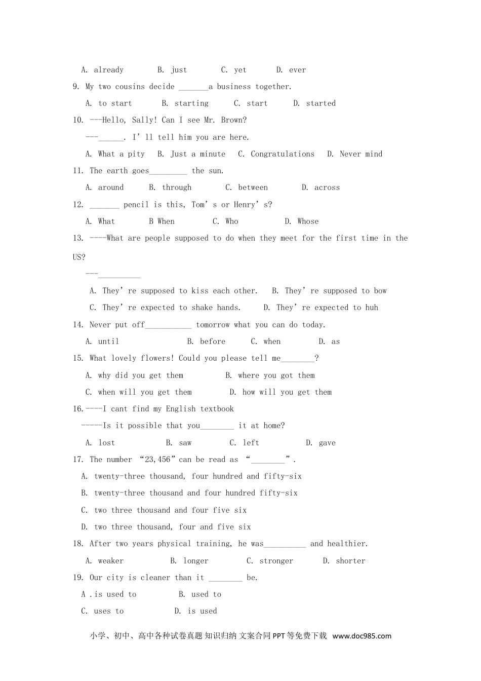 2018年甘肃省市中考英语试题及答案考生注意:本试卷不含听力,满分为150分,考试时间为120分钟。所有试题均在答题卡上作答,否则无效。I.单词辨音(共5小题;每小题1分,满分5分)1.A.actB.bagC.factD.make2.A.relaxB.sevenC.websiteD.tell3.A.purpleB.returnC.surpriseD.hurt4.A.gameB.gentlemanC.flagD.together5.A.themB.withC.weatherD.thinkⅡ.语法与情景对话(共25小题;每小题1分;满分25分)阅读下列各题,从A、B、C、D四个选项中选择一个最佳答案。1.Themanisdrivingat40kilometres_________hour.A.aB.anC.theD./2.Inevery________therehastobesomegive-and-take.A.friendshipB.instrumentC.attentionD.blackboard3.Therearemanygoodteachersin_________school.A.weB.himC.ourD.themselves4.Lookatthepictureontheright!Sheisgoing________.A.intothelibraryB.outofthepostofficeC.intothesupermarketD.outofthebank5.----Canweplaysoccerhere?-----No,you__________playitneartheroad.That’stoodangerous!A.canB.mayC.won’tD.mustn’t6.Iknowhisface_______Ican’trememberhisname.A.andB.butC.orD.so7.She_______anEnglishmagazinewhenIcamein.A.readsB.hadreadC.willreadD.wasreading8.----Isdinnerready?---Not________.小学、初中、高中各种试卷真题知识归纳文案合同PPT等免费下载www.doc985.comA.alreadyB.justC.yetD.ever9.Mytwocousinsdecide_______abusinesstogether.A.tostartB.startingC.startD.started10.---Hello,Sally!CanIseeMr.Brown?---______.I’lltellhimyouarehere.A.WhatapityB.JustaminuteC.CongratulationsD.Nevermind11.Theearthgoes_________thesun.A.aroundB.throughC.betweenD.across12._______pencilisthis,Tom’sorHenry’s?A.WhatBWhenC.WhoD.Whose13.----WhatarepeoplesupposedtodowhentheymeetforthefirsttimeintheUS?---__________A.They’resupposedtokisseachother.B.They’resupposedtobowC.They’reexpectedtoshakehands.D.They’reexpectedtohuh14.Neverputoff___________tomorrowwhatyoucandotoday.A.untilB.beforeC.whenD.as15.Whatlovelyflowers!Couldyoupleasetellme________?A.whydidyougetthemB.whereyougotthemC.whenwillyougetthemD.howwillyougetthem16.----IcantfindmyEnglishtextbook-----Isitpossiblethatyou________itathome?A.lostB.sawC.leftD.gave17.Thenumber“23,456”canbereadas“________”.A.twenty-threethousand,fourhundredandfifty-sixB.twenty-threethousandandfourhundredfifty-sixC.twothreethousandandfourfivesixD.twothreethousand,fourandfivesix18.Aftertwoyearsphysicaltraining,hewas__________andhealthier.A.weakerB.longerC.strongerD.shorter19.Ourcityiscleanerthanit________be.A.isusedtoB.usedtoC.usestoD.isused小学、初中、高中各种试卷真题知识归纳文案合同PPT等免费下载www.doc985.com20.----Youlooksmarttoday!---____________A.NotgoodB.That’sOKC.Whatashame!D.Thankyou21.Ireallylikethefamilyphoto___wetookonmygrandpa’s80thbirthday.A.whoB.thatC.whatD.whose22.---AllofmyclassmateshavepassedthePEtest.---________excitingthenewsis!A.HowB.WhatC.WhatanD.Howan23.---It’smyturntogiveareportIfeelsonervous.---Just_________.Ibetyou’rethebest.A.giveitupB.goawayC.takeiteasyD.havenoidea24.Whichofthefollowingwordshasadifferentstresspattern(重音)fromtheothers?A.dailyB.basketC.countryD.fifteen25.WhichpartistheVERBofthefollowingsentence“Tomrideshisbiketoschooleveryday.”?A.“Tom”B.“rides”C.“hisbike”D.“everyday”Ⅲ.完形填空(共10小题;每小题1分,满分10分)阅读下面短文,从短文后各题所给的四个选项中选出能填入空白处的最佳答案。Oneplacethatisveryimportantinmylifeismygrandmothershouse.She1inasmallvillageinthesouthofthecountry.Igothereeverysummer,tovisitmygrandmother,2thecityandrelax.Thevillageisjustagroupofwhiteho...