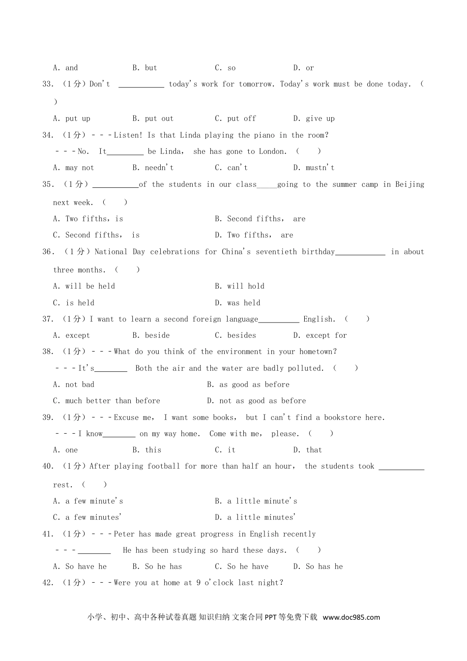 2019年甘肃省天水市中考英语真题及答案解析A卷(100分)Ⅰ.语音(每小题1分,共10分)A)观察所给单词的读音,从A、B、C、D四个选项中找出其画线部分的读音与所给单词的画线部分读音相同的选项.1.(1分)yellowA.cityB.hardlyC.centuryD.yesterday2.(1分)usefulA.suddenB.computerC.ruleD.club3.(1分)honestA.hourB.hostC.hometownD.harm4.(1分)breakA.sweaterB.eatC.pleaseD.bean5.(1分)washedA.refusedB.solvedC.knockedD.provided6.(1分)southernA.thousandB.thirstyC.breatheD.throughB)根据下列对话的情景找出画线句子在一般情况下单词需要重读的选项.7.(1分)﹣﹣﹣What'sthetime?﹣﹣﹣It'saquarterpastthree.()A.a,quarter,threeB.Its,quarter,threeC.a,quarter,past,threeD.quarter,past,three8.(1分)﹣﹣﹣Howdoyouspendyourfreetime?﹣﹣﹣Iliketoexerciseinmyfreetime.()A.like.ExerciseB.like,exercise,free,timeC.I,like,exerciseD.Like,toexerciseC)以下每组对话由句子①、②、③组成,指出这三个句子在一般情况下应该用什么语调.9.(1分)①﹣Whatissuccess?②﹣Doesitmeanthatyouarerichandfamous?③﹣I'mnotsurehowtoanswerit.()A.①升调②降调③降调B.①升调②升调③降调C.①降调②降调③降调D.①降调②升调③降调10.(1分)①﹣Shallwegototheshoppingcentrebybikeorbybus?②﹣Bybus.③﹣Howfarisitfromhere?()A.①升调②降调③降调B.①降调②降调③降调C.①升调②降调③升调D.①降调②降调③升调Ⅱ.词汇(每小题1分,共15分)A)按照括号内的要求写出下列单词的相应形式.11.(1分)nine(序数词).12.(1分)pear(同音词).13.(1分)sheep(复数).14.(1分)eat(过去式).小学、初中、高中各种试卷真题知识归纳文案合同PPT等免费下载www.doc985.com15.(1分)she(名词性物主代词).16.(1分)able(反义词).17.(1分)begin(现在分词).18.(1分)little(最高级).19.(1分)luck(副词).20.(1分)choose(名词).B)根据句意及首字母提示或所给汉语意思写出句中所缺的单词.21.(1分)Thankyouforimetoyourbirthdayparty.22.(1分)Haveyoumadea(决定)togoonavacation?23.(1分)Maryisafromclasstodaybecausesheisinhospital24.(1分)Gspeaking,differentcountrieshavedifferenttablemanners.25.(1分)Afterdiscussingtheprojectseveraltimes,theyreachedan(协议)finally.Ⅲ.语法与情景交际(每小题1分,共25分)26.(1分)﹣You'vedropped"s"intheword"necessary".﹣Oh,letter"s"isdoubled.()A.a;aB.a;theC.an;theD.the;the27.(1分)MostofthevillagerstookpartintheDragonBoatraces9:00a.m.themorningofJun7.()A.at.inB.on.onC.on,inD.at,on28.(1分)HongKongDisneylandiswellworth.()A.tovisitB.visitedC.visitD.visiting29.(1分)excitingnewsitis!Beijingwillhold2022WinterOlympicGames.()A.WhatanB.WhatC.HowD.Howan30.(1分)Eitherthestudentsortheteacherhimverywell.()A.knowsB.toknowC.knowD.knew31.(1分)﹣﹣﹣Look!Theyare.﹣﹣﹣Yes.Weareproudofthem.()A.manscientistB.womenscientistsC.womanscientistsD.manscientists32.(1分)Itriedcallingyouyourphonewasoutofservice.()小学、初中、高中各种试卷真题知识归纳文案合同PPT等免费下载www.doc985.comA.andB.butC.soD.or33.(1分)Don'ttoday'sworkfortomorrow.Today'sworkmustbedonetoday.()A.putupB.putoutC.putoffD.giveup34.(1分)﹣﹣﹣Listen!IsthatLindaplayingthepianointheroom?﹣﹣﹣No.ItbeLinda,shehasgonetoLondon.()A.maynotB.needn'tC.can'tD.mustn't35.(1分)ofthestudentsinourclass_____goingtothesummercampinBeijingnextweek.()A.Twofifths,isB.Secondfifths,areC.Secondfifths,isD.Twof...