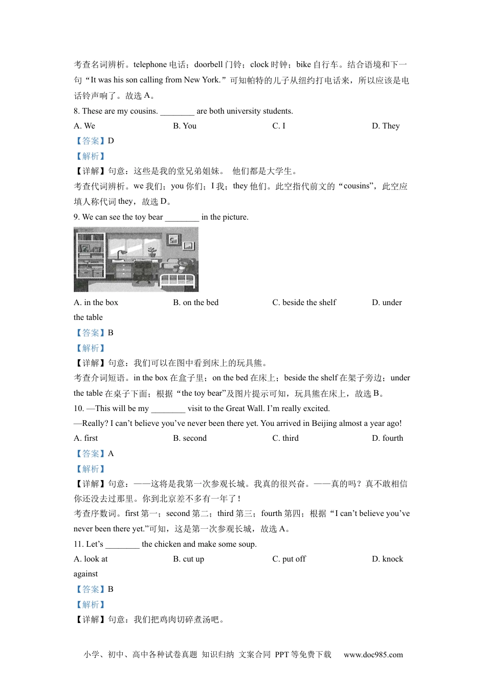 小学、初中、高中各种试卷真题知识归纳文案合同PPT等免费下载www.doc985.com2022年天水市初中毕业与升学学业考试(中考)英语试卷Ⅰ.单词辨音(共5小题;每小题1分,满分5分)从A、B、C、D四个选项中,找出画线部分与其他三个单词画线部分读音不同的选项。1.A.cutB.luckC.musicD.hurry2.A.everB.heC.messD.pen3.A.fortyB.morningC.horseD.word4.A.whoB.whatC.whyD.where5.A.cakeB.centC.cityD.cinema【答案】1.C2.B3.D4.A5.A【解析】【1题详解】cut/kʌt/;luck/lʌk/;music/ˈmjuːzɪk/;hurry/ˈhʌri/。划线部分发音不一样的是C,故选C。【2题详解】ever/ˈevə(r)/;he/hiː/;mess/mes/;pen/pen/。划线部分发音不一样的是B,故选B。【3题详解】forty/ˈfɔːti/;morning/ˈmɔːnɪŋ/;horse/hɔːs/;word/wɜːd/。划线部分发音不一样的是D,故选D。【4题详解】who/huː/;what/wɒt/;why/waɪ/;where/weə(r)/。划线部分发音不一样的是A,故选A。【5题详解】cake/keɪk/;cent/sent/;city/ˈsɪti/;cinema/ˈsɪnəmə/。划线部分发音不一样的是A,故选A。Ⅱ.语法与情景对话(共20小题;每小题1分,满分20分)阅读下列各题,从A、B、C、D四个选项中选择一个最佳答案。6.Ijustboughtanewshirt.________shirtwasprettyexpensive.A.AB.AnC.TheD./【答案】C【解析】【详解】句意:我刚刚买了一件新衬衫。这件新衬衫相当贵。考查冠词用法。此空特指前文提到的这件衬衫,用the表特指,故选C。7.The________rangandPatansweredit.ItwashissoncallingfromNewYork.A.telephoneB.doorbellC.clockD.bike【答案】A【解析】【详解】句意:电话铃响了,帕特接了电话。是他儿子从纽约打来的。小学、初中、高中各种试卷真题知识归纳文案合同PPT等免费下载www.doc985.com考查名词辨析。telephone电话;doorbell门铃;clock时钟;bike自行车。结合语境和下一句“ItwashissoncallingfromNewYork.”可知帕特的儿子从纽约打电话来,所以应该是电话铃声响了。故选A。8.Thesearemycousins.________arebothuniversitystudents.A.WeB.YouC.ID.They【答案】D【解析】【详解】句意:这些是我的堂兄弟姐妹。他们都是大学生。考查代词辨析。we我们;you你们;I我;they他们。此空指代前文的“cousins”,此空应填人称代词they,故选D。9.Wecanseethetoybear________inthepicture.A.intheboxB.onthebedC.besidetheshelfD.underthetable【答案】B【解析】【详解】句意:我们可以在图中看到床上的玩具熊。考查介词短语。inthebox在盒子里;onthebed在床上;besidetheshelf在架子旁边;underthetable在桌子下面;根据“thetoybear”及图片提示可知,玩具熊在床上,故选B。10.—Thiswillbemy________visittotheGreatWall.I’mreallyexcited.—Really?Ican’tbelieveyou’veneverbeenthereyet.YouarrivedinBeijingalmostayearago!A.firstB.secondC.thirdD.fourth【答案】A【解析】【详解】句意:——这将是我第一次参观长城。我真的很兴奋。——真的吗?真不敢相信你还没去过那里。你到北京差不多有一年了!考查序数词。first第一;second第二;third第三;fourth第四;根据“Ican’tbelieveyou’veneverbeenthereyet.”可知,这是第一次参观长城,故选A。11.Let’s________thechickenandmakesomesoup.A.lookatB.cutupC.putoffD.knockagainst【答案】B【解析】【详解】句意:我们把鸡肉切碎煮汤吧。小学、初中、高中各种试卷真题知识归纳文案合同PPT等免费下载www.doc985.com考查动词短语辨析。lookat看;cutup切碎;putoff推迟;knockagainst撞击。根据“thechickenandmakesomesoup”可知,是切碎鸡肉做汤,故选B。12.—How’sthenewrestaurant?—It’s________.Wewaitedalongtimeforthefoodtoarrive.A.wonderfulB.excitingC.difficultD.awful【答案】D【解析】【详解】句意:——那家新餐馆怎么样?——很糟糕。我们等了很长时间才上菜。考查形容词辨析。wonderful精彩的;exciting兴奋的;difficult困难的;awful糟糕的;根据“Wewaitedalongtimeforthefoodtoarrive.”可知,新餐厅很糟糕,故选D。...