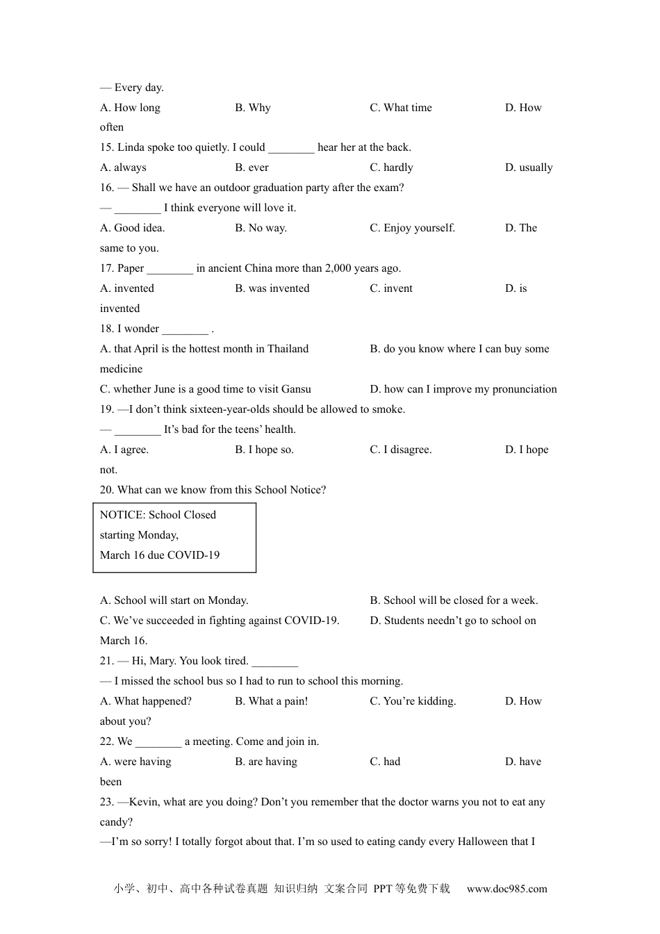 小学、初中、高中各种试卷真题知识归纳文案合同PPT等免费下载www.doc985.com2022年天水市初中毕业与升学学业考试(中考)英语试卷Ⅰ.单词辨音(共5小题;每小题1分,满分5分)从A、B、C、D四个选项中,找出画线部分与其他三个单词画线部分读音不同的选项。1.A.cutB.luckC.musicD.hurry2.A.everB.heC.messD.pen3.A.fortyB.morningC.horseD.word4.A.whoB.whatC.whyD.where5.A.cakeB.centC.cityD.cinemaⅡ.语法与情景对话(共20小题;每小题1分,满分20分)阅读下列各题,从A、B、C、D四个选项中选择一个最佳答案。6.Ijustboughtanewshirt.________shirtwasprettyexpensive.A.AB.AnC.TheD./7.The________rangandPatansweredit.ItwashissoncallingfromNewYork.A.telephoneB.doorbellC.clockD.bike8.Thesearemycousins.________arebothuniversitystudents.A.WeB.YouC.ID.They9.Wecanseethetoybear________inthepicture.A.intheboxB.onthebedC.besidetheshelfD.underthetable10.—Thiswillbemy________visittotheGreatWall.I’mreallyexcited.—Really?Ican’tbelieveyou’veneverbeenthereyet.YouarrivedinBeijingalmostayearago!A.firstB.secondC.thirdD.fourth11.Let’s________thechickenandmakesomesoup.A.lookatB.cutupC.putoffD.knockagainst12.—How’sthenewrestaurant?—It’s________.Wewaitedalongtimeforthefoodtoarrive.A.wonderfulB.excitingC.difficultD.awful13.Ihaven’tgotanyapplejuice,________I’vegotsomeorangejuice.Wouldyoulikesome?A.butB.andC.orD.for14.—________doyouexercise?小学、初中、高中各种试卷真题知识归纳文案合同PPT等免费下载www.doc985.com—Everyday.A.HowlongB.WhyC.WhattimeD.Howoften15.Lindaspoketooquietly.Icould________hearherattheback.A.alwaysB.everC.hardlyD.usually16.—Shallwehaveanoutdoorgraduationpartyaftertheexam?—________Ithinkeveryonewillloveit.A.Goodidea.B.Noway.C.Enjoyyourself.D.Thesametoyou.17.Paper________inancientChinamorethan2,000yearsago.A.inventedB.wasinventedC.inventD.isinvented18.Iwonder________.A.thatAprilisthehottestmonthinThailandB.doyouknowwhereIcanbuysomemedicineC.whetherJuneisagoodtimetovisitGansuD.howcanIimprovemypronunciation19.—Idon’tthinksixteen-year-oldsshouldbeallowedtosmoke.—________It’sbadfortheteens’health.A.Iagree.B.Ihopeso.C.Idisagree.D.Ihopenot.20.WhatcanweknowfromthisSchoolNotice?NOTICE:SchoolClosedstartingMonday,March16dueCOVID-19A.SchoolwillstartonMonday.B.Schoolwillbeclosedforaweek.C.We’vesucceededinfightingagainstCOVID-19.D.Studentsneedn’tgotoschoolonMarch16.21.—Hi,Mary.Youlooktired.________—ImissedtheschoolbussoIhadtoruntoschoolthismorning.A.Whathappened?B.Whatapain!C.You’rekidding.D.Howaboutyou?22.We________ameeting.Comeandjoinin.A.werehavingB.arehavingC.hadD.havebeen23.—Kevin,whatareyoudoing?Don’tyourememberthatthedoctorwarnsyounottoeatanycandy?—I’msosorry!Itotallyforgotaboutthat.I’msousedtoeatingcandyeveryHalloweenthatI小学、初中、高中各种试卷真题知识归纳文案合同PPT等免费下载www.doc985.comdidn’trememberthisyearIwasn’tsupposedto.________A.Practicemakesperfect.B.WheninRome,doastheRomansdo.C.Oldhabitsdiehard.D.Timeismoney.24.—Happybirthdaytoyou,Mary.—________A.Haveaniceday.B.Seeyou.C.Thesametoyou.D.Thankyou.25.Whichofthefollowingsignwillyouprobablyseeinareadingroomofalibrary?A.B.C.D.Ⅲ.完形填空(共10小题;每小题1.5分,满分15分)阅读下面短文,从短文后各题所给的四个选项中选出能填入空白处的最佳答案。阅读下面短文,从短文后各题所给的四个选项中选出能填入空白处的最佳答案。ItwastheturkeythatmadeittheworstThanksgivingever…well,it___26___did.Allthefamily—mygrandparents,myparents,myauntanduncle,mycousin...