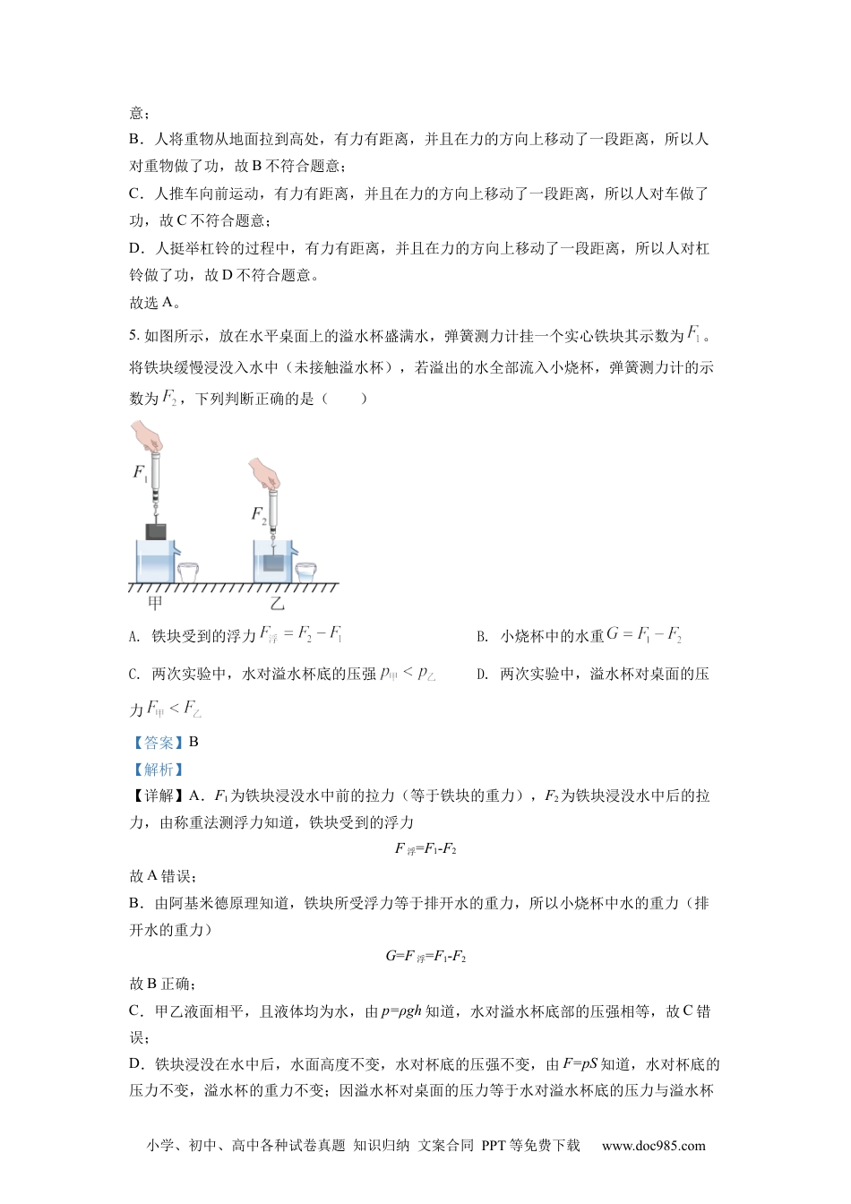 小学、初中、高中各种试卷真题知识归纳文案合同PPT等免费下载www.doc985.com2022年甘肃省兰州市中考物理试卷一、选择题:本大题11小题,每小题3分,共33分。在每小题给出的四个选项中,只有一个选项是符合题目要求的。1.校园生活,同学们并不陌生,下列有关说法最合理的是()A.操场篮球架上的篮圈距地面的高度约为B.此时教室内的温度约为C.微机室内台式计算机的功率约为D.普通乒乓球拍的质量约为【答案】C【解析】【详解】A.操场篮球架上的篮圈距地面的高度约为3m,故A不符合题意;B.教室内的温度大约20度左右,故B不符合题意;C.台式计算机的功率约为300W合理,故C符合题意;D.普通乒乓球拍的质量约为2g,故D不符合题意。故选C。2.笛子是一种常见的管乐器,下列说法错误的是()A.笛子发出的声音是由空气柱振动产生的B.笛声在真空中的传播速度为340m/sC.用不同的力度吹奏主要改变了声音的响度D.吹奏时按压不同位置的气孔,主要改变了声音的音调【答案】B【解析】【详解】A.声音是由物体振动产生的,笛子发出的声音是由空气柱振动产生的,故A正确,不符合题意;B.声音不能在真空中传播,故B错误,符合题意;C.用不同的力度吹奏是为了改变振幅,从而改变响度,故C正确,不符合题意;D.吹奏时按压不同位置的气孔,是为了改变振动的频率,从而改变了声音的音调,故D正确,不符合题意。故选B。3.如图所示为甲和乙两种物质的质量与体积关系图像,分析图像可知()小学、初中、高中各种试卷真题知识归纳文案合同PPT等免费下载www.doc985.comA.甲物质的密度与质量成正比B.若甲、乙的体积相等,则甲的质量较小C.甲、乙两种物质的密度之比为D.若甲、乙的质量相等,则甲的体积较大【答案】C【解析】【详解】A.密度是物质的一种特性,密度的大小与质量、体积的大小无关,故A错误;B.若甲、乙的体积相等,比如甲、乙的体积都为10cm3时,由图像可知,甲的质量是20g,乙的质量是5g,则甲的质量较大,故B错误;C.比如甲、乙的体积都为10cm3时,甲的质量是20g,乙的质量是5g,则甲、乙两种物质的密度之比为故C正确;D.若甲、乙的质量相等,比如甲、乙的质量都为10g时,由图像可知,甲的体积是5cm3,乙的体积是20cm3,则甲的体积较小,故D错误。故选C。4.如图所示的情境中,对物体不做功的是()A.图甲:用力搬石头,没有搬动B.图乙:将重物从地面拉到高处C.图丙:推车向前运动D.图丁:挺举杠铃的过程【答案】A【解析】【详解】A.人用力搬石头没有搬动,有力无距离,所以人对石头没有做功,故A符合题小学、初中、高中各种试卷真题知识归纳文案合同PPT等免费下载www.doc985.com意;B.人将重物从地面拉到高处,有力有距离,并且在力的方向上移动了一段距离,所以人对重物做了功,故B不符合题意;C.人推车向前运动,有力有距离,并且在力的方向上移动了一段距离,所以人对车做了功,故C不符合题意;D.人挺举杠铃的过程中,有力有距离,并且在力的方向上移动了一段距离,所以人对杠铃做了功,故D不符合题意。故选A。5.如图所示,放在水平桌面上的溢水杯盛满水,弹簧测力计挂一个实心铁块其示数为。将铁块缓慢浸没入水中(未接触溢水杯),若溢出的水全部流入小烧杯,弹簧测力计的示数为,下列判断正确的是()A.铁块受到的浮力B.小烧杯中的水重C.两次实验中,水对溢水杯底的压强D.两次实验中,溢水杯对桌面的压力【答案】B【解析】【详解】A.F1为铁块浸没水中前的拉力(等于铁块的重力),F2为铁块浸没水中后的拉力,由称重法测浮力知道,铁块受到的浮力F浮=F1-F2故A错误;B.由阿基米德原理知道,铁块所受浮力等于排开水的重力,所以小烧杯中水的重力(排开水的重力)G=F浮=F1-F2故B正确;C.甲乙液面相平,且液体均为水,由p=ρgh知道,水对溢水杯底部的压强相等,故C错误;D.铁块浸没在水中后,水面高度不变,水对杯底的压强不变,由F=pS知道,水对杯底的压力不变,溢水杯的重力不变;因溢水杯对桌面的压力等于水对溢水杯底的压力与溢水杯小学、初中、高中各种试卷真题知识归纳文案合同PPT等免费下载www.doc985.com的重力之和,所以溢水杯对桌面的压力不变,即F甲=F乙故D错误。故...