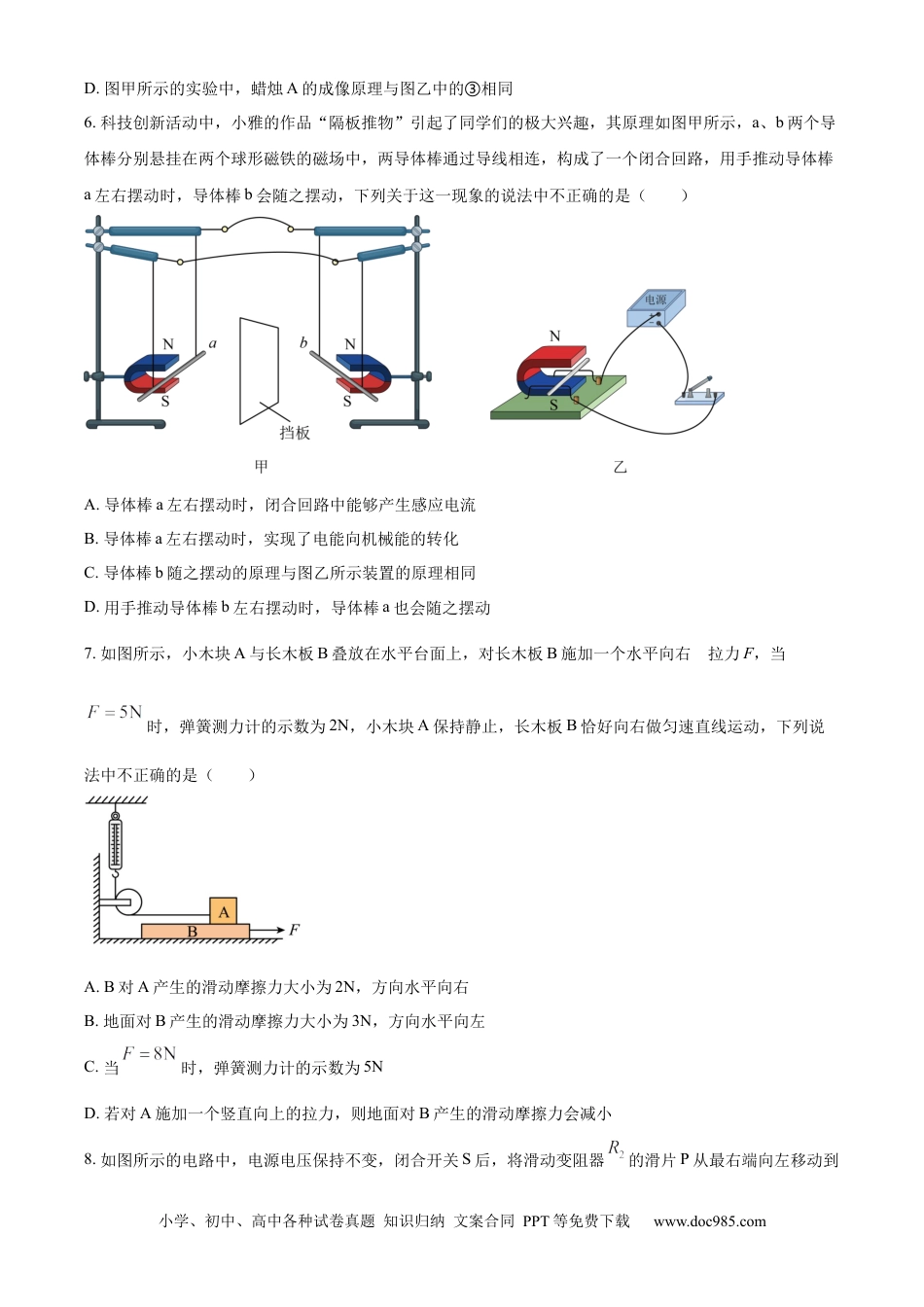 小学、初中、高中各种试卷真题知识归纳文案合同PPT等免费下载www.doc985.com2024年甘肃省兰州市中考物理试卷一、选择题:本大题11小题,每小题3分,共33分。在每小题给出的四个选项中。只有一个选项是符合题目要求的。1.如图所示,用酒精灯对试管加热,等水沸腾后,可以看到蒸汽把软木塞顶跑。下列说法正确的是()A.用酒精灯加热试管,水内能的增加是通过做功的方式实现的B.蒸气把软木塞顶跑的过程,实现了内能向机械能的转化C.蒸气把软木塞顶跑的过程,相当于汽油机的排气冲程D.试管口出现的白雾是水汽化后形成的水蒸气2.科学家对银河系中心附近的恒星S2进行了多年的持续观测,给出了从1994年到2002年间恒星S2的位置如图所示,科学家认为S2恒星的运动轨迹是一个椭圆。推测银河系中心可能存在着超大质量的黑洞。忽略S2恒星质量的变化,根据图片信息,下列说法中正确的是()A.黑洞可能位于椭圆轨道内部的P点B.S2恒星在运动过程中所受合力为零C.S2恒星在1995年时期的动能大于2001年时期的动能D.S2恒星在1995年时期的重力势能大于2001年时期的重力势能3.小敏利用如图甲所示的高脚玻璃杯做实验,下列说法中不正确的是()小学、初中、高中各种试卷真题知识归纳文案合同PPT等免费下载www.doc985.comA.纸片被击打后迅速飞出,鸡蛋却落入杯中,这是因为鸡蛋具有惯性B.轻敲杯口,听到声音的同时看到水面出现波纹,说明声音是由物体振动产生的C.改变杯内水量,敲击杯子发声时的音调改变,这是由于杯壁的振幅改变引起的D.用装满水的玻璃杯做如图乙所示的“覆杯实验”,可以证明大气压强的存在4.2024年4月至10月,世界园艺博览会在成都举行。本届世园会的主题为“公园城市美好人居”,秉持“绿色低碳、节约持续、共享包容”的理念。下列说法中不正确的是()A.园区内的输电线如果用超导材料制作,可以降低由于输电线发热而引起的电能损耗B.园区内使用新能源转运车,是因为新能源汽车比燃油车的能量转化效率高C.园区内使用节水装置,是因为地球上淡水资源有限,我们需要节约用水D.因为自然界中的能量是守恒的,所以我们不需要节约能源5.如图甲所示,在“探究平面镜成像特点”的实验中,小亮将点燃的蜡烛A放在玻璃板的前面,他通过玻璃板能够看到蜡烛A在玻璃板后面所成的像,下列与平面镜成像相关的说法中不正确的是()A.选用与蜡烛A完全相同的蜡烛B做实验,目的是便于比较像与物的大小B.蜡烛A靠近玻璃板时,所成像的大小不变C.移开蜡烛B,若将光屏置于像的位置,则光屏上会出现蜡烛A的像小学、初中、高中各种试卷真题知识归纳文案合同PPT等免费下载www.doc985.comD.图甲所示的实验中,蜡烛A的成像原理与图乙中的③相同6.科技创新活动中,小雅的作品“隔板推物”引起了同学们的极大兴趣,其原理如图甲所示,a、b两个导体棒分别悬挂在两个球形磁铁的磁场中,两导体棒通过导线相连,构成了一个闭合回路,用手推动导体棒a左右摆动时,导体棒b会随之摆动,下列关于这一现象的说法中不正确的是()A.导体棒a左右摆动时,闭合回路中能够产生感应电流B.导体棒a左右摆动时,实现了电能向机械能的转化C.导体棒b随之摆动的原理与图乙所示装置的原理相同D.用手推动导体棒b左右摆动时,导体棒a也会随之摆动7.如图所示,小木块A与长木板B叠放在水平台面上,对长木板B施加一个水平向右的拉力F,当时,弹簧测力计的示数为2N,小木块A保持静止,长木板B恰好向右做匀速直线运动,下列说法中不正确的是()A.B对A产生的滑动摩擦力大小为2N,方向水平向右B.地面对B产生的滑动摩擦力大小为3N,方向水平向左C.当时,弹簧测力计的示数为5ND.若对A施加一个竖直向上的拉力,则地面对B产生的滑动摩擦力会减小8.如图所示的电路中,电源电压保持不变,闭合开关S后,将滑动变阻器的滑片P从最右端向左移动到小学、初中、高中各种试卷真题知识归纳文案合同PPT等免费下载www.doc985.com中点的过程中,下列说法中正确的是()A.滑动变阻器消耗的功率变大B.电流表A的示数变小C.电压表V的示数变大D.电压表V与电流表A的示数之比变大9.如图所示是塔吊吊起重物的情景,在拉力F的作用下,重为的重物被竖直向上匀速吊起,已知动滑轮重...