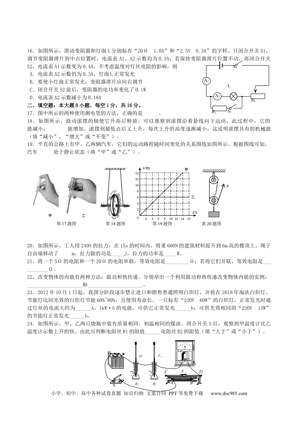 小学、初中、高中各种试卷真题知识归纳文案合同PPT等免费下载www.doc985.com2013年甘肃省兰州市中考物理真题及答案注意事项:1.全卷共120分,测试时间100分钟。2.考生必须将姓名、准考证号、考场、座位号等个人信息填(涂)写在答题卡上。3.考生务必将答案直接填(涂)写在答题卡的相应位置上。4.本试卷计算如果不能整除时,请保留两位小数。一、选择题:本大题16小题,每小题3分,共48分。在每小题给出的四个选项中,只有一个选项是符合题目要求的。1.某人乘游艇在黄河上逆流而上,若说他静止,是以下列哪个物体为参照物A.黄河水B.岸边的高楼C.他乘坐的游艇D.迎面驶来的游艇2.如图所示的四种现象中,属于光的折射现象的是A.水中的倒影B.透过树叶间的阳光C.水中弯折的铅笔D.物体的影子3.下列几种说法中正确的是A.声音可以在真空中传播B.“低声细语”是指声音的响度小C.只要物体振动,人就能听到声音D.声音只能传播信息,不能传播能量4.某同学利用下列测量工具进行测量,其中数据记录不正确的是A.26℃B.107gC.2.8ND.30mL5.下列说法中不正确的是A.安宁桃花会上,游客能闻到桃花的香味,说明分子是运动的B.铁丝很难被拉断,说明分子间有引力C.四冲程汽油机的做功冲程是将机械能转化成内能D.一杯水温度降低时,内能减小了6.下列设备中利用了通电导体在磁场中受到力的作用的是A.发电机B.电动机C.动圈式话筒D.电磁铁7.下列实例中属于增大压强的是A.图钉尖很尖锐B.书包背带较宽C.铁轨下铺设枕木D.穿滑雪板滑雪5g100g5g432015432105432N102030104050mL20℃10小学、初中、高中各种试卷真题知识归纳文案合同PPT等免费下载www.doc985.com8.打开冰箱门,常常能看到冷藏室内壁上有水珠,这些水珠主要是由食物中的水分经过下列哪些物态变化形成的A.升华、凝华B.汽化、熔化C.凝华、熔化D.汽化、液化9.有关家庭电路,下列做法中符合要求的是A.拔用电器插头时,用力扯插头的电线B.长时间不看电视时,不切断电源,用遥控器关闭电视C.将开关接在用电器和零线之间D.发现电线绝缘层破损后,用绝缘胶布裹扎10.北斗卫星导航系统是我国正在实施的自主研发、独立运行的全球卫星导航系统,缩写为BDS。该系统可在全球范围内全天候、全天时为各类用户提供高精度、高可靠的定位、导航、授时服务并兼具短报文通信能力。BDS卫星通信使用的是A.电磁波B.次声波C.超声波D.光波11.下列有关力的说法中正确的是A.摩擦力总是阻碍物体运动的B.物体所受重力的方向始终竖直向下C.两个物体只有接触才能产生力的作用D.漂在液面上的物体才受浮力的作用12.乒乓球运动中蕴含着许多力学知识。下列说法中正确的是A.球拍对乒乓球的作用力大于乒乓球对球拍的作用力B.乒乓球在空中运动时,仍受球拍的作用力C.球拍击球时,只改变了乒乓球的运动方向D.乒乓球惯性小,所以容易来回抽杀13.如图所示的电路中,闭合开关S1和S2,则A.灯泡L1亮,L2不亮B.灯泡L2亮,L1不亮C.灯泡L1、L2都不亮D.灯泡L1、L2都亮14.将“6V3W”和“6V6W”的两只灯泡L1和L2串联后接在电源两端,不考虑温度对灯丝电阻的影响,则A.电源电压为12V时,两只灯泡均能正常发光B.两个灯泡发光时,灯泡L2比灯泡L1亮一些C.灯泡发光时,电路中允许通过的最大电流为1AD.灯泡L1正常发光时,灯泡L2的实际功率是1.5W15.如图所示的电路,闭合开关,观察发现灯泡L1亮、L2不亮。调节变阻器滑片P,灯泡L1的亮度发生变化,但灯泡L2始终不亮。出现这一现象的原因可能是A.灯泡L2灯丝断了B.滑动变阻器短路了C.灯泡L2短路了D.滑动变阻器接触不良VL1L2S1S2L1L2SCDBPA小学、初中、高中各种试卷真题知识归纳文案合同PPT等免费下载www.doc985.com16.如图所示,滑动变阻器和灯泡L分别标有“20Ω1.0A”和“2.5V0.3A”的字样。只闭合开关S1,调节变阻器滑片到中点位置时,电流表A1、A2示数均为0.3A;若保持变阻器滑片位置不动,再闭合开关S2,电流表A1示数变为0.4A。不考虑温度对灯丝电阻的影响,则A.电流表A2示数仍为0.3A,灯泡L正常发光B.要使小灯泡正常发光,变阻器滑片应向右调节C.闭合开关S2前后,变阻器的电功...