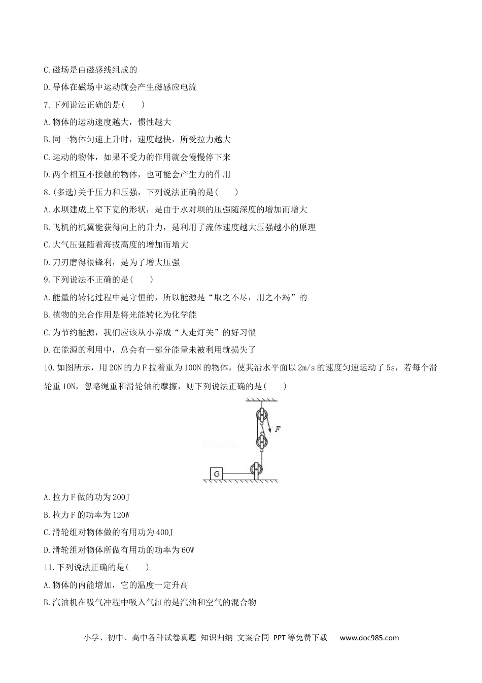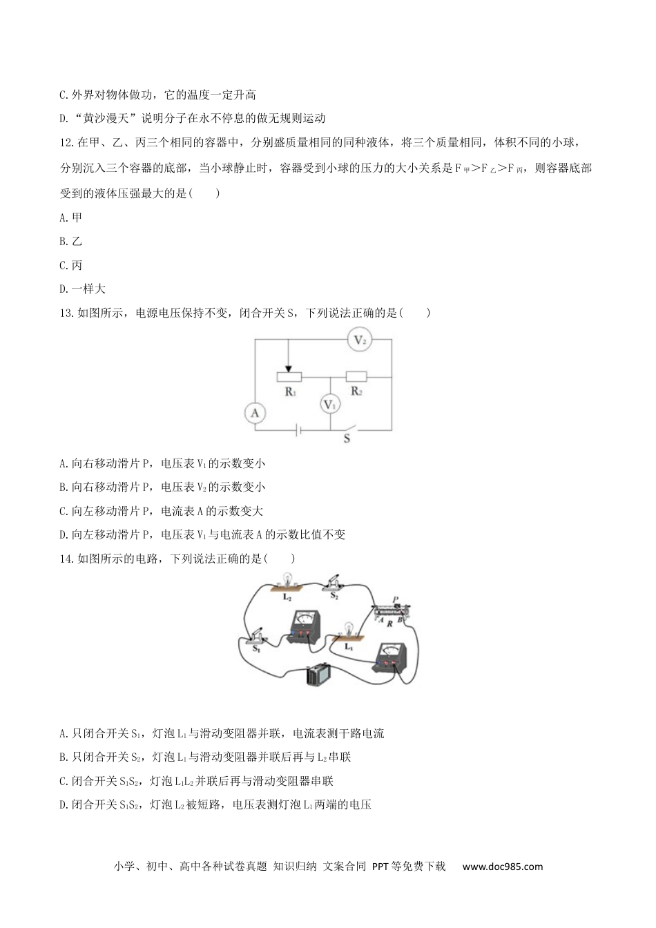 小学、初中、高中各种试卷真题知识归纳文案合同PPT等免费下载www.doc985.com2016年甘肃省兰州市中考物理真题一、选择题(共16小题,每小题3分,满分48分)1.下列物态变化中属于液化的是()A.加在饮料中的冰块逐渐变小B.飞机在蔚蓝的天空飞过,留下长长的“尾巴”C.樟脑丸越放越小D.冰箱冷藏室的内壁结出“白霜”2.关于声现象,下列说法正确的是()A.人耳听不到次声波,是因为响度太小B.大声说话是为了提高声音的音调C.用超声波清洗眼镜片,说明超声波能够传递能量D.关上窗户可以减小窗外噪声的影响,说明声音在固体中传播速度慢3.关于光现象,下列说法正确的是()A.凸透镜只对平行光线有会聚作用B.人向平面镜走近时,他在镜中的像逐渐变大C.黑板面反光是由于光发生漫反射造成的D.日食的形成是由于月球挡住了太阳射向地球的光4.下列说法正确的是()A.原子核是由质子和电子组成B.天文观察发现,所用核外星系都在远离我们,这说明宇宙处于普遍的膨胀之中C.由公式可知,电磁波的频率越高,传播速度越快D.制作LED灯的材料是超导体5.关于质量和密度,下列说法正确的是()A.物体质量的大小与地理位置无关B.同种物质组成的物体,体积大的密度小C.冰熔化成水,密度变小D.物质的密度与质量成正比6.关于磁现象,下列说法正确的是()A.铜、铁、铝都是磁性材料B.地磁场的S极在地理的北极附近小学、初中、高中各种试卷真题知识归纳文案合同PPT等免费下载www.doc985.comC.磁场是由磁感线组成的D.导体在磁场中运动就会产生磁感应电流7.下列说法正确的是()A.物体的运动速度越大,惯性越大B.同一物体匀速上升时,速度越快,所受拉力越大C.运动的物体,如果不受力的作用就会慢慢停下来D.两个相互不接触的物体,也可能会产生力的作用8.(多选)关于压力和压强,下列说法正确的是()A.水坝建成上窄下宽的形状,是由于水对坝的压强随深度的增加而增大B.飞机的机翼能获得向上的升力,是利用了流体速度越大压强越小的原理C.大气压强随着海拔高度的增加而增大D.刀刃磨得很锋利,是为了增大压强9.下列说法不正确的是()A.能量的转化过程中是守恒的,所以能源是“取之不尽,用之不竭”的B.植物的光合作用是将光能转化为化学能C.为节约能源,我们应该从小养成“人走灯关”的好习惯D.在能源的利用中,总会有一部分能量未被利用就损失了10.如图所示,用20N的力F拉着重为100N的物体,使其沿水平面以2m/s的速度匀速运动了5s,若每个滑轮重10N,忽略绳重和滑轮轴的摩擦,则下列说法正确的是()A.拉力F做的功为200JB.拉力F的功率为120WC.滑轮组对物体做的有用功为400JD.滑轮组对物体所做有用功的功率为60W11.下列说法正确的是()A.物体的内能增加,它的温度一定升高B.汽油机在吸气冲程中吸入气缸的是汽油和空气的混合物小学、初中、高中各种试卷真题知识归纳文案合同PPT等免费下载www.doc985.comC.外界对物体做功,它的温度一定升高D.“黄沙漫天”说明分子在永不停息的做无规则运动12.在甲、乙、丙三个相同的容器中,分别盛质量相同的同种液体,将三个质量相同,体积不同的小球,分别沉入三个容器的底部,当小球静止时,容器受到小球的压力的大小关系是F甲>F乙>F丙,则容器底部受到的液体压强最大的是()A.甲B.乙C.丙D.一样大13.如图所示,电源电压保持不变,闭合开关S,下列说法正确的是()A.向右移动滑片P,电压表V1的示数变小B.向右移动滑片P,电压表V2的示数变小C.向左移动滑片P,电流表A的示数变大D.向左移动滑片P,电压表V1与电流表A的示数比值不变14.如图所示的电路,下列说法正确的是()A.只闭合开关S1,灯泡L1与滑动变阻器并联,电流表测干路电流B.只闭合开关S2,灯泡L1与滑动变阻器并联后再与L2串联C.闭合开关S1S2,灯泡L1L2并联后再与滑动变阻器串联D.闭合开关S1S2,灯泡L2被短路,电压表测灯泡L1两端的电压小学、初中、高中各种试卷真题知识归纳文案合同PPT等免费下载www.doc985.com15.如图所示的电路,电源电压保持不变,电阻R1、R2的阻值分别为10Ω和20Ω,只闭合开关S1,将滑片P移到中点,电压表示数为6V,电阻R1的功率为P1,闭合开关S1、S2,将滑片移到最左端,电阻R2的功率为P2,若P1:P2=2:9.则下列说法正确的是()...