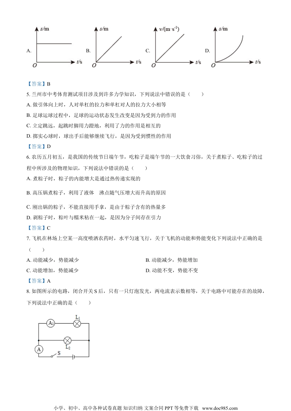 2021年兰州市中考物理、化学合卷(B)物理部分一、选择题:本大题11小题,每小题3分,共33分。在每小题给出的四个选项中,只有一个选项是符合题目要求的。1.下列现象中属于光的直线传播的是()A.猫在镜中的像B.水中的筷子弯折C.水杯的影子D.手机相机拍照【答案】C2.“赏中华诗词、寻文化基因、品生活之美”的《中国诗词大会》,深受观众的青睐。下列对古诗文中涉及的各种物理现象解释错误的是()A.“清风不识字,何故乱翻书”,清风翻书,是因为书本上方空气流速变大,压强变小B.“青青园中葵,朝露待日晞”,露在日出后逐渐消失是升华现象,需要吸热C.“臣心一片磁针石,不指南方不肯休”,“指南方”的一端是“磁针石”的S极D.“柴门闻犬吠,风雪夜归人”,这说明声音可以传递信息【答案】B3.新材料广泛应用于社会的各个领域,关于新材料的应用,下列说法中错误的是()A.超导材料用于制作电饭锅的发热体,可提高发热效率B.硅光电池能够把太阳能直接转化为电能,且完全不会造成污染C.使用记忆合金弹簧制作的淋浴恒温阀门,实现了智能调节水温D.纳米陶瓷具有一定的韧性,可以制造发动机缸体【答案】A4.如图所示,能正确反映物体做匀速直线运动的图像是()小学、初中、高中各种试卷真题知识归纳文案合同PPT等免费下载www.doc985.comA.B.C.D.【答案】B5.兰州市中考体育测试项目涉及到许多力学知识,下列说法中错误的是()A.做引体向上时,人对单杠的拉力和单杠对人的拉力大小相等B.足球运球过程中,足球的运动状态发生改变是因为受到力的作用C.立定跳远,起跳时脚用力蹬地,利用了力的作用是相互的D.掷实心球时,球出手后能够继续飞行,是因为受到惯性的作用【答案】D6.农历五月初五,是我国的传统节日端午节,吃粽子是端午节的一大饮食习俗,关于煮粽子、吃粽子的过程中所涉及的物理知识,下列说法中错误的是()A.煮粽子时,粽子的内能增大是通过热传递实现的B.高压锅煮粽子,利用了液体的沸点随气压增大而升高的原因C.刚出锅的粽子,不能直接用手拿,是由于粽子含有的热量多D.剥粽子时,粽叶与糯米粘在一起,是因为分子间存在引力【答案】C7.飞机在林场上空某一高度喷洒农药时,水平匀速飞行,关于飞机的动能和势能变化下列说法中正确的是()A.动能减少,势能减少B.动能减少,势能增加C.动能增加,势能减少D.动能不变,势能不变【答案】A8.如图所示的电路,闭合开关S后,只有一只灯泡发光,两电流表示数相等,关于电路中可能存在的故障,下列说法中正确的是()小学、初中、高中各种试卷真题知识归纳文案合同PPT等免费下载www.doc985.comA.断路B.断路C.短路D.短路【答案】B9.用如图所示的滑轮组提升重物,在电动机拉力的作下,重为40N的物体在10s内匀速竖直上升了2m,已知动滑轮重为8N,忽略绳重与摩擦。下列说法中正确的是()A.电动机对绳的拉力为12NB.绳子自由端的移动速度为0.2m/C.滑轮组的机械效率为80%D.有用功的功率为8W【答案】D10.如图所示的电路,电源电压恒定不变,为定值电阻,闭合开关S,将滑片P从a端向b端移动的过程中,下列说法正确的是()A.灯泡L变暗,电压表示数变小,电流表示数变小B.灯泡L变亮,电压表示数变大,电流表示数变大C.灯泡L变亮,电压表示数变小,电流表示数变大D.灯泡L变暗,电压表示数变大,电流表示数变小【答案】C小学、初中、高中各种试卷真题知识归纳文案合同PPT等免费下载www.doc985.com11.如图所示,电源电压恒为6V,电流表量程为,电压表量程为,定值电阻的阻值为10Ω,滑动变阻器的规格为“”。闭合开关S,在确保电路安全的前提下,移动滑动变阻器的滑片P,下列说法中正确的是()A.电路消耗的最大总功率为3WB.电流表示数的变化范围为C.滑动变阻器接入电路的最小阻值为2ΩD.电阻消耗的最大功率为0.9W【答案】D二、填空题:本大题5小题,每空1分,共10分。12.生产和生活中处处蕴含着物理知识,人们利用_______原理在水坝上修筑了船闸;注射器吸取药液时,药液是在_______的作用下进入注射器的。【答案】①.连通器②.大气压13.常见的温度计是利用液体________的性质制成的,一定质量的冰熔化成水的过程中温度_________(选填“不断...