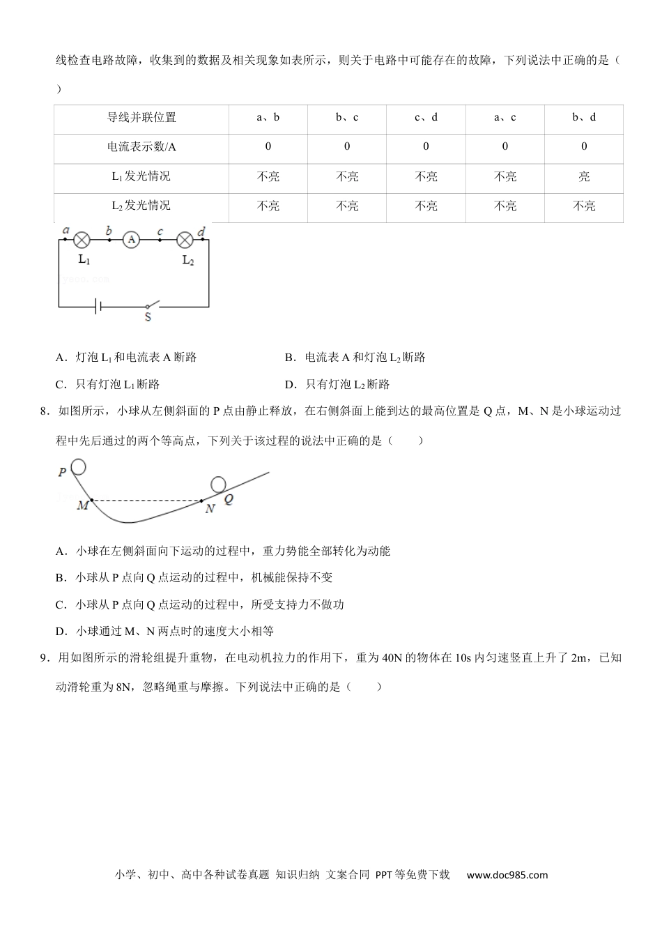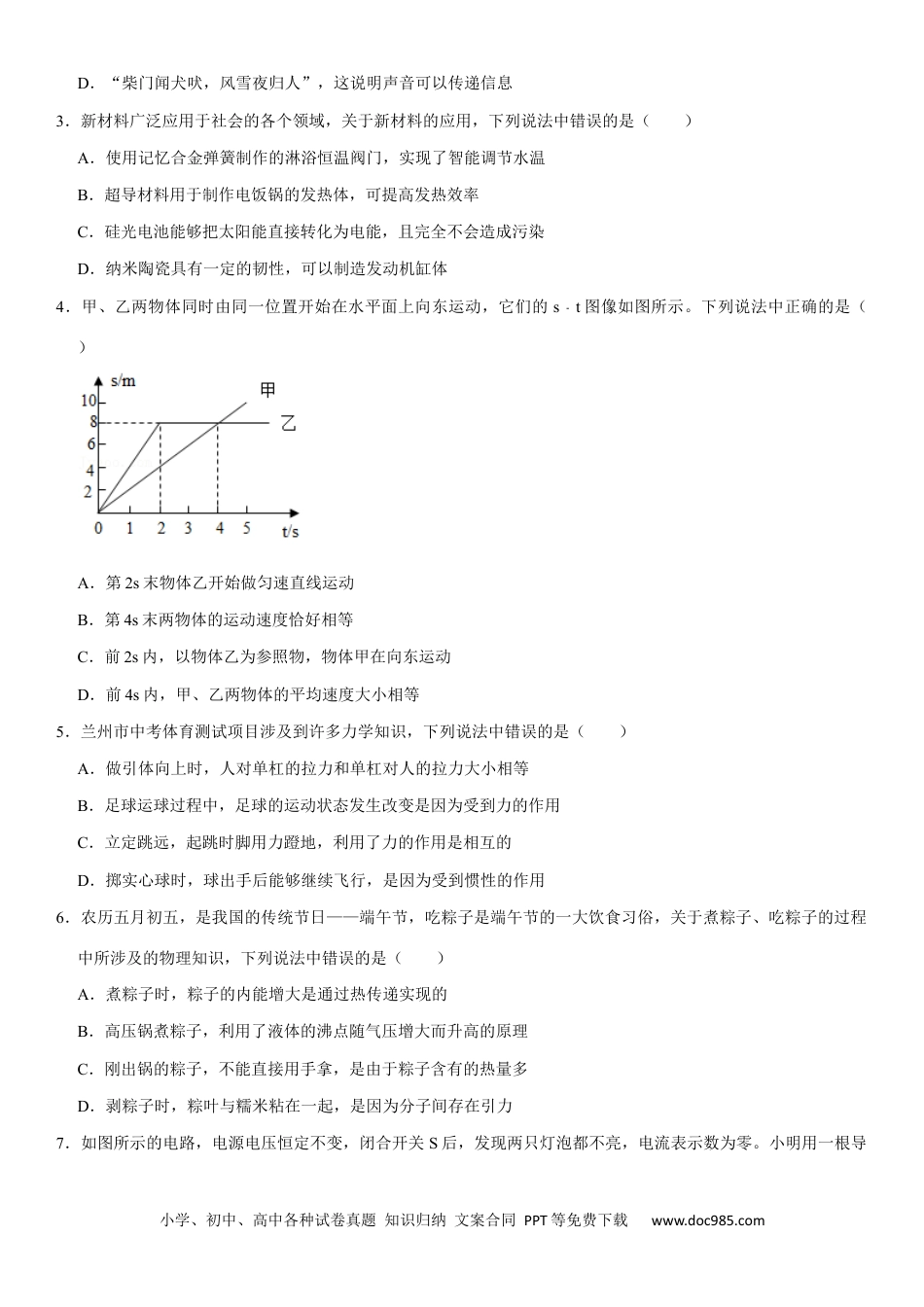 小学、初中、高中各种试卷真题知识归纳文案合同PPT等免费下载www.doc985.com2021年甘肃省兰州市中考物理试卷(A)一、选择题:本大题11小题,每小题3分,共33分。在每小题给出的四个选项中,只有一个选项是符合题目要求的。1.下列光现象中属于光的反射的是()A.猫在镜中的像B.水中的筷子弯折C.水杯的影子D.手机相机拍照2.“赏中华诗词、寻文化基因、品生活之美”的《中国诗词大会》,深受观众的青睐。下列对古诗文中涉及的各种物理现象解释错误的是()A.“臣心一片磁针石,不指南方不肯休”,“指南方”的一端是“磁针石”的S极B.“清风不识字,何故乱翻书”,清风翻书,是因为书本上方空气流速变大,压强变小C.“青青园中葵,朝露待日晞”,露在日出后逐渐消失是升华现象,需要吸热小学、初中、高中各种试卷真题知识归纳文案合同PPT等免费下载www.doc985.comD.“柴门闻犬吠,风雪夜归人”,这说明声音可以传递信息3.新材料广泛应用于社会的各个领域,关于新材料的应用,下列说法中错误的是()A.使用记忆合金弹簧制作的淋浴恒温阀门,实现了智能调节水温B.超导材料用于制作电饭锅的发热体,可提高发热效率C.硅光电池能够把太阳能直接转化为电能,且完全不会造成污染D.纳米陶瓷具有一定的韧性,可以制造发动机缸体4.甲、乙两物体同时由同一位置开始在水平面上向东运动,它们的st﹣图像如图所示。下列说法中正确的是()A.第2s末物体乙开始做匀速直线运动B.第4s末两物体的运动速度恰好相等C.前2s内,以物体乙为参照物,物体甲在向东运动D.前4s内,甲、乙两物体的平均速度大小相等5.兰州市中考体育测试项目涉及到许多力学知识,下列说法中错误的是()A.做引体向上时,人对单杠的拉力和单杠对人的拉力大小相等B.足球运球过程中,足球的运动状态发生改变是因为受到力的作用C.立定跳远,起跳时脚用力蹬地,利用了力的作用是相互的D.掷实心球时,球出手后能够继续飞行,是因为受到惯性的作用6.农历五月初五,是我国的传统节日——端午节,吃粽子是端午节的一大饮食习俗,关于煮粽子、吃粽子的过程中所涉及的物理知识,下列说法中错误的是()A.煮粽子时,粽子的内能增大是通过热传递实现的B.高压锅煮粽子,利用了液体的沸点随气压增大而升高的原理C.刚出锅的粽子,不能直接用手拿,是由于粽子含有的热量多D.剥粽子时,粽叶与糯米粘在一起,是因为分子间存在引力7.如图所示的电路,电源电压恒定不变,闭合开关S后,发现两只灯泡都不亮,电流表示数为零。小明用一根导小学、初中、高中各种试卷真题知识归纳文案合同PPT等免费下载www.doc985.com线检查电路故障,收集到的数据及相关现象如表所示,则关于电路中可能存在的故障,下列说法中正确的是()导线并联位置a、bb、cc、da、cb、d电流表示数/A00000L1发光情况不亮不亮不亮不亮亮L2发光情况不亮不亮不亮不亮不亮A.灯泡L1和电流表A断路B.电流表A和灯泡L2断路C.只有灯泡L1断路D.只有灯泡L2断路8.如图所示,小球从左侧斜面的P点由静止释放,在右侧斜面上能到达的最高位置是Q点,M、N是小球运动过程中先后通过的两个等高点,下列关于该过程的说法中正确的是()A.小球在左侧斜面向下运动的过程中,重力势能全部转化为动能B.小球从P点向Q点运动的过程中,机械能保持不变C.小球从P点向Q点运动的过程中,所受支持力不做功D.小球通过M、N两点时的速度大小相等9.用如图所示的滑轮组提升重物,在电动机拉力的作用下,重为40N的物体在10s内匀速竖直上升了2m,已知动滑轮重为8N,忽略绳重与摩擦。下列说法中正确的是()小学、初中、高中各种试卷真题知识归纳文案合同PPT等免费下载www.doc985.comA.电动机对绳的拉力为12NB.绳子自由端的移动速度为0.2m/sC.滑轮组的机械效率为80%D.有用功的功率为8W10.将阻值不同的电阻R1、R2按甲图所示电路连接,闭合开关S后,电流表示数为0.6A;保持电源电压不变,再将电阻R1、R2按乙图所示电路进行改接,闭合开关S后,关于电流表的示数,下列说法中正确的是()A.一定小于0.6AB.一定大于2.4AC.一定大于0.6A,但小于1.2AD.一定大于1.2A,但小于2.4A11.如图所...