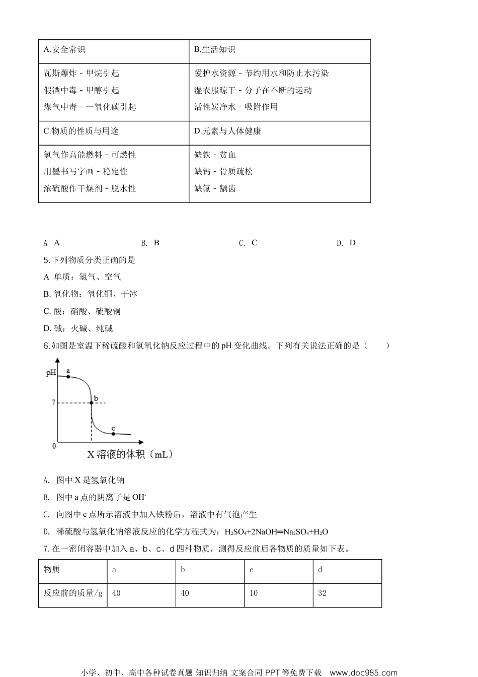 甘肃省天水市2020年初中毕业与升学考试(中考)化学试卷可能用到相对原子质量:H:1C:120:16Na:23C1:35.5Mg:24一、选择题((每小题只有一个选项符合题意。每小题2分,共30分)1.下列只发生物理变化的是()A.比较金属的活动性B.电解水C.过滤泥浆水D.食物霉变2.学校花圃所种的花卉缺乏氮元素和钾元素。如果只施用一种化肥,则应施用()A.硝酸钾B.碳酸钾C.尿素D.碳酸氢铵3.下列实验操作错误的是A.加热液体B.检查装置的气密性C.蒸发结晶D.滴加试剂4.下列总结的化学知识有错误的一组是;小学、初中、高中各种试卷真题知识归纳文案合同PPT等免费下载www.doc985.comA.安全常识B.生活知识瓦斯爆炸﹣甲烷引起假酒中毒﹣甲醇引起煤气中毒﹣一氧化碳引起爱护水资源﹣节约用水和防止水污染湿衣服晾干﹣分子在不断的运动活性炭净水﹣吸附作用C.物质的性质与用途D.元素与人体健康氢气作高能燃料﹣可燃性用墨书写字画﹣稳定性浓硫酸作干燥剂﹣脱水性缺铁﹣贫血缺钙﹣骨质疏松缺氟﹣龋齿A.AB.BC.CD.D5.下列物质分类正确的是A.单质:氢气、空气B.氧化物:氧化铜、干冰C.酸:硝酸、硫酸铜D.碱:火碱、纯碱6.如图是室温下稀硫酸和氢氧化钠反应过程中的pH变化曲线。下列有关说法正确的是()A.图中X是氢氧化钠B.图中a点的阴离子是OH-C.向图中c点所示溶液中加入铁粉后,溶液中有气泡产生D.稀硫酸与氢氧化钠溶液反应的化学方程式为:H2SO4+2NaOH═Na2SO4+H2O7.在一密闭容器中加入a、b、c、d四种物质,测得反应前后各物质的质量如下表。物质abcd反应前的质量/g40401032小学、初中、高中各种试卷真题知识归纳文案合同PPT等免费下载www.doc985.com反应后的质量/g12x100下列说法正确的是()A.x等于90B.b可能是单质C.c一定是催化剂D.参加反应的a与d的质量比为7:88.下列各组离子在溶液中能大量共存,并能使紫色石蕊溶液变蓝的是A.H+、Ba2+、NO、COB.Ca2+、K+、NO、Cl-C.Na+、Ba2+、OH-、SOD.Na+、Ba2+、OH-、Cl-9.为了达到实验目的,下列方案或结论正确的是选项实验目的实验方案或结论A除去铁粉中的三氧化二铁取样,加入足量盐酸,过滤B除去KOH溶液中的K2CO3取样、溶解、加入足量的稀盐酸,蒸发C鉴别碳粉、铁粉和氧化铜粉末取样后,分别加入稀盐酸D鉴别某溶液中是否含有SO取少量溶液于试管中,滴加BaCl2溶液,有白色沉淀生成,则该溶液中一定有SOA.AB.BC.CD.D10.下列实验设计不合理的是A.探究燃烧的条件小学、初中、高中各种试卷真题知识归纳文案合同PPT等免费下载www.doc985.comB.探究铁生锈的条件C.探究不同溶质在同种溶剂中的溶解性D.探究二氧化锰可催化过氧化氢溶液11.下列推理合理的是A.单质中只含一种元素,但是只含一种元素的物质不一定是单质B.因为H2O和H2O2的组成元素相同,所以它们的化学性质相同C.置换反应中一定有单质生成,则有单质生成的化学反应一定是置换反应D.因为碱溶液呈碱性,所以显碱性的溶液一定都是碱的溶液12.下列图像分别与选项的操作相对应,其中合理的是A.向两份等质量,相同质量分数的稀硫酸中,分别不断加入镁粉和锌粉小学、初中、高中各种试卷真题知识归纳文案合同PPT等免费下载www.doc985.comB.向一定质量二氧化锰固体中加入一定质量的过氧化氢溶液C.温度不变,向一定质量饱和氢氧化钙溶液中加入氧化钙D.向一定质量硫酸和硫酸铜的混合溶液中加入氢氧化钠溶液。13.下列各组物质的溶液,不用其他试剂,无法将其一一区别的是A.(NH4)2SO4NaClNH4ClBa(OH)2B.H2SO4NaOHNa2SO4FeCl3C.CaCl2Na2SO4Na2CO3NaNO3D.HClH2SO4BaCl2K2CO314.氨催化氧化是制硝酸的主要反应之一,该反应前后分子种类变化的微观示意图如图。下列说法正确的是()A.生成的丙与丁的分子个数比为2:3B.乙的相对分子质量为32gC.反应前后分子的个数不变D.反应过程中共涉及三种氧化物15.将金属M的粉末放入盛有硝酸铜溶液的烧杯中,充分反应后,溶液呈无色,继续向烧杯中加入一定量的硝酸银溶液,充分反应后过滤,得到滤渣和蓝色滤液。根据上述实验分析,下列说法错误的是()小学、初中、高中各种试卷真题知识归纳文案合同PPT等免费下载www.doc985.comA.金属活动性强弱顺序:M>Cu>AgB.滤渣中可能有金属MC.滤液...