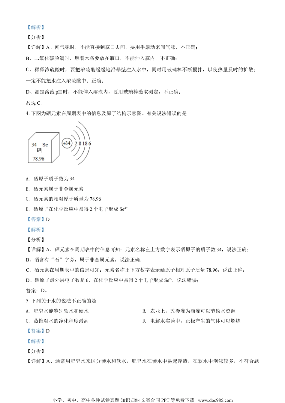 2021甘肃省兰州市中考化学真题解析一、选择题1.在2021年两会上李克强总理指出,要打好节能减排和环境治理攻坚战。下列做法与此不相符的是A.推广新能源汽车的使用B.积极执行兰州市升级版“限塑令”C.大量使用农药、化肥D.工业废水处理达标后排放【答案】C【解析】【分析】【详解】A、推广使用新能源汽车既能节约能源,又能减少污染物的排放,做法合理;故不符合题意。B、坚决执行限塑令,可减少白色污染,利于地球保护;故不符合题意。C、大量使用农药、化肥会造成水体污染和土壤污染,不符合该理念,符合题意。D、工业废水处理达标后排放,能防止水体的污染,行为可取;故不符合题意。故选C。2.兰州牛肉面享有“中华第一面”的美景。下列食材富含蛋白质的是A.牛肉B.面条C.萝卜D.辣椒油【答案】A【解析】【分析】【详解】牛肉富含蛋白质,面条富含糖类,萝卜、辣椒油富含维生素。故选A。3.下列实验操作正确的是A.闻气味B.二氧化碳验满C.浓硫酸稀释D.测定溶液pH【答案】C小学、初中、高中各种试卷真题知识归纳文案合同PPT等免费下载www.doc985.com【解析】【分析】【详解】A、闻气味时,不能直接到瓶口去闻,要用手扇动来闻气味,不正确;B、二氧化碳验满时,燃着木条要放在瓶口,不能伸入瓶内,不正确;C、稀释浓硫酸时,要把浓硫酸缓缓地沿器壁注入水中,同时用玻璃棒不断搅拌,以使热量及时的扩散;一定不能把水注入浓硫酸中;正确;D、测定溶液pH时,不能伸入溶液内,要用玻璃棒蘸取测定,不正确;故选C。4.下图为硒元素在周期表中的信息及原子结构示意图。有关说法错误的是A.硒原子质子数为34B.硒元素属于非金属元素C.硒元素的相对原子质量为78.96D.硒原子在化学反应中易得2个电子形成Se2+【答案】D【解析】【分析】【详解】A、硒元素在周期表中的信息可知:元素名称左上方数字表示硒原子的质子数34,说法正确;B、硒含有“石”字旁,属于非金属元素,说法正确;C、硒元素在周期表中的信息可知:元素名称正下方数字表示硒原子相对原子质量78.96,说法正确;D、硒原子最外层电子数是6,在化学反应中易得2个电子形成Se2-,说法错误;答案:D。5.下列关于水的说法不正确的是A.肥皂水能鉴别软水和硬水B.农业上,改漫灌为滴灌可以节约水资源C.蒸馏对水的净化程度最高D.电解水实验中,正极产生的气体可以燃烧【答案】D【解析】【分析】【详解】A、通常用肥皂水来区分硬水和软水,肥皂水在硬水中易起浮渣,在软水中泡沫较多,不符合题小学、初中、高中各种试卷真题知识归纳文案合同PPT等免费下载www.doc985.com意;B、农业上,改漫灌为滴灌可以节约水资源,保护水源,不符合题意;C、蒸馏可除去所有杂质,对水的净化程度最高,不符合题意;D、在电解水实验中,“正氧负氢”,负极产生的气体可以燃烧,符合题意。故选D。6.下列有关燃烧和灭火的说法不正确的是A.燃烧是一种缓慢的氧化反应B.“釜底抽薪”蕴含的灭火原理是清除可燃物C.温度达到着火点,可燃物不一定燃烧D.篝火晚会时架空火柴,有利于木材充分燃烧【答案】A【解析】【分析】【详解】A、燃烧是一种剧烈的、发光、发热的氧化反应,说法错误;B、“釜底抽薪”蕴含的灭火原理是清除可燃物,说法正确;C、物质燃烧同时具备三个条件:可燃物、达到物质燃烧的着火点、与氧气接触,温度达到着火点,可燃物不一定燃烧,说法正确;D、篝火晚会时架空火柴,可燃物与氧气充分接触,有利于木材充分燃烧,说法正确;答案:A。7.物质的用途主要由其性质决定。下列对应关系不正确的是A.一氧化碳具有还原性——冶炼金属B.熟石灰能与酸反应——改良酸性土壤C.金刚石硬度大——裁割玻璃D.苏打能与酸反应——治疗胃酸过多【答案】D【解析】【分析】【详解】A、一氧化碳具有还原性,高温条件下可以夺走金属氧化物中氧元素,可用于冶炼金属,说法正确;B、熟石灰与酸反应生成盐和水,可用于改良酸性土壤,说法正确;C、金刚石硬度大,可用于裁割玻璃,说法正确;D、苏打碱性较强,不能用于治疗胃酸过多,一般用小苏打治疗胃酸过多;答案:D。小学、初中、高中各种试卷真题知识归纳文案合同PPT等免费下载www.doc985.com8.小强在了解氯元素的相关知识...