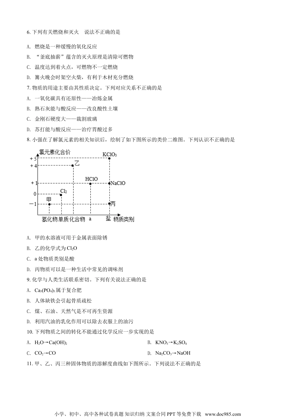 2021甘肃省兰州市中考化学真题解析一、选择题1.在2021年两会上李克强总理指出,要打好节能减排和环境治理攻坚战。下列做法与此不相符的是A.推广新能源汽车的使用B.积极执行兰州市升级版“限塑令”C.大量使用农药、化肥D.工业废水处理达标后排放2.兰州牛肉面享有“中华第一面”的美景。下列食材富含蛋白质的是A.牛肉B.面条C.萝卜D.辣椒油3.下列实验操作正确的是A.闻气味B.二氧化碳验满C.浓硫酸稀释D.测定溶液pH4.下图为硒元素在周期表中的信息及原子结构示意图。有关说法错误的是A.硒原子质子数为34B.硒元素属于非金属元素C.硒元素的相对原子质量为78.96D.硒原子在化学反应中易得2个电子形成Se2+5.下列关于水的说法不正确的是A.肥皂水能鉴别软水和硬水B.农业上,改漫灌为滴灌可以节约水资源C.蒸馏对水的净化程度最高D.电解水实验中,正极产生的气体可以燃烧小学、初中、高中各种试卷真题知识归纳文案合同PPT等免费下载www.doc985.com6.下列有关燃烧和灭火的说法不正确的是A.燃烧是一种缓慢的氧化反应B.“釜底抽薪”蕴含的灭火原理是清除可燃物C.温度达到着火点,可燃物不一定燃烧D.篝火晚会时架空火柴,有利于木材充分燃烧7.物质的用途主要由其性质决定。下列对应关系不正确的是A.一氧化碳具有还原性——冶炼金属B.熟石灰能与酸反应——改良酸性土壤C.金刚石硬度大——裁割玻璃D.苏打能与酸反应——治疗胃酸过多8.小强在了解氯元素的相关知识后,绘制了如下图所示的类价二维图。下列认识不正确的是A.甲的水溶液可用于金属表面除锈B.乙的化学式为Cl2OC.a处物质类别是酸D.丙物质可以是一种生活中常见的调味剂9.化学与人类生活联系密切。下列有关说法正确的是A.Ca3(PO4)3属于复合肥B.人体缺铁会引起骨质疏松C.煤、石油、天然气是不可再生资源D.利用汽油的乳化作用可以除去衣服上的油污10.下列物质之间的转化不能通过化学反应一步实现的是A.H2O→Ca(OH)2B.KNO3→K2SO4C.CO2→COD.Na2CO3→NaOH11.甲、乙、丙三种固体物质的溶解度曲线如下图所示。下列说法不正确的是小学、初中、高中各种试卷真题知识归纳文案合同PPT等免费下载www.doc985.comA.P点表示t2℃时,甲和乙的溶解度相等B.t3℃时Q点表示甲的不饱和溶液C.t3℃时,将25g乙放入50g水中,所得溶液中溶质和溶剂的质量比为2:5D.将t3℃时甲、乙、丙的饱和溶液降温至t1℃,溶质的质量分数由大到小的顺序为丙>甲>乙12.下列实验不能达到实验目的的是A.实验1探究铁锈蚀是否于水有关B.实验2探究二氧化碳是否与水发生反应C.实验3测定空气中氧气的含量D.实验4探究氢氧化钠与盐酸能否发生反应小学、初中、高中各种试卷真题知识归纳文案合同PPT等免费下载www.doc985.com13.下列图像与所对应操作相符的是A.用两份等质量的氯酸钾制取氧气B.向一定量的氢氧化钠溶液中滴加水C.向足量相同溶质质量分数的稀硫酸中分别加入等质量Zn粉、Al粉、Mg粉D.向硫酸和硫酸铜的混合溶液中逐滴加入烧碱溶液至过量14.下列实验操作不能达到实验目的的是选项实验目的实验操作A除去NaNO3溶液中的KCl加入适量AgNO3溶液,过滤B除去CO2中混有的少量HCl气体依次通入装有足量饱和NaHCO3溶液和浓硫酸的洗气瓶C鉴别真假黄金灼烧D检验O2中是否混有CO2通入澄清石灰水A.AB.BC.CD.D小学、初中、高中各种试卷真题知识归纳文案合同PPT等免费下载www.doc985.com15.在一定条件下,某反应前后各物质的质量如下表所示,下列说法不正确的是MNt0时刻的质量/g166450t1时刻的质量/g1248a9t2时刻的质量/g0049bA.b=36B.t1时刻,M和N的质量比为3:1C.该反应中,和的化学计量系数之比为1:1D.反应前后,元素和原子的种类均不变二、填空与简答题16.“奋斗者号”载人潜水器在2020年11月10日创造了中国潜入马里亚纳海沟10909米的新纪录。其外壳和载人舱由强度高、抗压力强的钛合金制造。(1)钛合金属于_________。A合成材料B金属材料C天然材料D复合材料(2)工业上通常是在高温条件下,在氩气保护的环境中,用四氯化钛(TiCl4)与金属镁反应获得金属钛和氯化镁,该反应的化学方程式为_________。(3)“奋斗者号”使用的锂电池正极为磷酸亚铁锂(LiFePO4),其中锂元素的化合价为+1价,则磷酸亚铁...