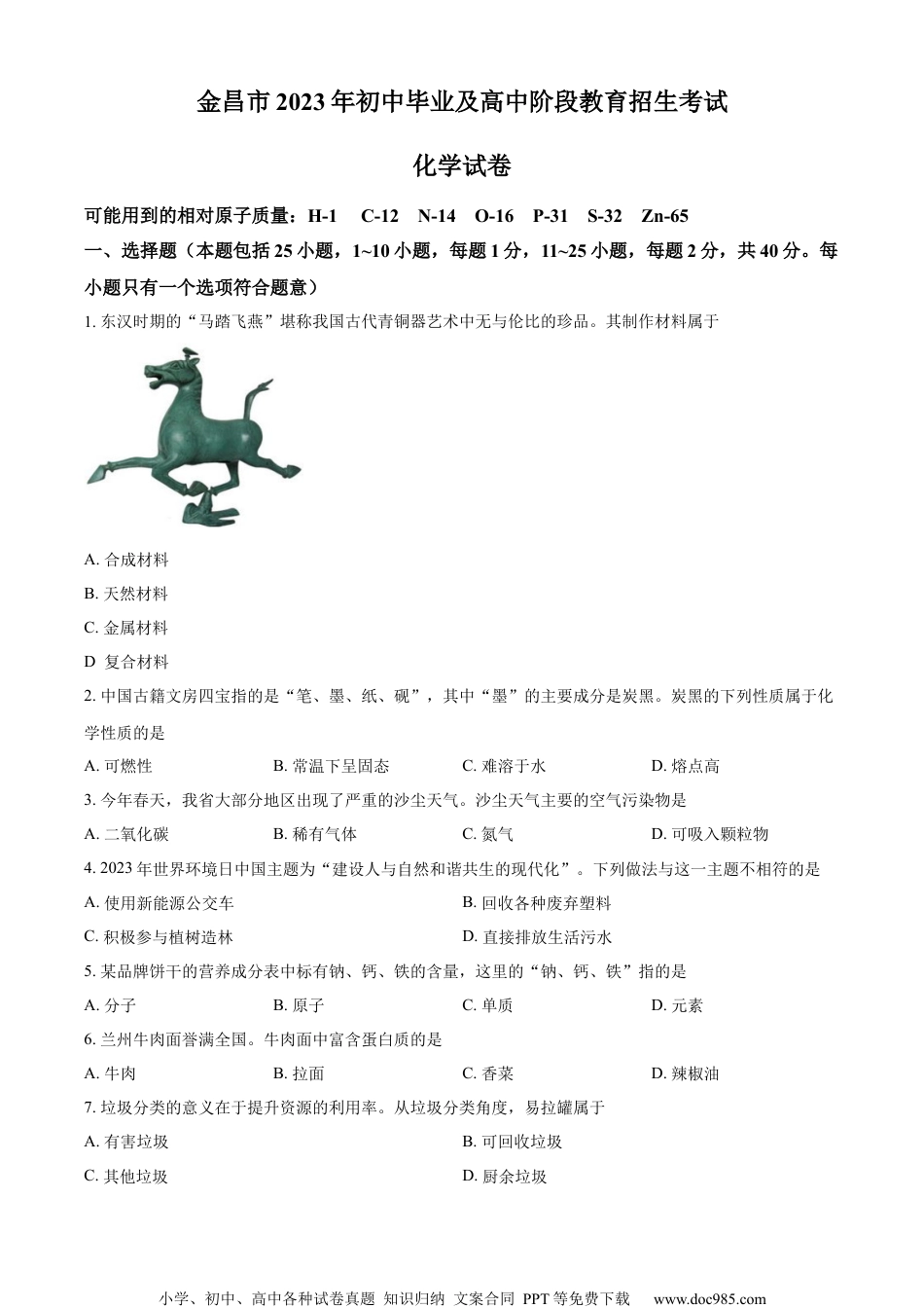 小学、初中、高中各种试卷真题知识归纳文案合同PPT等免费下载www.doc985.com金昌市2023年初中毕业及高中阶段教育招生考试化学试卷可能用到的相对原子质量:H-1C-12N-14O-16P-31S-32Zn-65一、选择题(本题包括25小题,1~10小题,每题1分,11~25小题,每题2分,共40分。每小题只有一个选项符合题意)1.东汉时期的“马踏飞燕”堪称我国古代青铜器艺术中无与伦比的珍品。其制作材料属于A.合成材料B.天然材料C.金属材料D.复合材料2.中国古籍文房四宝指的是“笔、墨、纸、砚”,其中“墨”的主要成分是炭黑。炭黑的下列性质属于化学性质的是A.可燃性B.常温下呈固态C.难溶于水D.熔点高3.今年春天,我省大部分地区出现了严重的沙尘天气。沙尘天气主要的空气污染物是A.二氧化碳B.稀有气体C.氮气D.可吸入颗粒物4.2023年世界环境日中国主题为“建设人与自然和谐共生的现代化”。下列做法与这一主题不相符的是A.使用新能源公交车B.回收各种废弃塑料C.积极参与植树造林D.直接排放生活污水5.某品牌饼干的营养成分表中标有钠、钙、铁的含量,这里的“钠、钙、铁”指的是A.分子B.原子C.单质D.元素6.兰州牛肉面誉满全国。牛肉面中富含蛋白质的是A.牛肉B.拉面C.香菜D.辣椒油7.垃圾分类的意义在于提升资源的利用率。从垃圾分类角度,易拉罐属于A.有害垃圾B.可回收垃圾C.其他垃圾D.厨余垃圾小学、初中、高中各种试卷真题知识归纳文案合同PPT等免费下载www.doc985.com8.合理使用化肥对“发展粮食产业,助力乡村振兴”具有重要意义。下列化肥属于复合肥的是A.KNO3B.K2SO4C.CO(NH2)2D.Ca(H2PO4)29.下列物质露置在空气中,不受空气成分明显影响的是A.生石灰B.苛性钠C.氯化钠D.浓硫酸10.元素周期表是学习化学的工具。发现元素周期律并编制元素周期表的化学家是A.拉瓦锡B.道尔顿C.门捷列夫D.阿伏加德罗11.化学与生活息息相关。下列说法不正确的是A.人体缺碘会引起甲状腺肿大B.刷油漆防止铁栏杆生锈C.用洗涤剂去除餐盘上的油污D.用甲醛溶液浸泡的食品可以食用12.了解防灾减灾知识有利于保护人民的生命及财产安全。下列说法不正确的是A.加油站、煤粉厂等场所应严禁烟火B.生活中常用水来灭火,其原理是降低可燃物的着火点C.一旦发生火灾,应用湿毛巾捂住口鼻,迅速逃离并拨打火警电话119D.森林发生火灾,可在大火蔓延的线路上砍掉一片树林设置隔离带来灭火13.正确的化学实验操作是实验成功和人身安全的重要保证。下列实验操作正确的是A.给液体加热B.过滤C.检查装置的气密性D.稀释浓硫酸14.小李同学用pH计测得生活中一些物质的pH如下表所示。下列说法正确的是物质肥皂水牙膏西瓜汁洁厕灵pH10.28.55.81.4A.牙膏显酸性B.西瓜汁的酸性比洁厕灵的酸性强C.肥皂水使紫色石蕊溶液显红色D.蚊虫叮咬处可涂抹牙膏或肥皂水15.下列对宏观事实的微观解释不正确的是A.端午时节粽飘香——分子在不停地运动小学、初中、高中各种试卷真题知识归纳文案合同PPT等免费下载www.doc985.comB.水通电生成氢气和氧气——水由氢分子和氧分子构成C.一氧化碳能燃烧,二氧化碳不能燃烧——不同种分子的性质不同D.稀盐酸和稀硫酸化学性质相似——溶液中都含有氢离子16.2022年6月5日神舟十四号载人飞船发射成功,NiFe2O4可作为催化剂将航天员呼出的CO2转化为O2,已知NiFe2O4中Fe为+3价,则Ni的化合价为A.+1B.+2C.+3D.+417.下列有关实验现象的描述,正确的是A.打开盛有浓盐酸试剂瓶的瓶盖,出现大量的白烟B.镁条在空气中燃烧,发出耀眼的白光,生成黑色固体物质C.硫磺粉在空气中燃烧产生淡蓝色火焰,生成无色有刺激性气味的气体D.铁丝在氧气中剧烈燃烧,火星四射,生成白色物质18.天宫课堂中,航天员王亚平视频展示了在无容器材料实验柜中进行的“锆金属熔化与凝固”实验。下图是锆元素在元素周期表中的信息及原子结构示意图。下列说法错误的是A.锆原子的质子数为40B.氯化锆的化学式可能为ZrCl2C.锆元素的相对原子质量为91.22gD.锆原子在化学反应中容易失去2个电子19.以科学原理和事实为依据进行推理是学习化学的一种重要方法。下列推理合理的是A.铝表面的氧化铝薄膜能起到保护作用,则铁表面的铁锈也能起到保护作用B.有机物是含碳元素的化合物,所...