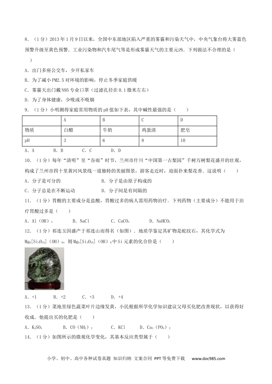 小学、初中、高中各种试卷真题知识归纳文案合同PPT等免费下载www.doc985.com2013年甘肃省金昌市中考化学试题一、选择题(共28小题,1~16小题每小题1分,17~28小题每小题2分,满分40分。每小题只有一个选项符合题意)1.(1分)生活中的下列变化,属于化学变化的是()A.冰块融化B.瓷碗破裂C.食物腐烂D.酒精挥发2.(1分)放学了,妈妈为小刚准备了如下的食谱.主食:馒头;配菜:红烧肉、豆腐汤.你认为食谱中还应添加()A.醋溜白菜B.清蒸鱼C.炒鸡蛋D.牛奶3.(1分)空气中含量较多且性质不活泼的气体是()A.氧气B.氮气C.二氧化碳D.水蒸气4.(1分)人体中生命必需元素含量的多少直接影响人的健康,缺少某种元素可能导致骨质疏松,该元素是()A.碘B.铁C.锌D.钙5.(1分)下列物质中,属于合成材料的是()A.棉花B.羊毛C.塑料D.天然橡胶6.(1分)规范的实验操作是科学探究的基础.下列图示实验操作错误的是()A.倾倒液体B.取用粉末状固体C.闻气体气味D.检查气密性7.(1分)下列物质含有氧分子的是()A.高锰酸钾B.二氧化碳C.二氧化锰D.空气小学、初中、高中各种试卷真题知识归纳文案合同PPT等免费下载www.doc985.com8.(1分)2013年1月9日以来,全国中东部地区陷入严重的雾霾和污染天气中,中央气象台将大雾蓝色预警升级至黄色预警.工业污染物和汽车尾气等是形成雾霾天气的主要元凶.下列做法不合理的是()A.出门多座公交车,少开私家车B.为了减小PM2.5对环境的影响,停止冬季家庭供暖C.雾霾天出门戴N95专业口罩(过滤孔径在0.1微米左右)D.为了身体健康,少吸或不吸烟9.(1分)小明测得家庭常用物质的pH值如下表,其中碱性最强的是()ABCD物质白醋牛奶鸡蛋清肥皂pH36810A.AB.BC.CD.D10.(1分)每年“清明”至“谷雨”时节,兰州市什川“中国第一古梨园”千树万树梨花盛开的壮观,构成了兰州市四十里黄河风景线一道独特的美丽图景,游客走近时,迎面扑来梨花香.这说明()A.分子是可分的B.分子是由原子构成的C.分子总是在不断运动D.分子间是有间隔的11.(1分)胃酸的主要成分是盐酸,胃酸过多的病人需用药物治疗.下列药物(主要成分)不能用于治疗胃酸过多是()A.Al(OH)3B.NaClC.CaCO3D.NaHCO312.(1分)祁连玉因盛产于祁连山而得名(如图).地质学鉴定其矿物是蛇纹石,其化学式为Mg6[Si4O10](OH)8,则Mg6[Si4O10](OH)8中Si元素的化合价是()A.+1B.+2C.+3D.+413.(1分)菜地里绿色蔬菜叶片边缘发黄,小民根据所学化学知识建议父母买化肥改善现状,以获得好收成.他提出买的化肥是()A.K2SO4B.CO(NH2)2C.KClD.Ca3(PO4)214.(1分)如图所示的微观化学变化,其基本反应类型属于()小学、初中、高中各种试卷真题知识归纳文案合同PPT等免费下载www.doc985.comA.分解反应B.置换反应C.化合反应D.复分解反应15.(1分)甘肃武威的“莫高”葡萄酒荣获“中国驰名商标”.葡萄酒中含有单宁,它十分有益于心血管疾病的预防.单宁的化学式是C76H52O46.下列有关单宁的说法不正确的是()A.单宁中氧元素的质量分数最高B.单宁由碳、氢、氧三种元素组成C.每个单宁分子中含有174个原子D.单宁属于有机物16.(1分)近年来让舌尖颤栗的饮食安全成为大家非常关心的话题.下列做法安全合理的是()A.用工业明胶给大虾增重、“美容”B.用工业酒精勾兑名牌白酒C.一些养鸡场使用抗生素和激素养殖肉鸡D.用小苏打(NaHCO3)焙制糕点17.(2分)下列关于催化剂的说法不正确的是()A.任何化学反应都需要催化剂B.催化剂可以提高某些化学反应的速率C.催化剂可以降低某些化学反应的速率D.化学反应前后,催化剂的质量和化学性质都不变18.(2分)为探究物质燃烧的条件,某同学做了如图所示的实验.实验发现水中的白磷和铜片上的红磷都没燃烧,铜片上的白磷着火燃烧(已知白磷的着火点40℃,红磷着火点240℃.)对此实验的认识错误的是()A.可燃物要与氧气接触B.物质燃烧温度必须要达到着火点C.铜片上的红磷没燃烧,因为红磷不是可燃物D.烧杯中热水的作用既供热又使白磷Ⅱ与氧气隔绝19.(2分)2013年世...