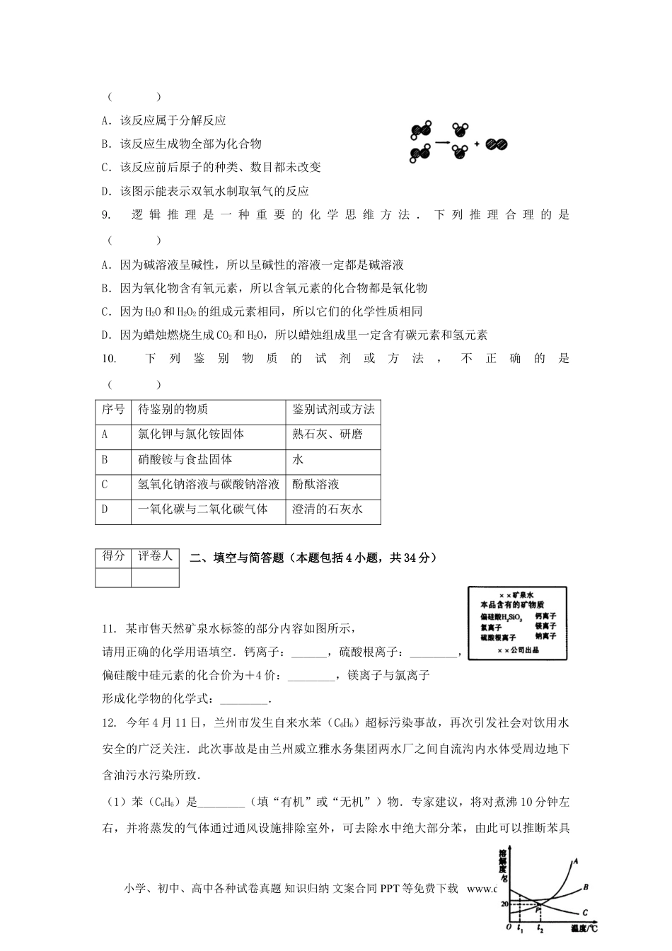 2014年甘肃省中考化学真题试卷可能用到的相对原子质量:H=1C=12O=16Cl=35.5Ca=40一、选择题(本题包括10小题,每小题3分,共30分。每题只有一个选项符合题意)1.下列物质属于混合物的是()A.锌B.石油C.氧化镁D.硝酸钾2.下列所用的生活用品所用的主要材料,属于有机合成材料的是()A.塑料保鲜膜B.真丝围巾C.麻布袋D.木桶3.下列有关物质的用途,利用了物理性质的是()A.用稀硫酸除铁锈B.用氢气做燃料C.用熟石灰改良酸性土壤D.用干冰人工降雨4.2013年,我省兰州市城区环境空气质量优良天数达到299天,优良率达到了81.92%.历史性地退出了全国空气质量十大污染城市行列.现行空气质量日报中,未计入空气污染指数项目的是()A.S02B.N02C.C02D.可吸入颗粒5.合理搭配饮食是我们的健康理念.中考期间,小明妈妈为他准备了一份午餐:馒头、红烧肉、豆腐汤、炸鸡腿.你认为这份午餐搭配中还应添加下列食品的()A.糖类B.蛋白质C.油脂D.维生素6.2014年4月14日,科学家约翰•帕特森向人们展示了一款真正意义上的原子手表,它内置了一个芯片级的铯原子钟,每1000年仅有1秒的误差.已知这种铯原子核内质子数为55,相对原子质量为133,则其核外电子数为()A.188B.78C.55D.237.下列图中所示的实验操作正确的是()A.取用大理石B.加热液体C.测定溶液的pHD.稀释浓硫酸8.下图为某反应的微观示意图,不同的球代表不同元素的原子.下列说法错误的是小学、初中、高中各种试卷真题知识归纳文案合同PPT等免费下载www.doc985.com得分评卷人()A.该反应属于分解反应B.该反应生成物全部为化合物C.该反应前后原子的种类、数目都未改变D.该图示能表示双氧水制取氧气的反应9.逻辑推理是一种重要的化学思维方法.下列推理合理的是()A.因为碱溶液呈碱性,所以呈碱性的溶液一定都是碱溶液B.因为氧化物含有氧元素,所以含氧元素的化合物都是氧化物C.因为H2O和H2O2的组成元素相同,所以它们的化学性质相同D.因为蜡烛燃烧生成CO2和H2O,所以蜡烛组成里一定含有碳元素和氢元素10.下列鉴别物质的试剂或方法,不正确的是()序号待鉴别的物质鉴别试剂或方法A氯化钾与氯化铵固体熟石灰、研磨B硝酸铵与食盐固体水C氢氧化钠溶液与碳酸钠溶液酚酞溶液D一氧化碳与二氧化碳气体澄清的石灰水二、填空与简答题(本题包括4小题,共34分)11.某市售天然矿泉水标签的部分内容如图所示,请用正确的化学用语填空.钙离子:______,硫酸根离子:________,偏硅酸中硅元素的化合价为+4价:________,镁离子与氯离子形成化学物的化学式:________.12.今年4月11日,兰州市发生自来水苯(C6H6)超标污染事故,再次引发社会对饮用水安全的广泛关注.此次事故是由兰州威立雅水务集团两水厂之间自流沟内水体受周边地下含油污水污染所致.(1)苯(C6H6)是________(填“有机”或“无机”)物.专家建议,将对煮沸10分钟左右,并将蒸发的气体通过通风设施排除室外,可去除水中绝大部分苯,由此可以推断苯具小学、初中、高中各种试卷真题知识归纳文案合同PPT等免费下载www.doc985.com得分评卷人有的物理性质是________.(2)在上述受污染的水中投放活性炭会除去苯,这是利用了活性炭的________性.(3)硬水给生活和生产带来很多麻烦,生活中常用________区分硬水和软水,常用________的方法降低水的硬度.(4)请你提出一种防止水污染的有效措施或方法________.13.如图是A、B、C三种固体物质的溶解度曲线.(1)t1℃时,A、B、C三种物质的溶解度由大到小的顺序是________.(2)要使A的不饱和溶液变为饱和溶液,其方法是________(至少写两种).(3)图中P点的含义是________.14.A~H是初中化学常见的物质,其中E为黑色固体,H为蓝色沉淀.这些物质的相互转化关系如图所示,其中部分生成物和反应条件已省略.(1)写出下列物质的化学式:A________,G________,H________.(2)化学反应常伴有能量变化.物质B与水反应时会________(“吸收”或“放出”)热量.(3)写出D→F的化学方程式:________.(4)写出E→C的化学方程式:。三、实验探究题(本题包括2小题,共20分)15.(16分)老师为...