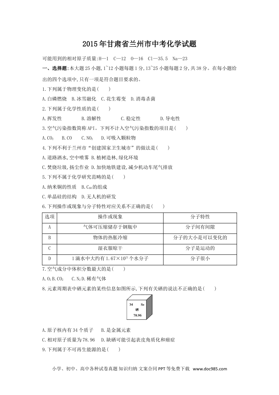 2015年甘肃省兰州市中考化学试题可能用到的相对原子质量:H—1C—12O—16Cl—35.5Na—23一、选择题:本大题25小题,1~12小题每题1分,13~25小题每题2分,共38分。在每小题给出的四个选项中,只有一项是符合题目要求的。1.下列属于物理变化的是()A.白磷燃烧B.冰雪融化C.花生霉变D.消毒杀菌2.下列属于化学性质的是()A.挥发性B.溶解性C.稳定性D.导电性3.空气污染指数简称API。下列不计入空气污染指数的项目是()A.CO2B.COC.NO2D.可吸入颗粒物4.下列不利于兰州市“创建国家卫生城市”的做法是()A.道路洒水,空中喷雾B.植树造林,绿化环境C.焚烧垃圾,扬尘作业D.加快地铁建设,减少机动车尾气排放5.下列不属于化学研究范畴的是()A.纳米铜的性质B.C60的组成C.单晶硅的结构D.无人机的研发6.下列操作或现象与分子特性对应关系不正确的是()选项操作或现象分子特性A气体可压缩储存于钢瓶中分子间有间隙B物体的热胀冷缩分子的大小是可以变化的C湿衣服晾干分子是运动的D1滴水中大约有1.67×1021个水分子分子很小7.空气成分中体积分数最大的是()A.O2B.CO2C.N2D.稀有气体8.元素周期表中硒元素的某些信息如图所示,下列有关硒的说法不正确的是()A.原子核内有34个质子B.是金属元素C.相对原子质量为78.96D.缺硒可能引起表皮角质化和癌症9.下列属于不可再生能源的是()小学、初中、高中各种试卷真题知识归纳文案合同PPT等免费下载www.doc985.comA.煤B.太阳能C.风能D.氢能10.下列属于复合肥的是()A.NH4ClB.KClC.CaHPO4D.KNO311.一些食物的近似pH如下表。对照表中信息,下列说法不正确的是()食物葡萄汁苹果汁牛奶鸡蛋清pH3.5~4.52.9~3.36.3~6.67.6~8.0A.鸡蛋清和牛奶显碱性B.苹果汁和葡萄汁显酸性C.苹果汁比葡萄汁的酸性强D.胃酸过多的人应少饮苹果汁和葡萄汁12.地壳中含量最高的金属元素是()A.CaB.SiC.AlD.O13.化学实验操作直接影响实验结果和人身安全。下列关于实验操作的说法正确的是()A.用10mL量筒量取8.55mL水B.称量固体药品时,左盘放砝码,右盘放物体C.稀释浓硫酸时,将水沿烧杯内壁注入盛有浓硫酸的烧杯中,并用玻璃棒不断搅拌D.点燃可燃性气体前必须检验纯度14.高铁酸钠是一种能氧化、杀菌、脱色、除臭的新型高效水处理剂。其化学式为Na2FeO4,其中Fe元素的化合价是()A.+6B.+4C.+3D.+215.下列关于常见氧化物的叙述,不正确的是()A.H2O是最常用的溶剂,能溶解所有的物质B.CO极易与血液中的血红蛋白结合,造成生物体内缺氧C.固态CO2叫做“干冰”,可用于人工降雨D.磁铁矿的主要成分是Fe3O4,有磁性,可用于炼铁16.分类法是一种行之有效、简单易行的科学方法。下列选项分类不正确的是()选项类别物质A合金钢、焊锡、生铁B盐食盐、火碱、生石灰C有机物甲烷、乙醇、葡萄糖D腐蚀性物质浓硫酸、氢氧化钠17.兰州西客站在建设中,使用了大量建筑材料。下列有关材料的叙述不正确的是()A.建设过程中使用了大量的钢,其硬度小于纯铁的硬度B.一些设施中使用的合成纤维属于有机合成材料小学、初中、高中各种试卷真题知识归纳文案合同PPT等免费下载www.doc985.comC.建设过程中,废弃的金属材料必须回收利用D.建设中使用了玻璃钢、碳纤维等材料,它们是复合材料18.取等质量的甲、乙、丙三种金属,分别投入相同浓度的盐酸中,只有甲有气泡产生;再取一小块乙投入丙的硝酸盐溶液中,乙的表面没有丙析出。则甲、乙、丙三种金属的活动性顺序是()A.甲>乙>丙B.甲>丙>乙C.丙>乙>甲D.乙>丙>甲19.对下列有水生成的四个化学方程式的反应类型,判断不正确的是()①2H2+O22H2O②H2CO3H2O+CO2↑③H2+CuOCu+H2O④SO2+2NaOHNa2SO3+H2OA.①是化合反应B.②是分解反应C.③是置换反应D.④是复分解反应20.兰州牛肉面制作中通过添加蓬灰(主要成分K2CO3),使面条劲道有弹性。下列关于K2CO3的说法不正确的是()A.该物质由K、C、O三种元素组成B.该物质属于化合物C.该物质由2个钾原子、1个碳原子和3个O原子构成D.取少量蓬灰滴加盐酸,有气体产生,且该气体能使澄清石灰水变浑浊21.下列不能正确反映相关实验过程中量的变化关系的图像是()A.氢氧化钠溶液加水稀释B.一定压强下,氧气在水中的溶解度C.一定温度下,向不饱和硝酸钾溶液中加入硝酸钾D.氯酸钾加热制氧气中,a使用催化剂,b未使...