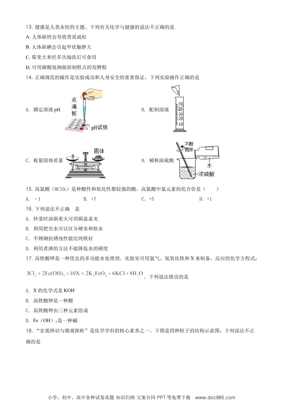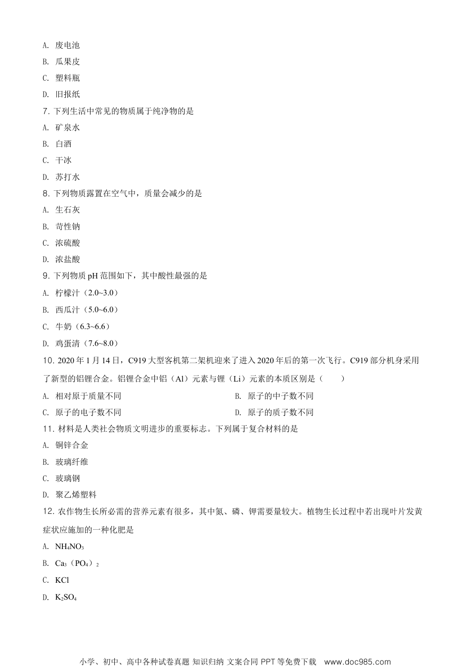 金昌市2020年初中毕业及高中阶段教育招生考试化学试卷考生注意:本试卷满分为100分,考试时间为10分钟。所有试题均在答题卡上作答,否则无效。可能用到的相对原子质量:H-1C-12O-16C1-35.5Ca-40一、选择题(本题包括25小题,每小题所列的四个选项,只有一个选项符合题目要求。1~10小题,每题1分,11-25小题,每题2分,共40分。)1.下列生活中发生的变化属于物理变化的是A.酒精挥发B.面包发霉C.纸张燃烧D.钢铁生锈2.能源与人类的生活和社会发展密不可分。下列能源不属于新能源的是A.氢能B.核能C.石油D.风能3.2020年6月5日世界环境日中国主题是“美丽中国,我是行动者”。下列做法符合“美丽中国”的是A.鼓励开私家车,带动经济发展B.垃圾分类回收,增强节约意识C.大量使用化肥,提高粮食产量D.燃放烟花爆竹,增添节日气氛4.蛋白质是构成人体细胞的基础物质,下列哪种食物中富含该营养素A.土豆B.菠菜C.鸡蛋D.面包5.正确使用实验仪器是学习化学的基础。下列仪器可以直接用酒精灯火焰加热的是A.试管B.量筒C.集气瓶D.烧杯6.垃圾分类,从我做起,下列属于厨余垃圾的是小学、初中、高中各种试卷真题知识归纳文案合同PPT等免费下载www.doc985.comA.废电池B.瓜果皮C.塑料瓶D.旧报纸7.下列生活中常见的物质属于纯净物的是A.矿泉水B.白酒C.干冰D.苏打水8.下列物质露置在空气中,质量会减少的是A.生石灰B.苛性钠C.浓硫酸D.浓盐酸9.下列物质pH范围如下,其中酸性最强的是A.柠檬汁(2.0~3.0)B.西瓜汁(5.0~6.0)C.牛奶(6.3~6.6)D.鸡蛋清(7.6~8.0)10.2020年1月14日,C919大型客机第二架机迎来了进入2020年后的第一次飞行。C919部分机身采用了新型的铝锂合金。铝锂合金中铝(Al)元素与锂(Li)元素的本质区别是()A.相对原于质量不同B.原子的中子数不同C.原子的电子数不同D.原子的质子数不同11.材料是人类社会物质文明进步的重要标志。下列属于复合材料的是A.铜锌合金B.玻璃纤维C.玻璃钢D.聚乙烯塑料12.农作物生长所必需的营养元素有很多,其中氮、磷、钾需要量较大。植物生长过程中若出现叶片发黄症状应施加的一种化肥是A.NH4NO3B.Ca3(PO4)2C.KClD.K2SO4小学、初中、高中各种试卷真题知识归纳文案合同PPT等免费下载www.doc985.com13.健康是人类永恒的主题。下列有关化学与健康的说法不正确的是A.人体缺钙会导致骨质疏松B.人体缺碘会引起甲状腺肿大C.霉变大米经多次淘洗后可食用D.可用碳酸氢钠做焙制糕点的发酵粉14.正确规范的操作是实验成功和人身安全的重要保证。下列实验操作正确的是A.测定溶液pHB.配制溶液C.称量固体质量D.稀释浓硫酸15.高氯酸(HClO4)是种酸性和氧化性都较强的酸,高氯酸中氯元素的化合价是()A.﹣1B.+7C.+5D.+116.下列说法不正确的是A.炒菜时油锅着火可用锅盖盖灭B.利用肥皂水可以区分硬水和软水C.不锈钢抗锈蚀性能比纯铁好D.利用煮沸的方法不能降低水的硬度17.高铁酸钾是一种优良的多功能水处理剂。实验室可用氯气、氢氧化铁和X来制备,反应的化学方程式:。下列说法错误的是A.X的化学式是KOHB.高铁酸钾是一种酸C.高铁酸钾由三种元素组成D.Fe(OH)3是一种碱18.“宏观辨识与微观探析”是化学学科的核心素养之一。下图是四种粒子的结构示意图,下列说法不正确的是小学、初中、高中各种试卷真题知识归纳文案合同PPT等免费下载www.doc985.comA.③④属于同种元素B.①④均表示离子C.③④化学性质相似D.②和③可形成化合物AlCl319.关于“加热高锰酸钾制得氧气并用排水法收集”的实验,下列说法正确的是A.制取气体时,先装药品,然后检验装置的气密性B.反应结束时,先停止加热,然后将导管移出水面C.导气管口开始产生气泡时,立即用装满水的集气瓶收集气体D.装有高锰酸钾的试管口要放一小团棉花,目的是防止反应时药品进入导气管20.某同学为验证铁、铜、银三种金属的活动性顺序,他设计了以下四种实验方案,其中能达到目的是A.将Fe、Cu分别加入AgNO3溶液中B.将Fe、Cu、Ag分别加入稀盐酸中C.将Fe分别加入CuSO4、AgNO3溶液中D.将Fe、Ag分别加入CuSO4溶液中21.下列关于“相等”的说法不正确的是A.化学反应前后分子个数一定相等B.原子中核外电子数与核内质子数一定相等C.浓...