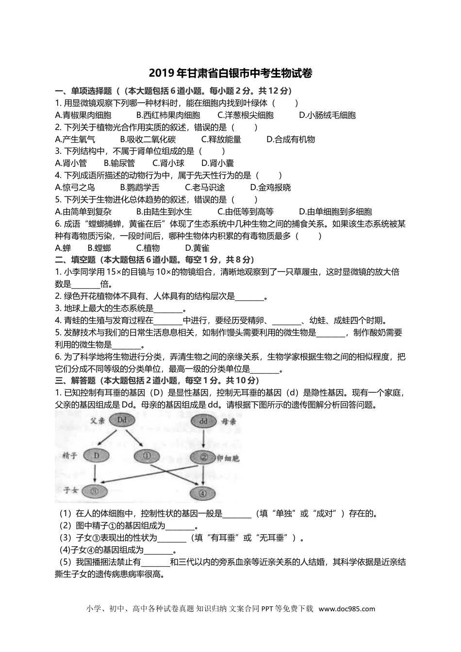 2019年甘肃省白银市中考生物试卷一、单项选择题((本大题包括6道小题。每小题2分。共12分)1.用显微镜观察下列哪一种材料时,能在细胞内找到叶绿体()A.青椒果肉细胞B.西红柿果肉细胞C.洋葱根尖细胞D.小肠绒毛细胞2.下列关于植物光合作用实质的叙述,错误的是()A.产生氧气B.吸收二氧化碳C.释放能量D.合成有机物3.下列结构中,不属于肾单位组成的是()A.肾小管B.输尿管C.肾小球D.肾小囊4.下列成语所描述的动物行为中,属于先天性行为的是()A.惊弓之鸟B.鹦鹉学舌C.老马识途D.金鸡报晓5.下列关于生物进化总体趋势的叙述,错误的是()A.由简单到复杂B.由陆生到水生C.由低等到高等D.由单细胞到多细胞6.成语“螳螂捕蝉,黄雀在后”体现了生态系统中几种生物之间的捕食关系。如果该生态系统被某种有毒物质污染,一段时间后,哪种生物体内积累的有毒物质最多()A.蝉B.螳螂C.植物D.黄雀二、填空题(本大题包括6道小题。每空1分,共8分)1.小李同学用15×的目镜与10×的物镜组合,清晰地观察到了一只草履虫,这时显微镜的放大倍数是________倍。2.绿色开花植物体不具有、人体具有的结构层次是________。3.地球上最大的生态系统是________。4.青蛙的生殖与发育过程在________中进行,要经历受精卵、________、幼蛙、成蛙四个时期。5.发酵技术与我们的日常生活息息相关,如制作馒头需要利用的微生物是________,制作酸奶需要利用的微生物是________。6.为了科学地将生物进行分类,弄清生物之间的亲缘关系,生物学家根据生物之间的相似程度,把它们分成不同等级的分类单位,最高一级的分类单位是________。三、解答题(本大题包括2道小题,每空1分。共10分)1.已知控制有耳垂的基因(D)是显性基因,控制无耳垂的基因(d)是隐性基因。现有一个家庭,父亲的基因组成是Dd。母亲的基因组成是dd。请根据下图所示的遗传图解分析回答问题。(1)在人的体细胞中,控制性状的基因一般是________(填“单独”或“成对”)存在的。(2)图中精子①的基因组成为________。(3)子女③表现出的性状为________(填“有耳垂”或“无耳垂”)。(4)子女④的基因组成为________。(5)我国播捆法禁止有________和三代以内的旁系血亲等近亲关系的人结婚,其科学依据是近亲结撕生子女的遗传病患病率很高。小学、初中、高中各种试卷真题知识归纳文案合同PPT等免费下载www.doc985.com2.乙肝是乙型病毒性肝炎的简称,是一种常见的传染病.据世界卫生组织报道,全球约有20亿人曾感染过乙肝病毒,其中3.5亿人为慢性感染者,每年约有100万人死于感染所致的肝衰竭、肝硬化和肝癌。请分析回答下列问题。(1)从传染病流行的基本环节分析,乙肝患者属于________。(2)婴儿出生后就需要注射乙肝疫苗,这样能够有效预防乙肝病毒的感染。从预防传染病的措施分析,给婴儿进行预防接种属于________。(3)接种乙肝疫苗后,人体内的淋巴细胞就会产生抵抗乙肝病毒的________;当乙肝病毒再次侵入时,该种物质就会迅速发生作用并消灭它们。这种免疫功能是后天获得的,只针对某一特定的病原体起作用,因而叫做________免疫。(4)某人想通过接种甲肝疫苗来预防乙肝,你认为能否起到预防作用?________。参考答案与试题解析2019年甘肃省白银市中考生物试卷一、单项选择题((本大题包括6道小题。每小题2分。共12分)1.【答案】此题暂无答案【考点】植物细都注基本结构2.【答案】此题暂无答案【考点】光合作用明概钾和意义3.【答案】此题暂无答案【考点】肾脏的明构约功能4.【答案】此题暂无答案小学、初中、高中各种试卷真题知识归纳文案合同PPT等免费下载www.doc985.com【考点】动物的验我性行助驶学习行为的区别5.【答案】此题暂无答案【考点】生物进明的息体趋势生物三硬的历程藻类因物的优征6.【答案】此题暂无答案【考点】某些根隐法质置食物链积累二、填空题(本大题包括6道小题。每空1分,共8分)1.【答案】此题暂无答案【考点】显微射的面道完造和使用方法2.【答案】此题暂无答案【考点】绿色都花问物亮的山构层次动体体目片如的结构层次3.【答案】此题暂无答案【考点】生验立方参大的生态系统4.【答案】此题暂无答...