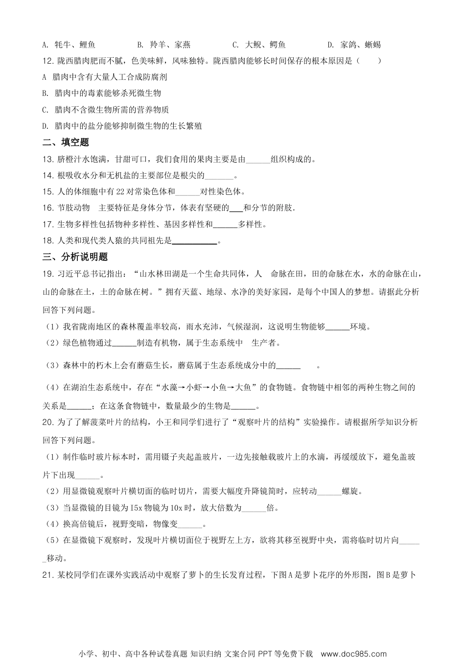 生物学部分一、单项选择题1.下列实例中属于生态系统的是()A.一片森林中的所有植物B.一条河流中的所有动物C.一片草原上的所有生物D.一个湖泊中的所有生物及其生存环境2.玉米种子中富含淀粉的结构是()A.子叶B.胚乳C.胚芽D.胚轴3.呼吸作用的实质是A.合成有机物,储存能量B.分解有机物,储存能量C.合成有机物,释放能量D.分解有机物,释放能量4.青少年若长期缺乏维生素D会患佝偻病,所以应当多吃一些()A.蛋糕、巧克力B.粗粮、豆类C.奶、蛋、动物肝脏D.新鲜蔬菜、水果5.某人不慎感染新冠肺炎,入院治疗期间出现发热、咳嗽等症状,请你推测他的血液中明显增多的血细胞是()A.红细胞B.白细胞C.血小板D.干细胞6.下列人体激素分泌异常与疾病的对应关系中,正确的是()A.生长激素分泌过多——侏儒症B.胰岛素分泌过多——糖尿病C.甲状腺激素分泌过多——巨人症D.胰岛素分泌不足——糖尿病7.小张同学散步时,看见前方有“正在施工,请绕行”的标志,便绕道行走,但是宠物狗却不会这样做。其本质原因是人的大脑具有()A.语言中枢B.视觉中枢C.运动中枢D.听觉中枢8.酸雨对生物有极大的危害控制酸雨的根本措施是()A.增加植被覆盖率B.减少二氧化碳排放C.用碱性物质中和酸雨D.减少二氧化硫等污染物排放9.下列动物行为中,属于学习行为的一项是()A.孔雀开屏B.老马识途C.蜜蜂筑巢D.大雁南飞10.古词云“稻花香里说三年,听取蛙声一片。”下列关于青蛙生殖与发育的叙述中,正确的是()A.体内受精B.体内发育C.变态发育D.发育起点是蝌蚪11.体温恒定增强了动物对环境的适应能力,扩大了分布范围。下列各组动物中,均属于恒温动物的是()小学、初中、高中各种试卷真题知识归纳文案合同PPT等免费下载www.doc985.comA.牦牛、鲤鱼B.羚羊、家燕C.大鲵、鳄鱼D.家鸽、蜥蜴12.陇西腊肉肥而不腻,色美味鲜,风味独特。陇西腊肉能够长时间保存的根本原因是()A.腊肉中含有大量人工合成防腐剂B.腊肉中的毒素能够杀死微生物C.腊肉不含微生物所需的营养物质D.腊肉中的盐分能够抑制微生物的生长繁殖二、填空题13.脐橙汁水饱满,甘甜可口,我们食用的果肉主要是由______组织构成的。14.根吸收水分和无机盐的主要部位是根尖的_______。15.人的体细胞中有22对常染色体和______对性染色体。16.节肢动物的主要特征是身体分节,体表有坚硬的和分节的附肢.17.生物多样性包括物种多样性、基因多样性和______多样性。18.人类和现代类人猿的共同祖先是___________。三、分析说明题19.习近平总书记指出:“山水林田湖是一个生命共同体,人的命脉在田,田的命脉在水,水的命脉在山,山的命脉在土,土的命脉在树。”拥有天蓝、地绿、水净的美好家园,是每个中国人的梦想。请据此分析回答下列问题。(1)我省陇南地区的森林覆盖率较高,雨水充沛,气候湿润,这说明生物能够______环境。(2)绿色植物通过______制造有机物,属于生态系统中的生产者。(3)森林中的朽木上会有蘑菇生长,蘑菇属于生态系统成分中的______。(4)在湖泊生态系统中,存在“水藻→小虾→小鱼→大鱼”的食物链。食物链中相邻的两种生物之间的关系是______;在这条食物链中,数量最少的生物是______。20.为了了解菠菜叶片的结构,小王和同学们进行了“观察叶片的结构”实验操作。请根据所学知识分析回答下列问题。(1)制作临时玻片标本时,需用镊子夹起盖玻片,一边先接触载玻片上的水滴,再缓缓放下,避免盖玻片下出现______。(2)用显微镜观察叶片横切面的临时切片,需要大幅度升降镜简时,应转动______螺旋。(3)当显微镜的目镜为I5x物镜为10x时,放大倍数为______倍。(4)换高倍镜后,视野变暗,物像变______。(5)在显微镜下观察时,发现叶片横切面位于视野左上方,欲将其移至视野中央,需将临时切片向______移动。21.某校同学们在课外实践活动中观察了萝卜的生长发育过程,下图A是萝卜花序的外形图,图B是萝卜小学、初中、高中各种试卷真题知识归纳文案合同PPT等免费下载www.doc985.com花的结构示意图,图C是收获的萝卜。请结合下图回答下列问题。(1)萝卜属于十字花科植物,经过传粉和______后,图B中的[③]______会发育成为果实。...