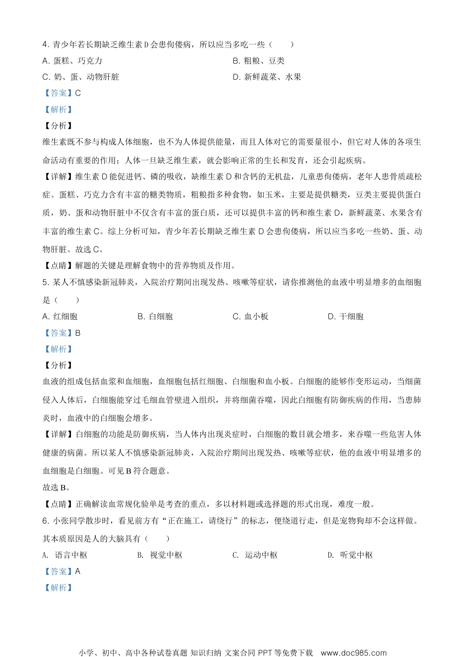 甘肃省平凉市2020年初中毕业与高中阶段招生考试生物学试卷一、单项选择题1.下列实例中属于生态系统的是()A.一片森林中的所有植物B.一条河流中的所有动物C.一片草原上的所有生物D.一个湖泊中的所有生物及其生存环境【答案】D【解析】【分析】生态系统是在一定的空间范围内,生物与环境形成的一个统一整体。由生物部分和非生物部分组成。生物部分包括生产者(植物)、消费者(动物)、分解者(细菌和真菌)。非生物部分包括阳光、空气、水等。【详解】A.一片森林中的所有植物,只有部分生产者,没有其他成分,不属于生态系统,不符合题意。B.一条小河中所有的动物,只包括部分生物成分,没有其他生物成分及非生物成分,不属于生态系统,不符合题意。C.一片草原中的所有生物,只有生物成分,没有非生物部分,因此不属于生态系统,不符合题意。D.一个湖泊中的所有生物及其生存环境,既有生物成分也有非生物成分,属于生态系统,符合题意。故选D。【点睛】解答此类题目的关键是理解掌握生态系统的概念及组成。2.玉米种子中富含淀粉的结构是()A.子叶B.胚乳C.胚芽D.胚轴【答案】B【解析】【分析】玉米种子由种皮、胚和胚乳三部分组成,如图所示:,据此解答。【详解】玉米种子由种皮、胚和胚乳三部分组成,胚由胚芽、胚轴、胚根、子叶四部分组成,种皮有保护小学、初中、高中各种试卷真题知识归纳文案合同PPT等免费下载www.doc985.com种子内部结构的作用,胚乳是种子储存营养物质的结构,玉米的淀粉主要储存在胚乳中。故选B。【点睛】一般来说单子叶植物种子具有胚乳,营养物质储存在胚乳里;双子叶植物种子没有胚乳,营养物质储存在子叶里。3.呼吸作用的实质是A.合成有机物,储存能量B.分解有机物,储存能量C.合成有机物,释放能量D.分解有机物,释放能量【答案】D【解析】分析:本题考查的是植物进行光合作用和呼吸作用的关系,光合作用和呼吸作用是相互联系,相互影响的.解:下表为光合作用和呼吸作用的比较:区别联系场所原料条件产物能量光合作用叶绿体二氧化碳、水光有机物、氧气合成有机物储存能量相互对立相互影响呼吸作用所有活细胞有机物、氧气有无光皆可二氧化碳、水分解有机物释放能量植物每时每刻都在进行呼吸作用.植物通过呼吸作用释放出来的能量,除了一部分转变成热能散失以外,其余部分用于植物体的各项生命活动,如植物对矿质营养的吸收、有机物的合成与运输、细胞的分裂与生长等.所以植物进行呼吸作用的实质是分解有机物,释放能量.故选D点评:关于植物能量的释放和合成,可结合着植物的光合作用和呼吸作用的关系理解掌握.小学、初中、高中各种试卷真题知识归纳文案合同PPT等免费下载www.doc985.com4.青少年若长期缺乏维生素D会患佝偻病,所以应当多吃一些()A.蛋糕、巧克力B.粗粮、豆类C.奶、蛋、动物肝脏D.新鲜蔬菜、水果【答案】C【解析】【分析】维生素既不参与构成人体细胞,也不为人体提供能量,而且人体对它的需要量很小,但它对人体的各项生命活动有重要的作用;人体一旦缺乏维生素,就会影响正常的生长和发育,还会引起疾病。【详解】维生素D能促进钙、磷的吸收,缺维生素D和含钙的无机盐,儿童患佝偻病,老年人患骨质疏松症。蛋糕、巧克力含有丰富的糖类物质,粗粮指多种食物,如玉米,主要是提供糖类,豆类主要提供蛋白质,奶、蛋和动物肝脏中不仅含有丰富的蛋白质,还可以提供丰富的钙和维生素D,新鲜蔬菜、水果含有丰富的维生素C。综上分析可知,青少年若长期缺乏维生素D会患佝偻病,所以应当多吃一些奶、蛋、动物肝脏。故选C。【点睛】解题的关键是理解食物中的营养物质及作用。5.某人不慎感染新冠肺炎,入院治疗期间出现发热、咳嗽等症状,请你推测他的血液中明显增多的血细胞是()A.红细胞B.白细胞C.血小板D.干细胞【答案】B【解析】【分析】血液的组成包括血浆和血细胞,血细胞包括红细胞、白细胞和血小板。白细胞的能够作变形运动,当细菌侵入人体后,白细胞能穿过毛细血管壁进入组织,并将细菌吞噬,因此白细胞有防御疾病的作用,当患肺炎时,血液中的白细胞会增多。【详解】白细胞的功能是防御疾病,当人体内出现炎症时,白细胞的...