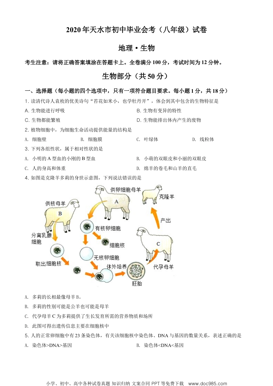 2020年天水市初中毕业会考(八年级)试卷地理·生物考生注意:请将正确答案填涂在答题卡上。全卷满分100分,考试时间为12分钟。生物部分(共50分)一、选择题(每小题的四个选项中,只有一项符合题目要求。每小题1分,共18分)1.读清代诗人袁枚的优美诗句“苔花如米小,也学牡丹开”,体会到其中包含的生物特征是A.生物能进行呼吸B.生物有变异的特性C.生物都能繁殖D.生物能排出体内产生的废物2.植物细胞中,为细胞生命活动提供能量的结构是A.细胞壁B.细胞膜C.叶绿体D.线粒体3.下列各组性状,属于相对性状的是A.小明的A型血的小刚的B型血B.小萌的双眼皮和小丽的双眼皮C.人的身高和体重D.绵羊的卷毛和山羊的直毛4.如图是克隆羊多莉的身世示意图,下列说法错误的是A.多莉的长相最像母羊B。B.多莉的性别可能是公羊也可能是母羊C.代孕母羊C为多莉提供了生长发育所需的营养物质和场所D.此图可得出遗传信息主要在细胞核中5.人的正常卵细胞中有23条染色体,有关该细胞核中染色体、DNA与基因的数量关系,表述正确的是A.染色体>DNA>基因B.染色体<DNA<基因小学、初中、高中各种试卷真题知识归纳文案合同PPT等免费下载www.doc985.comC.染色体=DNA<基因D.染色体=DNA>基因6.果蝇是生物实验常用的材料,它的体细胞中有4对染色体,其精子、卵细胞和受精卵中的染色体数目分别为A.4条、4条、4条B.2对、2对、4对C.4条、4条、4对D.4对、4对、4对7.某生物体细胞经过一次分裂产生两个新细胞,下列有关说法错误的是A.两个新细胞与原细胞的染色体形态和数目相同B.两个新细胞的体积与原细胞相同C.两个新细胞中的染色体形态和数目相同D.两个新细胞与原细胞所含遗传物质相同8.在探究“光对鼠妇生活的影响”的实验中,把同样多的鼠妇同时放在较暗和较亮的环境中。下列哪种曲线能表示较暗环境中鼠妇的数量变化?()A.B.C.D.9.下列现象中不能说明生物与环境相适应的是A.仙人掌的叶变成了刺状B.变色龙的体色能随环境的变化而变化C.蚯蚓的活动使土壤更肥沃D.枝叶蝶的外形像一片枯叶10.下列选项不能体现生物因素对生物影响的是()A.螳螂捕蝉,黄雀在后B.一山不容二虎C.人间四月芳菲尽,山寺桃花始盛开D.种豆南山下,草盛豆苗稀11.二十世纪七十年代末,美国科学家将我国的野生大豆引进到美国,与当地品种杂交,培育出了抗大豆萎黄病的优良品种,这个事例体现了A.生物种类的多样性B.基因的多样性C.生态系统的多样性D.生物数量的多样性12.下列关于生态系统的说法正确的是A.生产者、消费者和分解者构成了完整的生态系统B.沼泽是典型的淡水生态系统C.一块农田中的农作物可看做一个生态系统D.过度放牧会破坏草原生态系统13.一个处一稳定状态的生态系统中的四种生物构成了食物链,在某一时间内它们的相对数量关系如图所小学、初中、高中各种试卷真题知识归纳文案合同PPT等免费下载www.doc985.com示,在一段时间内,若乙的数量增加,则会引起A.甲、乙的数量增加,丙的数量下降B.丙、丁的数量增加,甲的数量下降C.甲、丙的数量增加,丁的数量下降D.甲、丙、丁的数量都增加14.有四位同学对我国生物多样性发表了各自的看法,其中正确的是A.甲说:俗话说“靠山吃山,靠水吃水”,我们可以随意利用周围的自然资源B.乙说:要保护生物多样性,必须禁止对一切生物资源的开发和利用C.丙说:藏羚羊是我国特有的珍稀动物,我们可以采取就地保护D.丁说:应该多引进新的物种,增加生物的多样性15.大多数哺乳动物受伤后,用舌头伸在舔伤口能促进愈合,这是由于()A.唾液中含溶菌酶,有杀菌作用,属特异性免疫B.唾液中有唾液淀粉酶,有消化作用,属特异性免疫C.唾液中有唾液淀粉酶,有消化作用,属非特异性免疫D.唾液中含溶菌酶,有杀菌作用,属非特异性免疫16.在下列健康评价中,属于评价社会适应方面的是A.我积极参加集体活动B.我的身体很灵活C.我很少觉得疲乏无力D.我对自己的外貌感到满意17.下列与艾滋病患者的哪些接触作为不会导致被感染()①交谈②握手③共餐④共用牙具⑤一起学习⑥共用注射器A.①②③④B.①②③⑤C.①②③⑥D.①②④⑤⑥18.合理均衡的膳食有利于我们的身体健康和生长发育。日常生活中,我们应科学的安排一日三餐,...