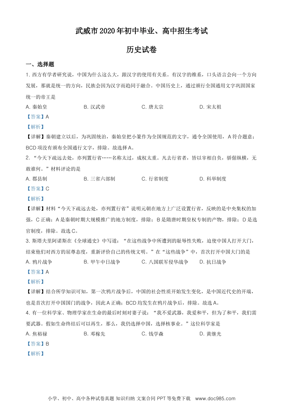 武威市2020年初中毕业、高中招生考试历史试卷一、选择题1.西方有学者研究说,中国为什么这么大,跟汉字的使用有关系。有汉字的维系,口头语言会向一个方向发展,那就是统一的方向,民族会因为汉字而趋同于融合。中国历史上,通过颁行全国通用文字巩固国家统一的帝王是A.秦始皇B.汉武帝C.唐太宗D.宋太祖【答案】A【解析】【详解】秦朝建立以后,为巩固统治,秦始皇把小篆作为全国规范的文字,通令全国使用,A符合题意;BCD项没有颁布全国通行文字,排除。故选择A。2.“今天下疏远去处,亦列置行省……名称太过,成权太重。凡去行省者,皆以宰相自负,骄倨纵横,无敢谁何。”材料评论的是A.郡县制B.三省六部制C.行省制度D.科举制度【答案】C【解析】【详解】材料“今天下疏远去处,亦列置行省”说明元朝在地方上广泛设置行省,反映的是中央集权的加强,C正确;A是秦朝时期大规模推广的地方制度,排除;B是隋唐时期皇权专制的产物,排除;D是选官制度,排除。故选C。3.斯塔夫里阿诺斯在《全球通史》中写道:“在这些战争中所遭到的耻辱性失败,迫使中国人打开大门,结束他们对西方的屈尊态度,重新评价自己的传统文明。”在“这些战争”中,首次打开中国大门的是A.鸦片战争B.甲午中日战争C.八国联军侵华战争D.抗日战争【答案】A【解析】【详解】结合所学知识可知,第一次鸦片战争后,中国的社会性质开始发生变化,是中国近代史的开端,也是首次打开中国国门的战争,因此A正确;BCD均发生在鸦片战争后,排除。故选A。4.有一位科学家、物理学家在生命的最后时刻对妻子说:“我不爱武器,我爱和平,但为了和平,我们需要武器。假如生命终结后可以再生,那么,我仍选择中国,选择核事业。”这位科学家是A.焦裕禄B.邓稼先C.钱学森D.黄继光【答案】B【解析】小学、初中、高中各种试卷真题知识归纳文案合同PPT等免费下载www.doc985.com【详解】依据题干“科学家、物理学家”“选择核事业”等信息和所学知识,邓稼先是中国核武器研制与发展的主要组织者、领导者,为我国的原子弹、氢弹的研制做出了巨大贡献,被誉为两弹元勋,他也因此而献出了自己宝贵的生命,B正确;焦裕禄是原兰考县委书记,领导人民与自然灾害进行了艰苦的斗争,被誉为党的好干部,A排除;钱学森也是我国著名科学家,但主要成就在火箭与航天领域,C排除;黄继光是抗美援朝时期的志愿军英雄战士,D排除。故选B。5.380年前爆发的英国资产阶级革命,揭开了欧洲和北美革命运动的序幕,推动了世界历史发展的进程。英国资产阶级革命中颁布的限制王权的法律文献是A.《权利法案》B.《人权宣言》C.《独立宣言》D.《解放黑人奴隶宣言》【答案】A【解析】【详解】结合所学知识可知,英国的《权利法案》确立了议会的主权,限制了王权,标志着英国君主立宪制的确立,A正确;B是法国大革命时期的文献,排除;CD是美国独立战争和南北战争颁布的文献,排除。故选A。6.纽约州长富兰克林.罗斯福在1932年接受提名的演说中说:“我向你们保证,我对自己立下誓言,要为美国人民实行新政。”“新政"的最大特点是A.提倡“文明开化”,向西方学习B.自上而下解放农奴C.以征收粮食税代替余粮收集制D.国家对经济的干预【答案】D【解析】【详解】结合所学知识,1929至1933年,美国遭遇了经济大危机,罗斯福于1933年就任总统后,为了克服经济危机,实行新政,“新政”的最大特点是加强国家对经济的干预,结果美国经济逐渐复苏,巩固了美国的资本主义民主政治制度,D正确;19世纪60年代开始的日本明治维新提倡“文明开化”,向西方学习,A排除;1861年,俄国沙皇亚历山大二世进行农奴制改革,自上而下解放农奴,B排除;1921年列宁领导下的苏俄开始实行新经济政策,以征收粮食税取代余粮收集制,C排除。故选D。二、材料解析题7.有历史学家把20世纪以1945年为分界线分为前后两个阶段,第一阶段的特征是革命与战争,第二阶段的特征是世界经济发展迅速、相对和平。阅读下列材料,回答问题。材料一1879年10月7日,德奥便缔结了秘密的军事同盟条约,1882年5月20日,意大利同德奥签订了三国同盟条约。1894年法俄同盟缔约成立。法俄同盟因1904年英法协约和1907年英...