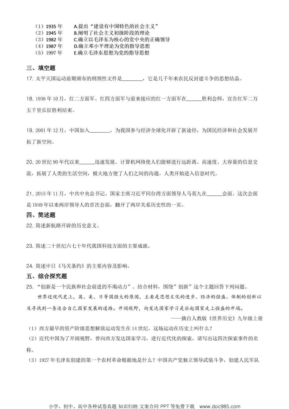 甘肃省天水市2020中考历史真题一、选择题1.国际联盟把虎门销烟开始的6月3日定为“国际禁烟日”,1987年联合国又把虎门销烟完成的翌日6月26日定为“国际禁毒日”。虎门销烟的民族英雄是A.邓世昌B.左宗棠C.魏源D.林则徐2.2020年1月,为防止新型冠状病毒传播,武汉毅然决定封城”。钟南山院士说:“武汉本来就是个英雄的城市",以下事件可以证明这观点的是A.义和团运动B.广州起义C.武昌起义D.金田起义3.胡适说:“北大是因为三只兔子而成名的,一是老兔子蔡元培,二是中兔子陈独秀,三是小兔子胡适本人(三人年有长序,但都属兔)。”“三只兔子”因高举哪两面大旗而闻名?()A.自强与求富B.维新与变法C.自由与平等D.民主与科学4.下列选项属于中国共产党成立的历史背景的有①十月革命的影响②中国工人阶级队伍发展壮大③北伐战争的胜利④中国共产党早期组织的建立A.①②③B.①②④C.②③④D.①③④5.全民族抗战以来,中国军队粉碎日军“不可战胜”的神话的第一个胜利是A.淞沪会战B.武汉会战C.平型关大捷D.徐州会战6.“它在一个占世界人口近四分之的大国里,冲破帝国主义的东方战线,极大地改变了世界的政治格局,鼓舞了世界上被压迫民族和人民争取解放的斗争,因而受到了世界人民的欢迎和支持。”这个材料主要描述的是A.中国抗日战争胜利的影响B.中华人民共和国成立的影响C.抗美援朝战争胜利的影响D.中国恢复在联合国的合法席位7.从“一五计划”到“十三五规划”,70年来,全世界没有个国家像中国这样坚持不懈,与时俱进的编制实施计划规划。“一五计划"实施的重点是A.发展轻工业、商业B.发展农业C.培养建设人才D.发展重工业8.习近平总书记赞扬道:他“用自己的实际行动,塑造了一个优秀共产党员和优秀县委书记的光辉形象”。习总书记赞扬的这位英雄模范人物是小学、初中、高中各种试卷真题知识归纳文案合同PPT等免费下载www.doc985.comA.王进喜B.焦裕禄C.雷锋D.邱少云9.1984年,有国际媒体评论:“中国政府开放整个海岸,意味着实际开放半个中国,它是三十五年来中国政府所采取的最大胆行动。”这个“大胆行动”指的是A.开放十四个沿海城市B.设珠江三角洲开放区C.设立深圳经济特区D.开放上海浦东新区10.20世纪90年代,海协会和海基会达成的重要共识是①海峡两岸直接实现通邮、通航、通商②坚持一个中国的原则③加强两岸经济交流、互补互利A.①②B.①③C.②③D.①②③11.“这是人类历史上民主制度对专制制度的一次重大胜利,它不仅奠定了一个大帝国崛起的政治基础,也宣告了世界资产阶级时代的到来。”“它"是A.新航路的开辟B.英国资产阶级革命C.法国大革命D.美国独立战争12.19世纪末20世纪初.随着三国同盟与三国协约的形成,国际局势更加动荡不安,争霸各国剑拔弩张.欧洲大陆的上空密布着战争的乌云。这两大集团的核心国家是A.意大利和法国B.日本和美国C.奥匈帝国和俄国D.德国和英国13.18世纪末19世纪初,涉及地区广,卷人人口多,斗争时间长,沉重地打击了西班牙和葡萄牙殖民统治的是A.拉丁美洲独立运动B.美国独立战争C.印度民族大起义D.第一次世界大战14.恩格斯曾评价巴尔扎克:“他的伟大的作品是对上流社会必然崩溃的一曲无尽的挽歌。”巴尔扎克的代表作是()A.《物种起源》B.《英雄交响曲》C.《人间喜剧》D.《向日葵》15.新型冠状病毒肆虐后,教育部要求延迟开学。为了不耽误学生的学习,大部分中小学开始尝试新的教学方法,“线上授课”应运而生。“线上授课”得益于A.资产阶级革命B.第一次工业革命C.第二次工业革命D.第三次科技革命二、配对题16.请将下边内容前的字母填入左边相关时间前的括号内小学、初中、高中各种试卷真题知识归纳文案合同PPT等免费下载www.doc985.com三、填空题17.太平天国运动前期颁布的纲领性文件是________,它是几千年来农民反封建斗争的思想结晶。18.1936年10月,红二方面军、红四方面军与前来接应的红一方面军在______胜利会师,宣告红军二万五千里长征胜利结束。19.2001年12月,中国加入________,为我国参与经济全球化开辟了新途径,为国民经济和社会发展开拓了新空间。20.20世纪90年代以来______迅速发展。计算机网络使人们能够进行远距离、高...