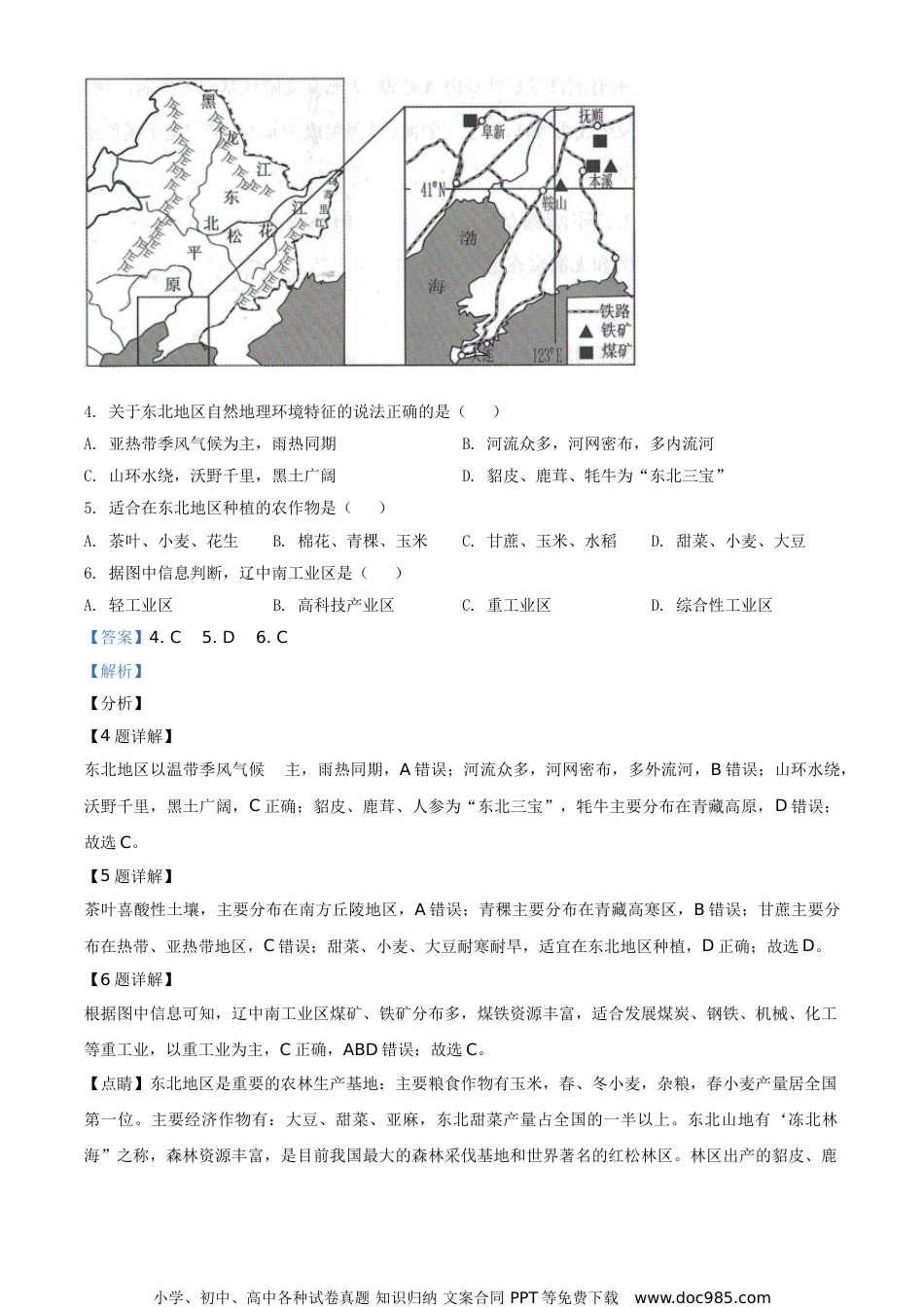 甘肃省武威市2021年中考地理真题(30分)一、选择题(每小题只有一个最符合题意的选项,请将正确选项涂写在答题卡相应位置,题2分,共16分)1.地球仪是为了便于认识地球,人们仿造地球的形状,按照一定比例缩小制作的地球模型(下图)。在地球仪上()A.所有经线互相等长,纬线也互相等长B.纬线的形状是圆,经线的形状是半圆C.0°纬线经过英国伦敦格林尼治天文台D.0°经线就是赤道把地球分为南北半球【答案】B【解析】【分析】【详解】所有经线互相等长,但纬线长度由赤道向两极递减,A错误;纬线的形状是圆,经线的形状是半圆,B正确;0°经线经过英国伦敦格林尼治天文台,C错误;0°纬线就是赤道把地球分为南北半球,D错误;故选B。【点睛】经线:经线是指地球上一切通过地轴的平面与地面相截而成的大圆称为“经圈”。经圈被两极分成的半圆称为“经线”,即“子午线”。经线表示当地的南北方向。同一经线上的各点经度相同。即把通过地轴的平面与地面相交而成的大圆,称经圈。所有的经圈都相交于南、北两极并被两极平分为两个半圆,称“经线”或“子午线”。经线指示南北方向;同所有纬线直交。地球上每条经线长度大致相等。纬线:所有纬线都是圆。纬度相同的纬线长度相同,纬度不同的纬线长度不相同.赤道是最长的纬线,向两极缩小为点。所有的纬线均相互平行。除极点外的纬线均指示东西方向。任意一条纬线均可独立成圈,但只有赤道能平分地球。任意两条相邻纬线的间隔相等。小学、初中、高中各种试卷真题知识归纳文案合同PPT等免费下载www.doc985.com读世界大洲大洋示意图(图),完成下面小题。2.据图判断,全部位于北半球的大洲是()A.欧洲和北美洲B.亚洲和欧洲C.北美洲和非洲D.非洲和亚洲3.关于各大洲的描述正确的是()A.甲大洲季风气候典型B.乙大洲为“热带大陆”C.丙大洲上多发达国家D.丁大洲多为黑色人种【答案】2.A3.A【解析】【分析】【2题详解】赤道是南北半球的分界线。读图可得,全部位于北半球的大洲是北美洲和欧洲。故选A。【3题详解】甲大洲为亚洲,东亚与南亚季风气候典型,A正确;乙大洲为北美洲,非洲大部分地区位于南北回归线之间,有“热带大陆”之称,B错误;丙大洲为非洲,非洲国家多为发展中国家,C错误;丁大洲为南美洲,主要是白色人种,多为黑色人种的是撒哈拉以南的非洲,D错误。故选A。【点睛】考查部分大洲的位置和特点,结合图示不难判断,属于基础题,需牢记南北半球的分界线名称和各大洲的主要特征。读我国东北地区及辽中南工业区示意图(下图),完成下面小题。小学、初中、高中各种试卷真题知识归纳文案合同PPT等免费下载www.doc985.com4.关于东北地区自然地理环境特征的说法正确的是()A.亚热带季风气候为主,雨热同期B.河流众多,河网密布,多内流河C.山环水绕,沃野千里,黑土广阔D.貂皮、鹿茸、牦牛为“东北三宝”5.适合在东北地区种植的农作物是()A.茶叶、小麦、花生B.棉花、青棵、玉米C.甘蔗、玉米、水稻D.甜菜、小麦、大豆6.据图中信息判断,辽中南工业区是()A.轻工业区B.高科技产业区C.重工业区D.综合性工业区【答案】4.C5.D6.C【解析】【分析】【4题详解】东北地区以温带季风气候为主,雨热同期,A错误;河流众多,河网密布,多外流河,B错误;山环水绕,沃野千里,黑土广阔,C正确;貂皮、鹿茸、人参为“东北三宝”,牦牛主要分布在青藏高原,D错误;故选C。【5题详解】茶叶喜酸性土壤,主要分布在南方丘陵地区,A错误;青稞主要分布在青藏高寒区,B错误;甘蔗主要分布在热带、亚热带地区,C错误;甜菜、小麦、大豆耐寒耐旱,适宜在东北地区种植,D正确;故选D。【6题详解】根据图中信息可知,辽中南工业区煤矿、铁矿分布多,煤铁资源丰富,适合发展煤炭、钢铁、机械、化工等重工业,以重工业为主,C正确,ABD错误;故选C。【点睛】东北地区是重要的农林生产基地:主要粮食作物有玉米,春、冬小麦,杂粮,春小麦产量居全国第一位。主要经济作物有:大豆、甜菜、亚麻,东北甜菜产量占全国的一半以上。东北山地有‘冻北林海”之称,森林资源丰富,是目前我国最大的森林采伐基地和世界著名的红松林区。林区出产的貂皮、鹿小学、...