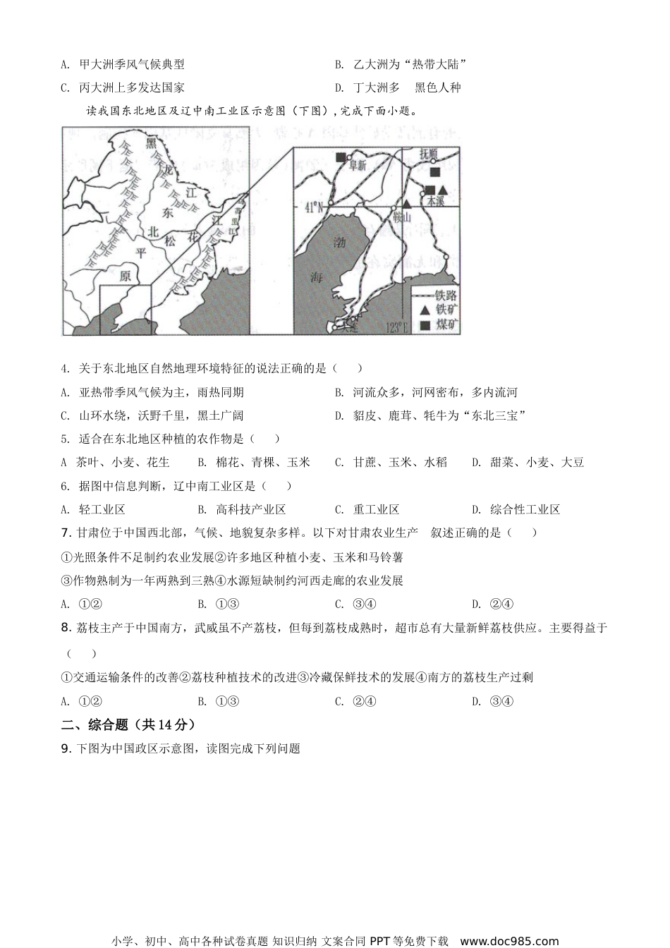 甘肃省武威市2021年中考地理真题(30分)一、选择题(每小题只有一个最符合题意的选项,请将正确选项涂写在答题卡相应位置,题2分,共16分)1.地球仪是为了便于认识地球,人们仿造地球的形状,按照一定比例缩小制作的地球模型(下图)。在地球仪上()A.所有经线互相等长,纬线也互相等长B.纬线的形状是圆,经线的形状是半圆C.0°纬线经过英国伦敦格林尼治天文台D.0°经线就是赤道把地球分为南北半球读世界大洲大洋示意图(图),完成下面小题。2.据图判断,全部位于北半球的大洲是()A.欧洲和北美洲B.亚洲和欧洲C.北美洲和非洲D.非洲和亚洲3.关于各大洲的描述正确的是()小学、初中、高中各种试卷真题知识归纳文案合同PPT等免费下载www.doc985.comA.甲大洲季风气候典型B.乙大洲为“热带大陆”C.丙大洲上多发达国家D.丁大洲多为黑色人种读我国东北地区及辽中南工业区示意图(下图),完成下面小题。4.关于东北地区自然地理环境特征的说法正确的是()A.亚热带季风气候为主,雨热同期B.河流众多,河网密布,多内流河C.山环水绕,沃野千里,黑土广阔D.貂皮、鹿茸、牦牛为“东北三宝”5.适合在东北地区种植的农作物是()A.茶叶、小麦、花生B.棉花、青棵、玉米C.甘蔗、玉米、水稻D.甜菜、小麦、大豆6.据图中信息判断,辽中南工业区是()A.轻工业区B.高科技产业区C.重工业区D.综合性工业区7.甘肃位于中国西北部,气候、地貌复杂多样。以下对甘肃农业生产的叙述正确的是()①光照条件不足制约农业发展②许多地区种植小麦、玉米和马铃薯③作物熟制为一年两熟到三熟④水源短缺制约河西走廊的农业发展A.①②B.①③C.③④D.②④8.荔枝主产于中国南方,武威虽不产荔枝,但每到荔枝成熟时,超市总有大量新鲜荔枝供应。主要得益于()①交通运输条件的改善②荔枝种植技术的改进③冷藏保鲜技术的发展④南方的荔枝生产过剩A.①②B.①③C.②④D.③④二、综合题(共14分)9.下图为中国政区示意图,读图完成下列问题小学、初中、高中各种试卷真题知识归纳文案合同PPT等免费下载www.doc985.com(1)据图描述我国的地理位置(提示:从纬度位置、海陆位置的角度描述)。(2)中国是一个海陆兼备的国家,国土面积____万平方千米,海域面积约300万平方千米。我国的领海有:____、黄海、____和南海,陆上邻国众多。(3)我国领土最北端位于漠河以北黑龙江主航道中心线,最南端位于南沙群岛附近的____,南北跨度大,气候差异大。(4)我国地势____高____低,呈阶梯状分布,河流多自西向东流,水能资源丰富。10.武威地理兴趣小组,为贫困山村实施产业脱贫进行实地调查。下图为该山村等高线地形图。读图完成下列问题。(1)该山村所处的地形为____,,①处河流的流向为____小学、初中、高中各种试卷真题知识归纳文案合同PPT等免费下载www.doc985.com(2)考察区域海拔最高点赤狐峰的海拔高度大于____米。(3)考察发现该地区在图中①、②两处均适宜修筑水坝,发展灌溉和淡水养殖。你认为应该选在①处还是②处,说明你的理由。小学、初中、高中各种试卷真题知识归纳文案合同PPT等免费下载www.doc985.com小学、初中、高中各种试卷真题知识归纳文案合同PPT等免费下载www.doc985.com