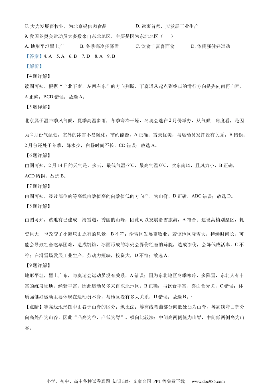 小学、初中、高中各种试卷真题知识归纳文案合同PPT等免费下载www.doc985.com金昌市2022年初中毕业及高中阶段教育招生考试地理试卷考生注意:本试卷满分为200分,考试时间为150分钟。所有试题均在答题卡上作答,否则无效。地理部分(100分)一、选择题(本大题共30小题,每小题只有一个正确答案,每小题2分,共60分)北京时间2022年1月15日,位于南太平洋岛国汤加境内(175.38°W,20.57°S)海底火山猛烈喷发并引发席卷太平洋的大范围海啸。读图“大洋洲略图”完成下面小题。1.汤加火山喷发地点最接近图中①、②、③、④中的()A.①B.②C.③D.④2.从五带划分看,图中①、②、③、④位于热带的是()A.①、②B.②、③C.③、④D.①、④3.图示区域中的密克罗尼西亚群岛、美拉尼西亚群岛中除了有大量珊瑚岛外,还有许多火山岛。本区多火山岛的原因是()A.位于板块内部,地壳稳定B.位于板块内部,地壳活跃C.位于板块边缘,地壳稳定D.位于板块边缘,地壳活跃【答案】1.C2.C3.D【解析】【1题详解】位于南太平洋岛国汤加境内(175.38°W,20.57°S),根据经纬度判断,可知汤加火山喷发地点最接近图中③地,C正确;①位于东半球,排除A;②、④位于北半球,排除BD,故选C。【2题详解】热带的纬度范围是23.5°N-23.5°S,北温带的纬度范围是23.5°N-66.5°N,北寒带的纬度范围是66.5°N-90°N,南温带的纬度范围是23.5°S-66.5°S,南寒带的纬度范围是66.5°S-90°S,③、④位于热带,C小学、初中、高中各种试卷真题知识归纳文案合同PPT等免费下载www.doc985.com正确;①位于南温带,②位于北温带,排除ABD;故选C。【3题详解】本区多火山岛的原因是位于板块边缘,地壳活跃,排除C,D正确;板块内部,地壳稳定,不会多火山地震,排除AB,故选D。【点睛】地质学家经过长期的研究,提出了板块构造学说,认为全球由六大板块组成,一般来说板块内部比较稳定,板块与板块交界地带,地壳比较活跃,多火山、地震;六大板块的名称是亚欧板块、非洲板块、印度洋板块、太平洋板块、美洲板块、南极洲板块。历届冬奥会主办城市几乎都位于北纬30度到北纬60度之间,举办时间一般在2月份。第24届“冬奥会”在我国北京、张家口两地举办。读图1、2完成下面小题。4.小海坨山滑雪场有甲、乙、丙、丁四个赛道,其中丁赛道从起点小海坨山到终点的滑行方向是()A.先向南再向西B.先向北再向西C.先向西再向北D.先向东再向北5.冬奧会举办时间往往设在2月份是因为()A.较为寒冷,利于保存积雪B.雪景优美,利于运动员发挥C.2月份我国各地降水较多D.2月白昼时间长,比赛项目多6.对2月14日北京天气描述正确的是()A.阴,微风,温差7℃B.多云,最低气温-7℃,最高气温0℃C.晴,东北风微风D.阴,最低气温-7℃,最高气温0℃7.从小海坨山顶沿虚线向M点出发,其经过部位的地形是()A.山谷B.鞍部C.陡坡D.山脊8.小海坨山冬奥后更适宜发展的行业是()A.借助秀丽的山峰和滑雪场,发展旅游业B.修建高档别墅区,提供高品质生活小学、初中、高中各种试卷真题知识归纳文案合同PPT等免费下载www.doc985.comC.大力发展畜牧业,为北京提供肉食品D.远离首都,应发展工业生产9.我国冬奥会运动员大多数来自东北地区,主要是因为东北地区()A.地形平坦黑土广B.冬季寒冷多降雪C.饮食丰富喜面食D.体质强健好运动【答案】4.A5.A6.B7.D8.A9.B【解析】【4题详解】读图可知,根据“上北下南,左西右东”的方向判断,丁赛道从起点到终点的滑行方向是先向南再向西,A正确,BCD错误;故选A。【5题详解】北京属于温带季风气候,夏季高温多雨,冬季寒冷干燥,冬奥会选在2月份举办,从气候的角度看,是因为2月份气温低,室外的冰雪不易融化,节约能源,A正确;雪景优美,与运动员发挥没有关系,B错误;2月份还处于冬季,降水少,白昼时间不长,CD错误;故选A。【6题详解】由图可知,2月14日的天气是,多云,最低气温-7℃,最高气温0℃,吹东南风,且风力小,B正确,ACD错误,故选B。【7题详解】由图可知,经过部位的等高线由数值高的向数值低的方向凸,为山脊,D正确,ABC错误;故选D。【8题详解】由图可知,该地有已建成的滑雪道,秀丽的山峰,因...