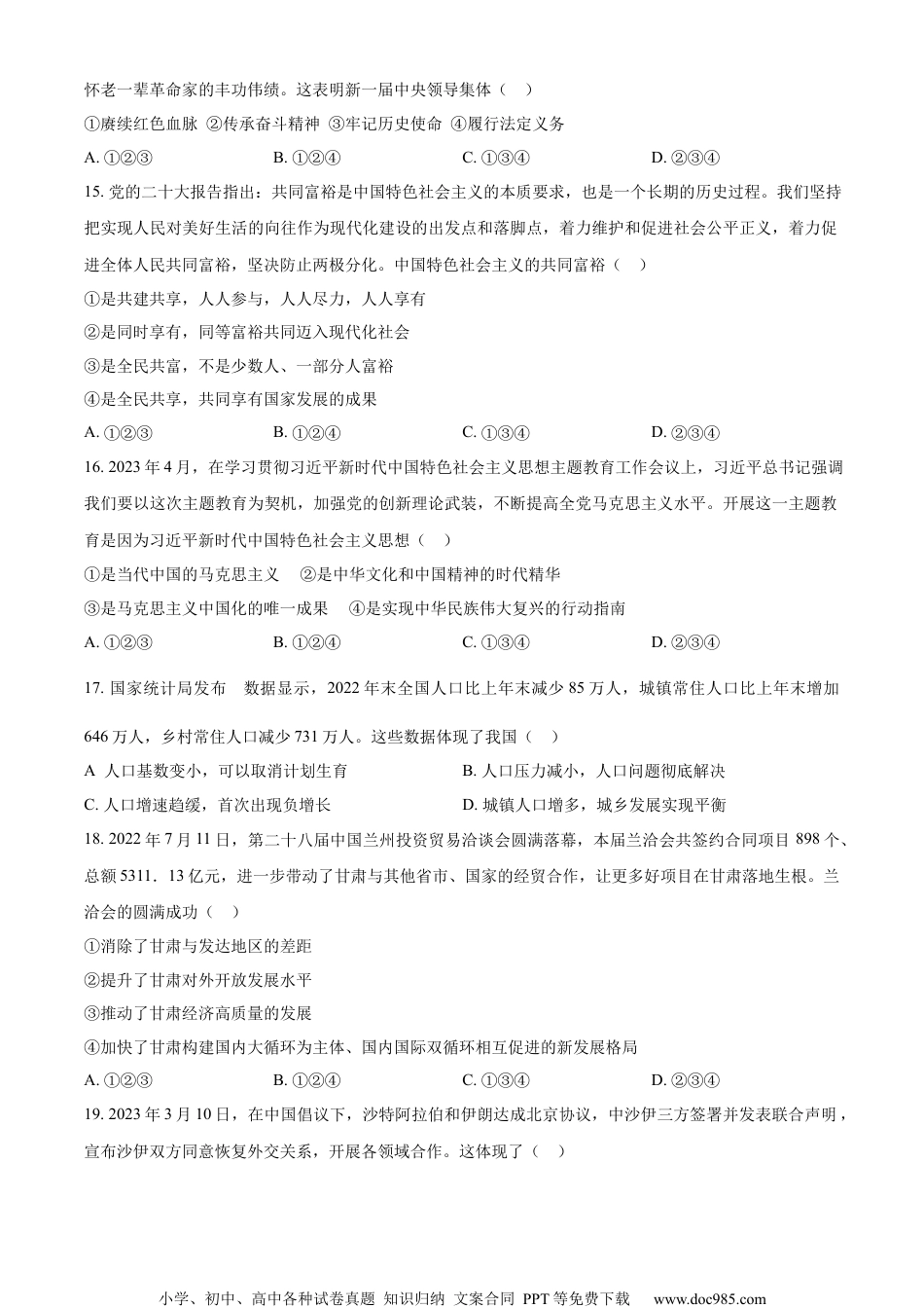 小学、初中、高中各种试卷真题知识归纳文案合同PPT等免费下载www.doc985.com2023年甘肃省金昌市中考道德与法治真题(100分)一、单项选择题(在下列各题的四个选项中,只有一项是最符合题意的。每小题2分,共40分)1.2022年10月16日,举世瞩目的中国共产党第二十次全国代表大会开幕。习近平同志向大会作了题为《高举__________伟大旗帜为全面建设社会主义现代化国家而团结奋斗》的报告。()A.邓小平理论B.三个代表C.科学发展观D.中国特色社会主义2.2022年12月29日,__________高铁全线正式开通运营,位于黄土高原的陕西、甘肃、宁夏三省区迎来了首条高铁环线,老边区凝聚起发展新动能。()A.银兰B.银西C.宝兰D.包兰3.2023年3月10日,十四届全国人大一次会议在北京人民大会堂举行第三次全体会议。__________全票当选为中华人民共和国主席、中华人民共和国中央军事委员会主席。()A.习近平B.李强C.赵乐际D.王沪宁4.下列选项中不属于毒品特征的是()A.依赖性B.危害性C.受管制性D.扩散性5.在我国毒品预防教育的首要重点对象是()A.无业人员B.青少年C.流动人口D.老年人6.自信、自强的青春态度给我们飞翔的翅膀,助力青春成长。这是因为()①青春的探索需要自信,自信让我们充满激情,拥有坚定的信心②自信的人有信心尝试与坚持,能获得更多实践机会与创造可能③自强的人能够不断克服自己的弱点,战胜和超越自己不断进步④拥有自信自强的人生态度,就会拥有美好的青春和成功的人生A.①②③B.①②④C.①③④D.②③④7.2023年5月20日,羽毛球苏迪曼杯进入到中国队与日本队的半决赛。中国国羽健儿在大比分落后的情况下敢打敢拼,实现超级大逆转,战胜日本队挺进决赛,并在随后的决赛中获胜,最终捧得苏迪曼杯。中国羽毛球队的胜利表明()A.团结的球队可以战胜一切对手B.球队的胜利完全看天赋和运气C.优秀的球队需要牺牲个人利益D.球队的力量源自队员团结协作8.2022年感动中国人物陆鸿,幼时因病导致脑瘫,不愿成为家人累赘的他,经历了摆摊、开店、学影视后期,练就一手绝活。2017年,他带领残疾人做自媒体、开网店。如今,他的工厂已成为远近闻名的残疾人扶贫创业基地。陆鸿的事迹告诉我们()A.只有成长为大学生,才能实现人生真正价值小学、初中、高中各种试卷真题知识归纳文案合同PPT等免费下载www.doc985.comB.生命是独特的,我们只需要关注自己的生命C.要正确对待挫折,勇于发掘自己生命的力量D.挫折是我们生命的一部分,挫折越大越成功9.兰州八旬老人鱼奶奶不慎在街头摔伤,两名学生将她安全背回家。到家后,鱼奶奶再三询问两人姓名,他们笑着说:“这是我们应该做的”,说完就匆匆离开了。这两名学生传递的正能量是()①助人为乐,彰显文明②扶危济困,与人为善③尊重生命,关爱他人④孝老爱亲,追求名利A.①②③B.①②④C.①③④D.②③④10.如图漫画《直播带货》警示我们青少年要()A.坚决抵制直播,自觉远离网络B.理性对待直播,学会辨析信息C.加快相关立法,加大执法力度D.出台相关措施,关停带货平台为深入推进“三抓三促”行动,甘肃省各市州人民政府面向广大人民群众发布公告,公开受理人民群众对各部门各单位和公职人员工作作风方面的意见和建议。据此完成下面小题。11.各市州人民政府这样做的目的是为了保障人民群众的()A.监督权B.平等权C.选举权D.劳动权12.实施这一举措有利于()①保障人民当家作主②赋予人民更多权利③规范政府权力运行④促进政府依法行政A.①②③B.①②④C.①③④D.②③④13.2022年度“甘肃好人榜”云发布仪式上,40名“甘肃好人”光荣上榜,他们的凡人善举,诠释着陇人品格、彰显着甘肃精神、体现着时代价值。“甘肃好人”的评选表彰活动()①杜绝了社会不良风气②弘扬了中华传统美德③树立了文明先进典范④传播了社会正能量A.①②③B.①②④C.①③④D.②③④14.党的二十大闭幕不到一周,中共中央总书记、国家主席、中央军委主席习近平带领新一届中共中央政治局常委专程从北京前往陕西延安,瞻仰延安革命纪念地,重温革命战争时期党中央在延安的峥嵘岁月,缅小学、初中、高中各种试卷真题知识归纳文案合同PPT等免费下载www.doc985.com怀老...