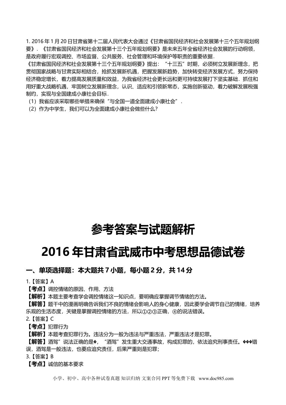 2016年甘肃省武威市中考思想品德试卷一、单项选择题:本大题共7小题,每小题2分,共14分1.如图漫画启示我们()①学会调控自己的情绪②培养乐观、幽默的生活态度③掌握排解不良情绪的方法④在不良情绪面前我们无能为力。A.①②③B.①②④C.①③④D.②③④2.自2016年4月1日开始至5月10日,甘肃省全省范围内开展了为期40天的道路交通安全专项整治行动,严查严惩“酒驾”等11种行为,以下对“酒驾”说法正确的是()A.“酒驾”是犯罪行为B.“酒驾”只要没有造成重大交通事故就不应追究责任C.“酒驾”发生重大交通事故,构成犯罪的,依法追究刑事责任D.“酒驾”只是一种不良行为3.2015年12月8日,甘肃省文明办召开新闻发布会,集中发布2015年第二期“共筑诚信,德润陇原”甘肃省诚信“红黑榜”,公布对“黑榜”上榜企业的惩戒措施。其中,共75家单位荣登诚信“红榜”,78家单位被列入“黑榜”名单。诚信“红黑榜”给我们的启示是()①对人守信,对事负责,是诚信的基本要求②言而有信,能使自我道德得到升华③为人诚实守信就能提高社会知名度④诚实守信是中华民族的传统美德。A.①②③B.①②④C.①③④D.②③④4.从2016年起,丝绸之路(敦煌)国际文化博览会将在甘肃每年举办一次。丝绸之路(敦煌)国际文化博览会以“推动文化交流、合谋合作发展”为宗旨,以丝绸之路精神为纽带,以文明互鉴与文化交流合作为主题,丝绸之路(敦煌)国际文化博览会将成为与丝绸之路沿线国家开展文化交流合作的重要窗口。对于外来文化,我们的态度应该是()A.保护自我、拒绝来往B.相互融合、实现统一C.取其精华、弃其糟粕D.照搬他人、摒弃自己5.2015年8月2日,国务院办公厅印发《关于全面实施城乡居民大病保险的意见》,部署加快推进城乡居民大病保险制度建设,筑牢全民基本医疗保障网底,让更多的人民群众受益。这一做法()A.能彻底消除城乡差别B.有利于维护社会公平正义C.有利于实现同步富裕D.能够使我国提前全面建成小康社会6.中学生王某在网上购买了一台步步高点读机,收到后才发现是伪劣产品,他根据《消费者权益保护法》及时投诉网店,最后网店按法律的规定赔偿了王某的损失。此案中王某主要维护了消费者的()A.生命健康权B.依法求偿权C.人身自由权D.自主选择权7.习近平于2015年10月19日至23日对英国进行了国事访问。中英两国在伦敦发表了《中英关于构建面向21世纪全球全面战略伙伴关系的联合宣言》.同时,中英双方还签署、达成了包括政府间和非商业协议、商业协议及其他成果在内的一系列协议和共识。此访说明了()A.我国在经济、政治、文化等各方面对世界开放B.“一国两制”方针是完全正确的,具有强大的生命力C.形成全方位开放新格局是建设中国特色社会主义的总任务D.全方位开放必须坚持民族平等、团结和共同繁荣的原则二、主题活动:共16分小学、初中、高中各种试卷真题知识归纳文案合同PPT等免费下载www.doc985.com1.2016年1月20日甘肃省第十二届人民代表大会通过《甘肃省国民经济和社会发展第十三个五年规划纲要》.《甘肃省国民经济和社会发展第十三个五年规划纲要》是未来五年全省经济社会发展的行动纲领,是政府履行宏观调控、市场监督、公共服务、社会管理和环境保护等职责的重要依据.《甘肃省国民经济和社会发展第十三个五年规划纲要》提出:“十三五”时期,必须树立发展新理念,把贯彻国家战略与甘肃实际相结合,抢抓发展新机遇,把握发展新趋势,加快转变经济发展方式,努力保持经济稳定增长,着力提高发展质量和效益,为我省经济社会更长远和更可持续发展打下坚实基础.抓住和用好重大战略机遇,牢固树立发展新理念,认识、适应和引领新常态,实施创新驱动,着力破解发展税强制约,实现与全国建成小康社会目标.(1)我省应该采取哪些举措来确保“与全国一道全面建成小康社会”.(2)作为中学生,我们可以为全面建成小康社会做些什么?参考答案与试题解析2016年甘肃省武威市中考思想品德试卷一、单项选择题:本大题共7小题,每小题2分,共14分1.【答案】A【考点】调控情绪的原因、作用、方法【解析】本题主要考查学会调控情绪这一知识点,要明确应掌握调节情绪的方法。【解...