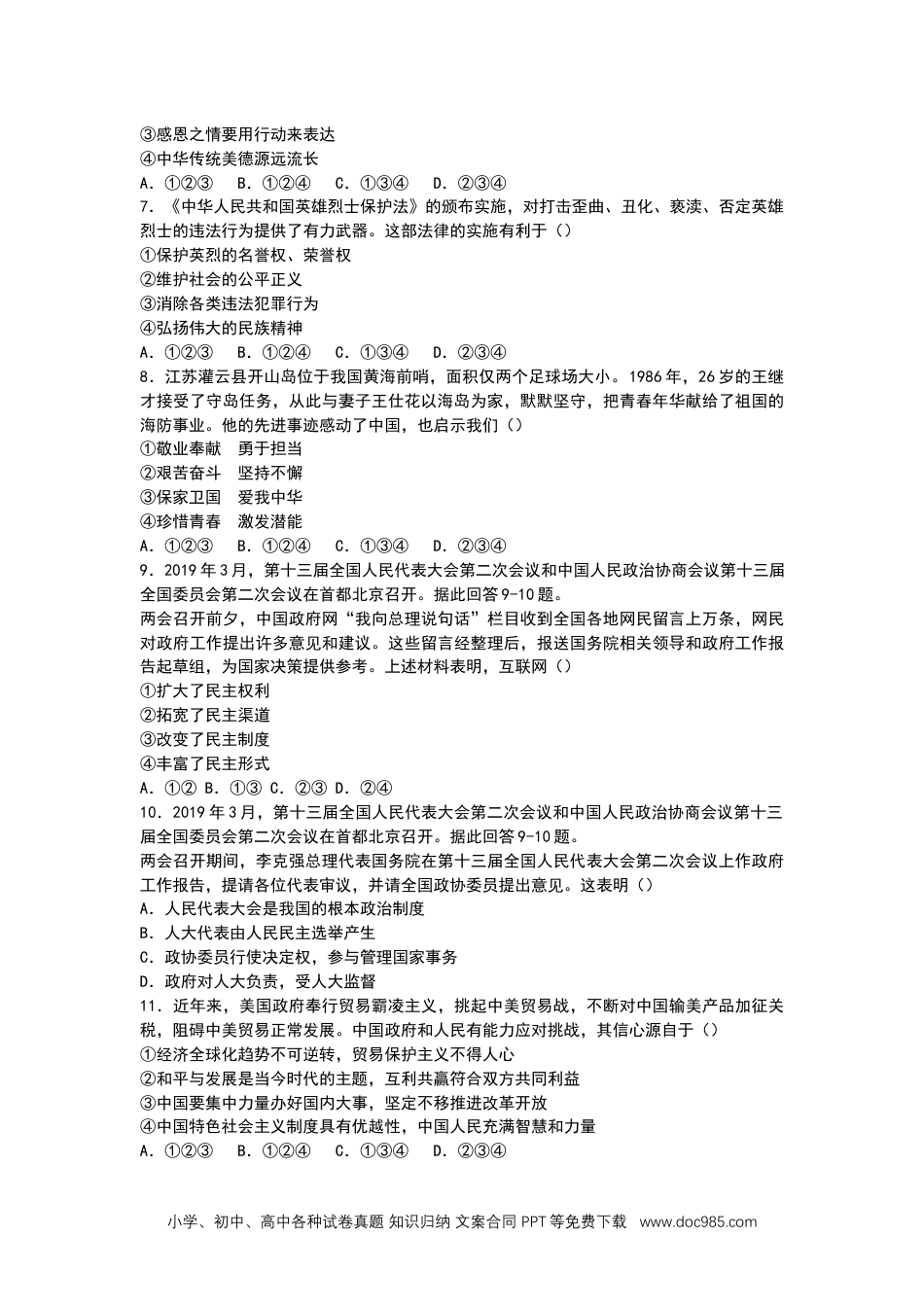 小学、初中、高中各种试卷真题知识归纳文案合同PPT等免费下载www.doc985.com2019年湖南省长沙市初中学业水平考试道德与法治试题一、选择题(在下列各题的四个选项中,只有一项是最符合题意的.每小题4分)1.2018年12月8日,我国在西昌卫星发射中心成功发射____探测器,开启人类首次月球____软着陆探测之旅。()A.嫦娥一号背面B.嫦娥二号正面C.嫦娥三号正面D.嫦娥四号背面2.经党中央研究决定,自2018年起我国将每年农历_____设立为“____”。这是第一个在国家层面为农民设立的节日,进一步彰显了“三农”工作重中之重的基础地位。()A.立秋中国农民丰收节B.秋分中国农民丰收节C.芒种中国农民播种节D.春分中国农民播种节3.2019年3月18日,习近平总书记在主持召开思想政治理论课教师座谈会时强调,我们要理直气壮开好思政课,用新时代中国特色社会主义思想铸魂育人,落实立德树人根本任务。习总书记的讲话温暖了每一位思政教师,同时也引领广大思政教师()①更加注重社会主义核心价值观教育②更加注重职业素养的提升③更加注重科学文化知识的传授④更加注重学习方法的指导A.①②B.①③C.②③D.②④4.漫画《马路杀手》(如图)警示我们()①遵守规则维护规则②行使权利捍卫权利③珍爱生命敬畏生命④调节情绪控制情绪A.①②③B.①②④C.①③④D.②③④5.“止于至善”是一种“虽不能至,心向往之”的实践过程,是一种向往美好、永不言弃的精神状态。下列古语与这一思想相一致的是()①勿以恶小而为之,勿以善小而不为②穷则独善其身,达则兼济天下③见贤思齐焉,见不贤而内自省也④独学而无友,则孤陋而寡闻A.①②③B.①②④C.①③④D.②③④6.“城东百尺倚崔嵬,迢递长安载土来。一片夕阳春树绿,慈鸟飞绕定王台。”相传汉景帝时,长沙王刘发担忧远在长安的母亲却不能相见,遂派专人代为探母并将长安的泥土带回,年复一年,带回的泥土堆成了高台--定王台。从这个故事中,我们可以体会到()①母子之间浓浓的骨肉亲情②亲人爱的碰撞不可避免小学、初中、高中各种试卷真题知识归纳文案合同PPT等免费下载www.doc985.com③感恩之情要用行动来表达④中华传统美德源远流长A.①②③B.①②④C.①③④D.②③④7.《中华人民共和国英雄烈士保护法》的颁布实施,对打击歪曲、丑化、亵渎、否定英雄烈士的违法行为提供了有力武器。这部法律的实施有利于()①保护英烈的名誉权、荣誉权②维护社会的公平正义③消除各类违法犯罪行为④弘扬伟大的民族精神A.①②③B.①②④C.①③④D.②③④8.江苏灌云县开山岛位于我国黄海前哨,面积仅两个足球场大小。1986年,26岁的王继才接受了守岛任务,从此与妻子王仕花以海岛为家,默默坚守,把青春年华献给了祖国的海防事业。他的先进事迹感动了中国,也启示我们()①敬业奉献勇于担当②艰苦奋斗坚持不懈③保家卫国爱我中华④珍惜青春激发潜能A.①②③B.①②④C.①③④D.②③④9.2019年3月,第十三届全国人民代表大会第二次会议和中国人民政治协商会议第十三届全国委员会第二次会议在首都北京召开。据此回答9-10题。两会召开前夕,中国政府网“我向总理说句话”栏目收到全国各地网民留言上万条,网民对政府工作提出许多意见和建议。这些留言经整理后,报送国务院相关领导和政府工作报告起草组,为国家决策提供参考。上述材料表明,互联网()①扩大了民主权利②拓宽了民主渠道③改变了民主制度④丰富了民主形式A.①②B.①③C.②③D.②④10.2019年3月,第十三届全国人民代表大会第二次会议和中国人民政治协商会议第十三届全国委员会第二次会议在首都北京召开。据此回答9-10题。两会召开期间,李克强总理代表国务院在第十三届全国人民代表大会第二次会议上作政府工作报告,提请各位代表审议,并请全国政协委员提出意见。这表明()A.人民代表大会是我国的根本政治制度B.人大代表由人民民主选举产生C.政协委员行使决定权,参与管理国家事务D.政府对人大负责,受人大监督11.近年来,美国政府奉行贸易霸凌主义,挑起中美贸易战,不断对中国输美产品加征关税,阻碍中美贸易正常发展。中国政府和人民有能力应对...