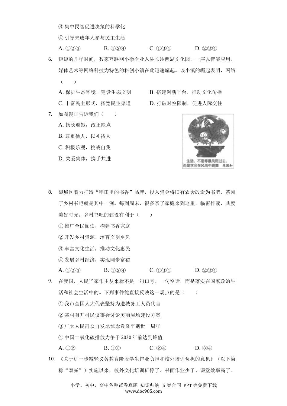 小学、初中、高中各种试卷真题知识归纳文案合同PPT等免费下载www.doc985.com2022年湖南省长沙市中考道德与法治试卷一、单项选择题(本大题共12小题,共48.0分)1.2021年11月8日至11日,中国共产党第十九届中央委员会第六次全体会议召开,审议通过《中共中央关于党的百年奋斗重大成就和历史经验的决议》。以下属于党的十八大以来,党领导人民在中国特色社会主义进入新时代取得的成就是()A.全面建成小康社会B.解决了人民的温饱问题C.迈入社会主义社会D.成立了中华人民共和国2.2022年2月4日,举世瞩目的北京第二十四届冬季奥林匹克运动会正式开幕。场内、场外,中国、世界,共同唱响“一起向未来”的冰雪欢歌。“一起向未来”传递着()A.趋利避害、独善其身的朴素期盼B.守望相助、命运与共的美好愿景C.尽力而为、量力而行的处世准则D.奋勇前进、主导世界的价值追求3.“七一勋章”获得者艾爱国从学徒做起,学气焊、电焊,舍得吃苦,不怕吃亏,在焊工岗位坚持50多年,成为焊接行业领军人物。这启示我们()①遵守规则,维护秩序②学会学习,终身学习③立足岗位,实干兴邦④坚持不懈,努力奋斗A.①②③B.①②④C.①③④D.②③④4.我们可能有过这样的经历,话音刚落,广告就到了,是手机App在“偷听”我们吗?这其实是某些不法App擅自调用手机麦克风、通讯录等权限,违法违规收集、使用个人信息的行为。对此,相关App运营商须()A.严格执法,打击违法经营者B.严守底线,诚信合法经营C.积极举报,保护公民隐私权D.完善法规,维护信息安全5.长沙在创建儿童友好型城市过程中,由孩子们亲手设计“儿童友好城市”图标,努力让每位孩子都有机会参与城市决策,让城市的规划者和建设者都能听到孩子们的声音。上述做法旨在()①增强未成年人遵纪守法观念②尊重保障未成年人合法权益小学、初中、高中各种试卷真题知识归纳文案合同PPT等免费下载www.doc985.com③集中民智促进决策的科学化④引导未成年人参与民主生活A.①②③B.①②④C.①③④D.②③④6.短短的几年时间,数家互联网小微企业入驻长沙西湖文化园,一座以智能应用、媒体艺术等网络科技为特色的科创小镇在此迅速崛起。该小镇的崛起表明,网络()A.保护生态环境,建设生态文明B.搭建创新平台,推动文化传播C.丰富民主形式,拓宽民主渠道D.打破时空限制,促进人际交往7.如图漫画告诉我们()A.扬长避短,改正缺点B.尊重他人,以礼待人C.积极乐观,挑战自我D.关爱集体,携手共进8.望城区着力打造“稻田里的书香”品牌,投入资金将旧有农舍改造为书吧,茶园子乡村书吧就是其中一例。每到周末,很多亲子家庭来到这里,临窗伴读,共度美好时光。乡村书吧的建设有利于()①推广全民阅读,构建书香家庭②开发乡村资源,培育文明乡风③丰富文化生活,推动文化惠民④发展乡村经济,实现同步富裕A.①②③B.①②④C.①③④D.②③④9.在我国,人民当家作主从来就不是一句口号、一句空话,而是落实在国家政治生活和社会生活中的。下列事件能直接反映这一观点的是()①我市全国人大代表坚持为进城务工人员代言②某村召开村民议事会讨论美丽屋场建设方案③广大人民群众自发地悼念袁隆平逝世一周年④中国二氧化碳排放力争于2030年前达到峰值A.①②B.①③C.②④D.③④10.《关于进一步减轻义务教育阶段学生作业负担和校外培训负担的意见》(以下简称“双减”)实施以来,校外文化培训班停了、书面作业少了、课堂效率高了。小学、初中、高中各种试卷真题知识归纳文案合同PPT等免费下载www.doc985.com孩子们走进大自然、博物馆、运动场……推进“双减”政策的积极作用有()①弱化家庭教育责任②提高教育教学质量③杜绝学生课外培训④促进学生全面发展A.①②B.①③C.②④D.③④11.中国恢复联合国合法席位以来,积极倡导以和平方式政治解决争端,派出5万多人次参加联合国维和行动,向多个国家和国际组织提供了新冠病毒疫苗中国用实际行动()①主动参与经济竞争②谋求世界合作共赢③积极参与全球治理④维护国际公共秩序A.①②③B.①②④C.①③④D.②③④12.2022年5月,湖南某校开展“禁毒进校园,护航青少年”主题教育活动,禁毒讲师为全校师生进行专题授...