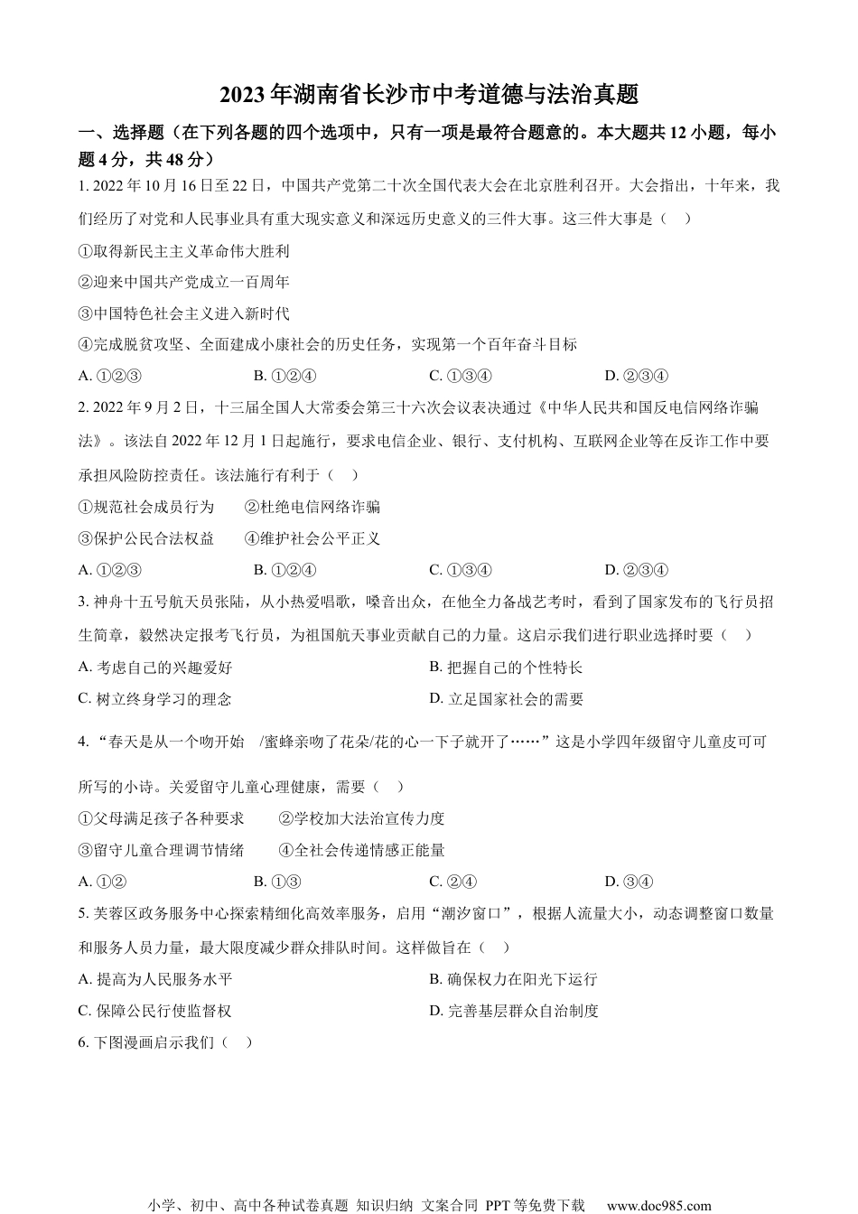 小学、初中、高中各种试卷真题知识归纳文案合同PPT等免费下载www.doc985.com2023年湖南省长沙市中考道德与法治真题一、选择题(在下列各题的四个选项中,只有一项是最符合题意的。本大题共12小题,每小题4分,共48分)1.2022年10月16日至22日,中国共产党第二十次全国代表大会在北京胜利召开。大会指出,十年来,我们经历了对党和人民事业具有重大现实意义和深远历史意义的三件大事。这三件大事是()①取得新民主主义革命伟大胜利②迎来中国共产党成立一百周年③中国特色社会主义进入新时代④完成脱贫攻坚、全面建成小康社会的历史任务,实现第一个百年奋斗目标A.①②③B.①②④C.①③④D.②③④2.2022年9月2日,十三届全国人大常委会第三十六次会议表决通过《中华人民共和国反电信网络诈骗法》。该法自2022年12月1日起施行,要求电信企业、银行、支付机构、互联网企业等在反诈工作中要承担风险防控责任。该法施行有利于()①规范社会成员行为②杜绝电信网络诈骗③保护公民合法权益④维护社会公平正义A.①②③B.①②④C.①③④D.②③④3.神舟十五号航天员张陆,从小热爱唱歌,嗓音出众,在他全力备战艺考时,看到了国家发布的飞行员招生简章,毅然决定报考飞行员,为祖国航天事业贡献自己的力量。这启示我们进行职业选择时要()A.考虑自己的兴趣爱好B.把握自己的个性特长C.树立终身学习的理念D.立足国家社会的需要4.“春天是从一个吻开始的/蜜蜂亲吻了花朵/花的心一下子就开了……”这是小学四年级留守儿童皮可可所写的小诗。关爱留守儿童心理健康,需要()①父母满足孩子各种要求②学校加大法治宣传力度③留守儿童合理调节情绪④全社会传递情感正能量A.①②B.①③C.②④D.③④5.芙蓉区政务服务中心探索精细化高效率服务,启用“潮汐窗口”,根据人流量大小,动态调整窗口数量和服务人员力量,最大限度减少群众排队时间。这样做旨在()A.提高为人民服务水平B.确保权力在阳光下运行C.保障公民行使监督权D.完善基层群众自治制度6.下图漫画启示我们()小学、初中、高中各种试卷真题知识归纳文案合同PPT等免费下载www.doc985.comA.交友投分,切磨箴规B.没有规矩,不成方圆C.千里之行,始于足下D.尺有所短,寸有所长7.近年来,村际足球赛、篮球赛等乡村运动会火爆全国。村民参赛者精神抖擞,村民啦啦队呐喊助威,形成一道亮丽的风景。各地开展乡村运动会的积极作用有()①丰富乡村文化生活,助力乡村振兴②弘扬体育精神,建设健康中国③推进民主政治建设,描绘美丽乡村④完善基础设施,促进强村富民A.①②B.①③C.②④D.③④8.某小区一名业主要求在自家车位上安装新能源汽车充电装置,小区物业以电容量不足为由拒绝。业主起诉后,法院认为安装充电装置符合物权使用规定,使用新能源汽车符合国家相关政策,应鼓励与推广。法院依法判决,业主有权安装充电装置,物业提供必要协助。由此可见()①诉讼是解决纠纷的有效方式②业主起诉物业属于行政诉讼③国家倡导节能低碳生活方式④物业拒绝安装属于犯罪行为A.①②B.①③C.②④D.③④9.各族人民要铸牢中华民族共同体意识,像石榴籽一样紧紧抱在一起。下列事件能直接反映这一观点的是()A.世界旅游城市联合会长沙香山旅游峰会隆重开幕B.国家给某山区义务教育阶段学生提供免费营养餐C.天心区北塘经济联合社深入推进“清廉村居”建设D.湖南湘西十八洞村与新疆吐鲁番市西门村结对共建10.2022年4月15日至5月16日开展的党的二十大相关工作网络征求意见活动,得到了人民群众广泛响应,来自全国各地、各行各业的网友积极建言献策,共收集意见建议留言超过854.2万条、2.9亿字。这表明()小学、初中、高中各种试卷真题知识归纳文案合同PPT等免费下载www.doc985.com①我国社会主义民主是最广泛、最真实、最管用的民主②我国公民民主意识不断增强,积极参与民主生活③选举权和被选举权是公民的一项基本政治权利④人民政协履行了民主监督和参政议政的职能A.①②B.①③C.②④D.③④11.某校开展“寻访长沙考古遗址”暑假社会实践活动,以下是活动路线图。学生参与此项活动有利于()①坚定文化自信②培养诚信品质③提升探究能力④拓宽学生视野A.①...