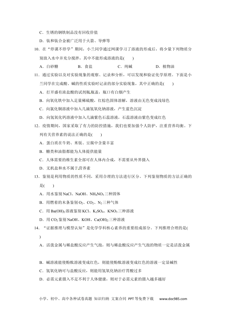 小学、初中、高中各种试卷真题知识归纳文案合同PPT等免费下载www.doc985.com2020年长沙市初中学业水平考试试卷化学一、选择题(本大题共15小题,每小题3分,共45分。每小题只有1个选项符合题意。请将符合题意的选项用2B铅笔填涂在答题卡相应位置)1.酒精是一种常用的消毒剂,在抗疫期间被广泛使用。下列有关酒精性质的描述属于化学性质的是()A.具有可燃性B.易挥发C.有特殊气味D.易溶于水2.今年,长沙的空气质量明显改善,空气是一种宝贵的自然资源。下列说法正确的是()A.洁净的空气是纯净物B.空气中体积分数最大的是氮气C.氧气有助燃性,常用作燃料D.空气中臭氧(O3)含量少,属于稀有气体3.化学是一门以实验为基础的科学,取用液体药品时应注意安全、规范操作。下列操作正确的是()A.滴加液体B.倾倒液体C.量取液体体积D.稀释浓硫酸4.今年,“中国水周”的宣传主题为“坚持节水优先,建设幸福河湖”。下列关于爱护水资源的说法正确的是()A.地球上的总水储量很少,所以要节约用水B.为了节约用水,提倡直接用工业废水灌溉农田C.生活污水应逐步实现集中处理和排放D.为了防止水体污染,禁止使用化肥和农药小学、初中、高中各种试卷真题知识归纳文案合同PPT等免费下载www.doc985.com5.“宏观﹣﹣微观﹣﹣符号”是学习化学的重要内容和方法。如图是几种分子的模型,请由图分析,下列说法正确的是()A.氧气含有氧元素,属于氧化物B.氢气由2个氢原子构成C.1个氨分子由1个氮原子和3个氢原子构成D.二氧化碳含有碳元素,属于有机物6.工业上常用煅烧石灰石的方法制取CO2,反应的化学方程式为:CaCO3CaO+CO2↑.该反应所属的基本反应类型是()A.化合反应B.分解反应C.置换反应D.复分解反应7.两位英国科学家因在石墨烯材料方面的开创性研究获得2020年诺贝尔奖。石墨烯是由碳元素组成的单质,下列关于碳单质的说法正确的是()A.金刚石是天然存在的最硬的物质,可用来裁玻璃B.石墨有金属光泽,有导电性,所以是一种金属C.活性炭具有吸附性,可以吸附所有物质D.金刚石、石墨和足球烯(C60)都是由碳原子直接构成的8.2020年6月13日,浙江温岭的槽罐车爆炸事故造成了重大人员伤亡和财产损失。下列有关易燃物和易爆物的生产、运输、使用和贮存的说法正确的是()A.生产:面粉加工厂应标有“严禁烟火”字样或图标B.运输:为方便运输,将烟花厂建在市中心C.使用:家用天然气泄漏时,用打火机检测泄露位置D.贮存:为节约空间,应将易燃物和易爆物紧密堆积9.北斗系统的全面建成彰显了中国航天的力量,在航天科技中会用到大量金属材料。下列有关金属材科的说法正确的是()A.合金中一定只含金属元素B.纯铜比黄铜的硬度更大小学、初中、高中各种试卷真题知识归纳文案合同PPT等免费下载www.doc985.comC.生锈的钢铁制品没有回收价值D.钛和钛合金被广泛用于火箭、导弹等10.在“停课不停学”期间,小兰同学通过网课学习了溶液的形成后,将少量下列物质分别放入水中并充分搅拌,其中不能形成溶液的是()A.白砂糖B.食盐C.纯碱D.植物油11.通过实验以及对实验现象的观察、记录和分析,可以发现和验证化学原理。下面是小兰同学在完成酸、碱的性质实验时记录的部分实验现象,其中正确的是()A.打开盛有浓盐酸的试剂瓶瓶盖,瓶口有白烟产生B.向氧化铁中加入足量稀硫酸,红棕色固体溶解,溶液由无色变成浅绿色C.向氯化铜溶液中加入几滴氢氧化钠溶液,产生蓝色沉淀D.向氢氧化钙溶液中加入几滴紫色石蕊溶液,石蕊溶液由紫色变成红色12.疫情期间,国家采取了有力的防控措施,我们也要加强个人防护,注重营养均衡。下列有关营养素的说法正确的是()A.蛋白质在牛奶、米饭、豆腐中含量丰富B.糖类和油脂都能为人体提供能量C.人体需要的维生素全部可在人体内合成,不需要从外界摄入D.无机盐和水不属于营养素13.鉴别是利用物质的性质不同,采用合理的方法进行区分。下列鉴别物质的方法正确的是()A.用水鉴别NaCl、NaOH、NH4NO3三种固体B.用燃着的木条鉴别O2、CO2、N2三种气体C.用Ba(OH)2溶液鉴别KCl、K2SO4、KNO3三种溶液D.用CO2鉴别NaOH、KOH、Ca(OH)2三种溶液14.“证据推理与模型...