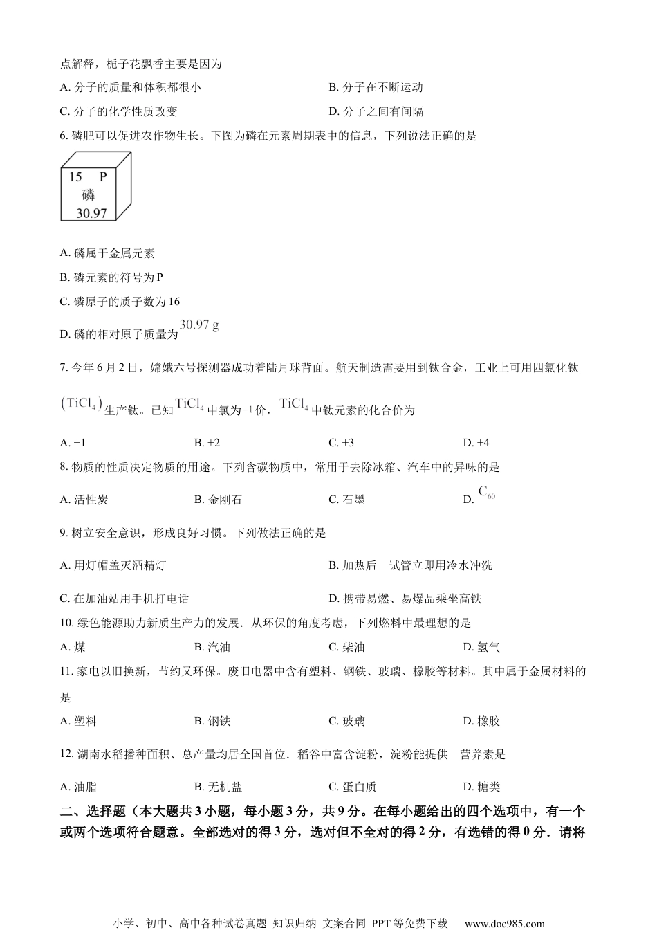 小学、初中、高中各种试卷真题知识归纳文案合同PPT等免费下载www.doc985.com2024年长沙市初中学业水平考试试卷化学注意事项:1.答题前,请考生先将自己的姓名、准考证号填写清楚,并认真核对条形码上的姓名、准考证号、考室和座位号:2.必须在答题卡上答题,在草稿纸、试题卷上答题无效;3.答题时,请考生注意各大题题号后面的答题提示;4.请勿折叠答题卡,保持字体工整、笔迹清晰、卡面清洁;5.答题卡上不得使用涂改液、涂改胶和贴纸:6.本学科试卷共五大题,23小题。考试时量60分钟,满分100分。可能用到的相对原子质量:H-1C-12O-16Na-23一、选择题(本大题共12小题,每小题3分,共36分。每小题只有一个选项符合题意,请将符合题意的选项用2B铅笔填涂在答题卡相应位置。)1.“雷小锋”爱心义卖活动在各学校开展。下列制作义卖品的过程中涉及化学变化的是A.编手链B.剪窗花C.烧火熬粥D.榨甘蔗汁2.科学种田,助力乡村振兴,农作物的生长需要适宜的酸碱性土壤。小张同学在实验室测量土壤样品酸碱度时,下列操作正确的是A.取水B.量水C.溶解D.测3.神舟十八号“太空养鱼”项目进展顺利。下列能供给斑马鱼和宇航员呼吸的气体是A.B.C.D.4.今年5月1日,我国首部《节约用水条例》正式施行。下列做法正确的是A.园林浇灌采用大水浸灌B.洗手接洗手液时不关水龙头C.工业用水不重复利用D.家庭使用节水器具,如节水型洗衣机5.今年5月19日是第14个“中国旅游日”,20万朵栀子花空降长沙、武汉,栀香飘满城。请用分子的观小学、初中、高中各种试卷真题知识归纳文案合同PPT等免费下载www.doc985.com点解释,栀子花飘香主要是因为A.分子的质量和体积都很小B.分子在不断运动C.分子的化学性质改变D.分子之间有间隔6.磷肥可以促进农作物生长。下图为磷在元素周期表中的信息,下列说法正确的是A.磷属于金属元素B.磷元素的符号为PC.磷原子的质子数为16D.磷的相对原子质量为7.今年6月2日,嫦娥六号探测器成功着陆月球背面。航天制造需要用到钛合金,工业上可用四氯化钛生产钛。已知中氯为价,中钛元素的化合价为A.+1B.+2C.+3D.+48.物质的性质决定物质的用途。下列含碳物质中,常用于去除冰箱、汽车中的异味的是A.活性炭B.金刚石C.石墨D.9.树立安全意识,形成良好习惯。下列做法正确的是A.用灯帽盖灭酒精灯B.加热后的试管立即用冷水冲洗C.在加油站用手机打电话D.携带易燃、易爆品乘坐高铁10.绿色能源助力新质生产力的发展.从环保的角度考虑,下列燃料中最理想的是A.煤B.汽油C.柴油D.氢气11.家电以旧换新,节约又环保。废旧电器中含有塑料、钢铁、玻璃、橡胶等材料。其中属于金属材料的是A.塑料B.钢铁C.玻璃D.橡胶12.湖南水稻播种面积、总产量均居全国首位.稻谷中富含淀粉,淀粉能提供的营养素是A.油脂B.无机盐C.蛋白质D.糖类二、选择题(本大题共3小题,每小题3分,共9分。在每小题给出的四个选项中,有一个或两个选项符合题意。全部选对的得3分,选对但不全对的得2分,有选错的得0分.请将小学、初中、高中各种试卷真题知识归纳文案合同PPT等免费下载www.doc985.com符合题意的选项用2B铅笔填涂在答题卡相应位置。)13.今年4月22日是第55个世界地球日,其主题为“全球战塑”,旨在呼吁终结塑料危害。下列做法正确的是A.露天焚烧塑料垃圾B.鼓励大量使用一次性塑料袋购物C.回收矿泉水塑料瓶D.使用可降解塑料盒14.利用溶解度曲线,可以获得许多有关物质溶解度的信息。甲、乙两种物质的溶解度曲线如图所示。下列说法正确的是A.在℃时,甲和乙的溶解度均为B.在℃时,甲的溶解度小于乙的溶解度C.甲、乙两种物质的溶解度随着温度的升高而减小D.升高温度,可将甲的不饱和溶液变为饱和溶液15.通过实验可以验证物质的性质。下列试剂中,能验证铁、铜的金属活动性顺序的是A.稀硫酸B.蒸馏水C.硫酸铜溶液D.澄清石灰水三、填空题(本大题共5小题,化学方程式每个3分,其余每空2分,共30分。)16.认真阅读下列材料,回答有关问题.中华文明源远流长,文物承载着文明的记忆。汉代铜牛形缸灯是湖南省博物院的馆藏文物之一(见图),这种青铜灯以动物油脂(主要含碳、氢、氧三种元素)为燃料,其油料燃烧产生的气体或烟...