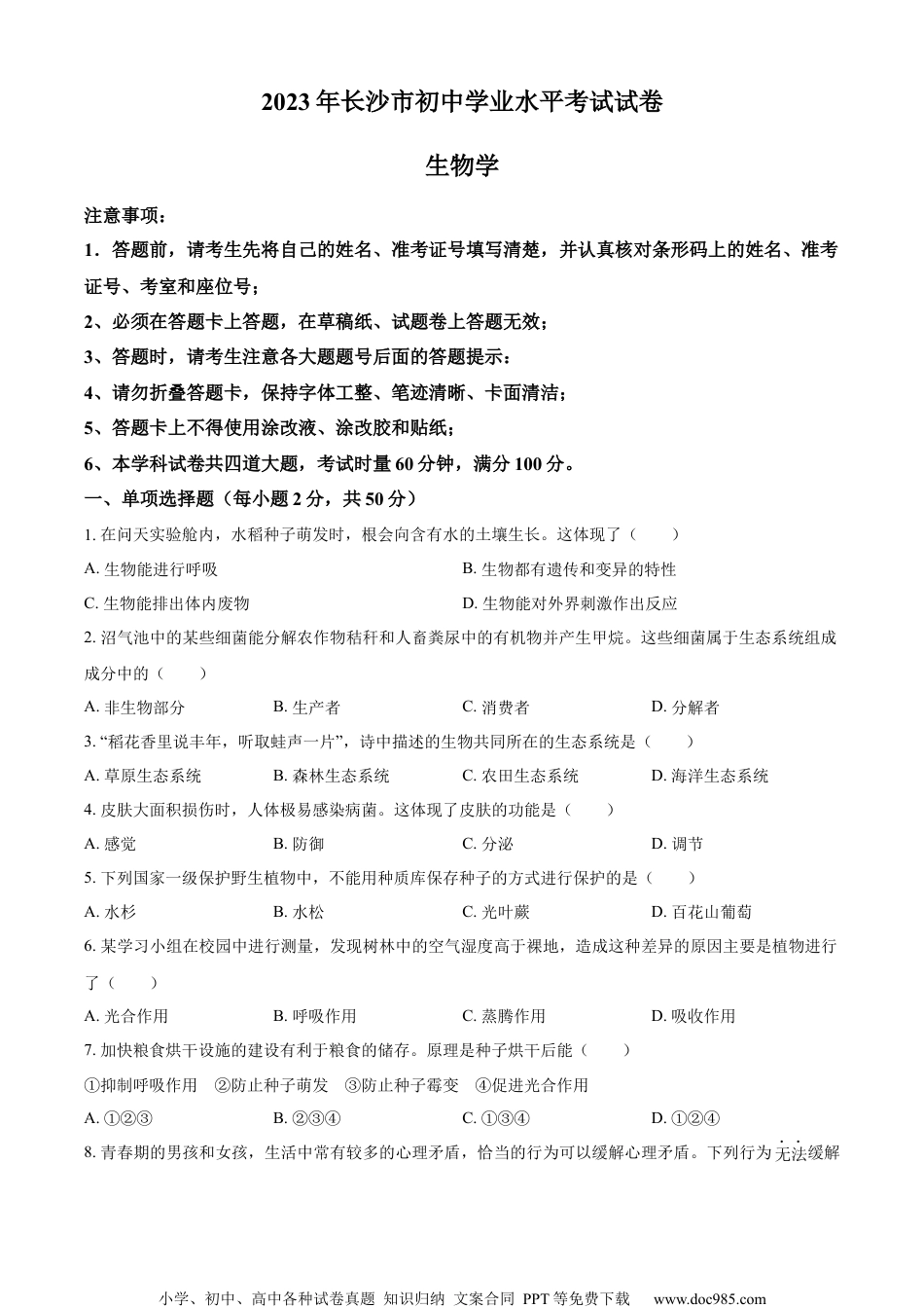 小学、初中、高中各种试卷真题知识归纳文案合同PPT等免费下载www.doc985.com2023年长沙市初中学业水平考试试卷生物学注意事项:1.答题前,请考生先将自己的姓名、准考证号填写清楚,并认真核对条形码上的姓名、准考证号、考室和座位号;2、必须在答题卡上答题,在草稿纸、试题卷上答题无效;3、答题时,请考生注意各大题题号后面的答题提示:4、请勿折叠答题卡,保持字体工整、笔迹清晰、卡面清洁;5、答题卡上不得使用涂改液、涂改胶和贴纸;6、本学科试卷共四道大题,考试时量60分钟,满分100分。一、单项选择题(每小题2分,共50分)1.在问天实验舱内,水稻种子萌发时,根会向含有水的土壤生长。这体现了()A.生物能进行呼吸B.生物都有遗传和变异的特性C.生物能排出体内废物D.生物能对外界刺激作出反应2.沼气池中的某些细菌能分解农作物秸秆和人畜粪尿中的有机物并产生甲烷。这些细菌属于生态系统组成成分中的()A.非生物部分B.生产者C.消费者D.分解者3.“稻花香里说丰年,听取蛙声一片”,诗中描述的生物共同所在的生态系统是()A.草原生态系统B.森林生态系统C.农田生态系统D.海洋生态系统4.皮肤大面积损伤时,人体极易感染病菌。这体现了皮肤的功能是()A.感觉B.防御C.分泌D.调节5.下列国家一级保护野生植物中,不能用种质库保存种子的方式进行保护的是()A.水杉B.水松C.光叶蕨D.百花山葡萄6.某学习小组在校园中进行测量,发现树林中的空气湿度高于裸地,造成这种差异的原因主要是植物进行了()A.光合作用B.呼吸作用C.蒸腾作用D.吸收作用7.加快粮食烘干设施的建设有利于粮食的储存。原理是种子烘干后能()①抑制呼吸作用②防止种子萌发③防止种子霉变④促进光合作用A.①②③B.②③④C.①③④D.①②④8.青春期的男孩和女孩,生活中常有较多的心理矛盾,恰当的行为可以缓解心理矛盾。下列行为无法缓解小学、初中、高中各种试卷真题知识归纳文案合同PPT等免费下载www.doc985.com心理矛盾的是()A.积极参加体育锻炼B.主动与父母、朋友沟通交流C.遇到挫折自暴自弃D.适度自我安慰、自我鼓励9.早晚刷牙、饭后漱口有利于保持牙齿健康。牙齿的主要作用是()A.分泌唾液B.切断和磨碎食物C.搅拌食物D.感受味道的刺激10.食品安全问题关乎公民的生命安全和身体健康。下列符合食品安全要求的是()A.发芽的土豆B.未知的野生蘑菇C.“三无”辣条D.检疫合格的肉类11.冬天,外界寒冷的空气经呼吸道到达肺部时,温度可升至37℃,避免对肺造成损伤。这说明呼吸道能()A.温暖空气B.湿润空气C.清洁空气D.顺畅通气12.如图为胎盘和脐带示意图。胎盘内有许多绒毛,绒毛与绒毛之间充满了母体的血液;脐带与胎儿相连,内有脐动脉和脐静脉,连接它们的毛细血管位于绒毛内。胎盘的作用是()A.产生卵细胞B.进行物质交换C.输送卵细胞D.分泌雌性激素13.如图为胎盘和脐带示意图。胎盘内有许多绒毛,绒毛与绒毛之间充满了母体的血液;脐带与胎儿相连,内有脐动脉和脐静脉,连接它们的毛细血管位于绒毛内。与脐静脉中的血液成分相比,脐动脉中的血液()小学、初中、高中各种试卷真题知识归纳文案合同PPT等免费下载www.doc985.comA.含氧量高、营养物质含量高B.含氧量低、营养物质含量低C.含氧量高、营养物质含量低D.含氧量低、营养物质含量高14.尿常规化验单中含尿液成分等数据指标。下列器官的健康状况一般可通过尿常规化验结果直接反映的是()A.肺B.心脏C.小肠D.肾脏15.在进行乒乓球运动时,眼球中能折射光线,让远近不同的乒乓球在视网膜上清晰成像的主要结构是()A.角膜B.瞳孔C.晶状体D.玻璃体16.某人身材矮小、生长迟缓,医生建议抽血检测,以判断是否为激素分泌异常导致。下列激素应检测的是()A.胰岛素B.胸腺素C.生长激素D.肾上腺素17.“穿花蛱蝶深深见,点水蜻蜓款款飞”,诗中描述的两种动物具有的共同特征是()A.有脊柱B.有两对翅C.有口无肛门D.呈辐射对称18.长尾黑颚猴发现蛇时,会发出警戒声,以提醒同伴躲避。这种信息交流的方式是()A.声音B.动作C.气味D.身体接触19.松鼠储存的松子在条件适宜时会萌发。这体现了动物在生物圈中的作用是()A.维持生态平衡B.促进物质循环C.帮助植物...