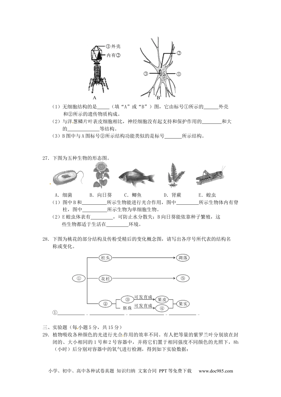 小学、初中、高中各种试卷真题知识归纳文案合同PPT等免费下载www.doc985.com2013年长沙市初中毕业学业水平考试试卷生物注意事项:1、答题前,请考生先将自己的姓名、准考证号填写清楚,并认真核对条形码上的姓名、准考证号、考室和座位号;2、必须在答题卡上答题,在草稿纸、试题卷上答题无效;3、答题时,请考生注意各大题题号后面的答题提示;4、请勿折叠答题卡,保持字体工整、笔迹清晰、卡面清洁;5、答题卡上不得使用涂改液、涂改胶和贴纸;6、本学科试卷共四道大题,考试时量60分钟,满分100分。一、单项选择题(每小题2分,共50分)1.爱护花草树木是每个人的责任和义务。树木属于生态系统中的A.非生物部分B.生产者C.消费者D.分解者2.芦山地震导致部分地区山体滑坡,许多动植物被掩埋死亡。这一事例说明A.生物适应环境B.生物影响环境C.环境影响生物D.环境适应生物3.某同学用放大5倍目镜与10倍物镜组合观察到了一只清晰的草履虫,这时显微镜的放大倍数是A.5倍B.10倍C.50倍D.15倍4.有人将100粒黄豆均分为两组,一组在黑暗条件下培养,一组在有光条件下培养,其他条件相同且适宜,结果都正常萌发,说明黄豆萌发的必需条件不包括A.充足的阳光B.一定的水分C.适宜的温度D.种子是活的5.下列有关呼吸作用的叙述不正确的是A.呼吸作用分解有机物B.呼吸作用合成有机物C.呼吸作用一般生成二氧化碳D.呼吸作用释放能量6.学习了根的相关知识后,你认为下列说法不正确的是A.根尖的成熟区能吸收水和无机盐B.根尖的分生区细胞能分裂C.根的导管能运输有机物D.移栽植物要注意保护幼根和根毛7.常听小朋友说“我是从妈妈的肚子里生出来的”。胎儿孕育的场所是A.输卵管B.子宫C.胎盘D.卵巢8.矿工被困井下,下列物质中对其维持生命很重要,但又不能提供能量的是A.水B.糖类C.脂肪D.蛋白质9.“吃饱了”一般是指人体消化道的哪个器官中有较多的食物A.食道B.胃C.大肠D.口腔10.湖南卫视热播节目“中国最强音”很受青少年喜欢。下列器官不会直接影响歌手发声的是A.鼻B.喉C.肺D.食道11.糖尿病人的尿液中一般不会含有A.血细胞B.葡萄糖小学、初中、高中各种试卷真题知识归纳文案合同PPT等免费下载www.doc985.comC.无机盐D.尿素12.某人煤气中毒,从肺吸入的一氧化碳会首先进入心脏的A.左心房B.左心室C.右心房D.右心室13.听到班长喊“起立”,同学们立刻站起来。这种反应属于A.复杂反射B.简单反射C.激素调节D.反射弧14.为了预防近视,下列做法错误的是A.认真做眼保健操B.下课后到室外远眺几分钟C.读写姿势要正确D.边走路边看书15.下列动物行为属于学习行为的是A.亲鸟喂食B.青蛙抱对C.蜜蜂采蜜D.公鸡绕道取食16.很多长沙人爱吃“酸辣米粉”,其中的酸菜制作需要利用哪种微生物A.酵母菌B.乳酸菌C.青霉D.枯草杆菌17.研究人员将胡萝卜素基因转移到水稻细胞内,生产出了“黄金大米”,这种生物技术属于A.仿生B.嫁接C.转基因D.发酵18.生物多样性是我们赖以生存和发展的基础,生物多样性的内涵不包括A.基因的多样性B.生物种类的多样性C.生态系统的多样性D.环境的多样性19.受精的鸡卵中,将来可以发育成雏鸡的是A.卵黄B.卵白C.卵壳D.胚盘20.下列对生物进化总体趋势的描述不正确的是A.由复杂到简单B.由简单到复杂C.由水生到陆生D.由低等到高等21.感染H7N9病毒的人属于传染病流行三个基本环节中的A.传染源B.传播途径C.病原体D.易感人群22.注射某种疫苗使人体获得的免疫属于A.非特异性免疫B.抗体C.淋巴细胞D.特异性免疫23.某同学在一次运动会上摔倒,导致前臂骨折,对其进行急救时不需要A.拨打120B.联系家长,告知病情C.尽快到医院就诊D.进行胸外心脏挤压24.下列做法属于健康生活方式的是A.中餐经常吃方便面B.经常在路边摊买油炸食品吃C.每天锻炼一小时D.经常长时间上网25.中学生的下列做法不符合建设资源节约、环境友好型社会的是A.饭菜吃多少买多少,不浪费B.不乱扔垃圾,爱护环境卫生C.吃饭常用一次性餐具D.保护鸟类等野生动物二、识图作答题(每小题5分,共15分)26.下图为神经细胞和噬菌...